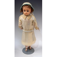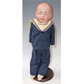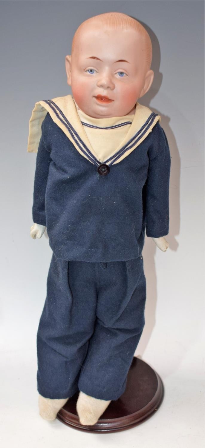 A Gebruder Knoch sailor boy shoulder doll, moulded bisque head, painted blue eyes, smirking mouth, painted hair, stuffed leather body, blue sailor boy outfit, impressed crossed bones GRN marks,295 Gesiche, Made in Germany, 6 / 0 A, approx 42cm long