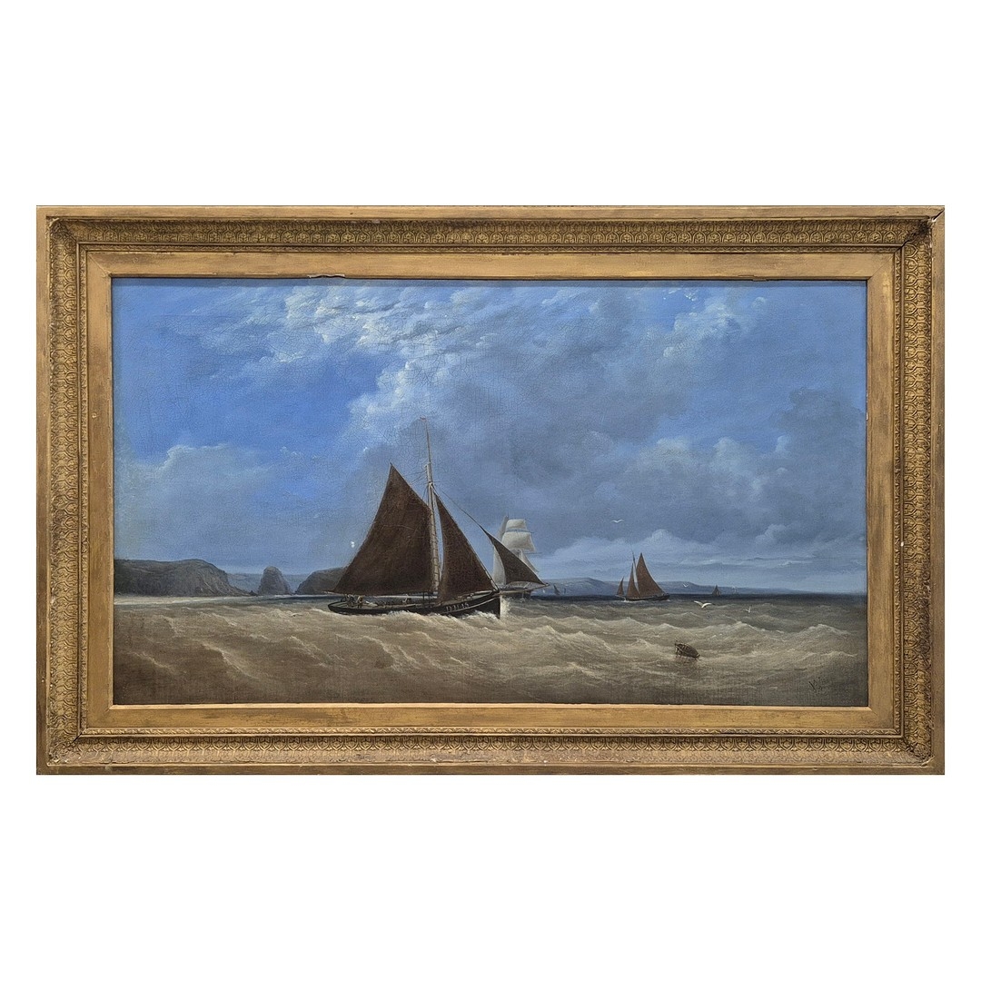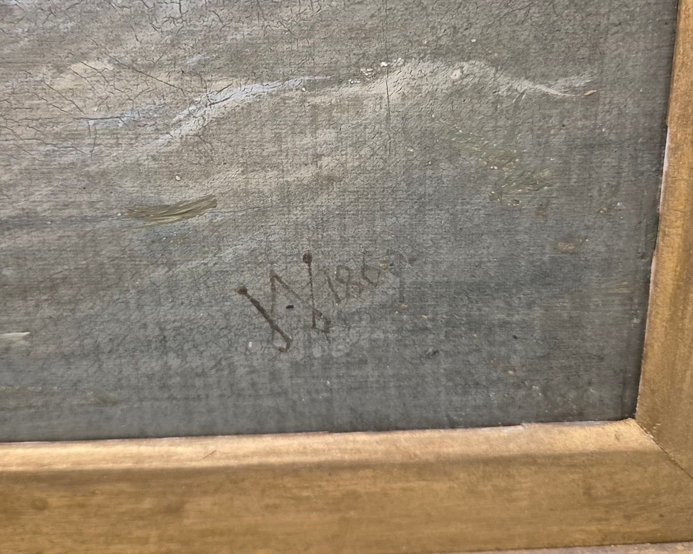 19TH CENTURY BRITISH SCHOOL. SHIPS IN A STORMY SEA. oil on canvas, indistinctly signed and dated 1869, 81cm x 126cm, framed.
