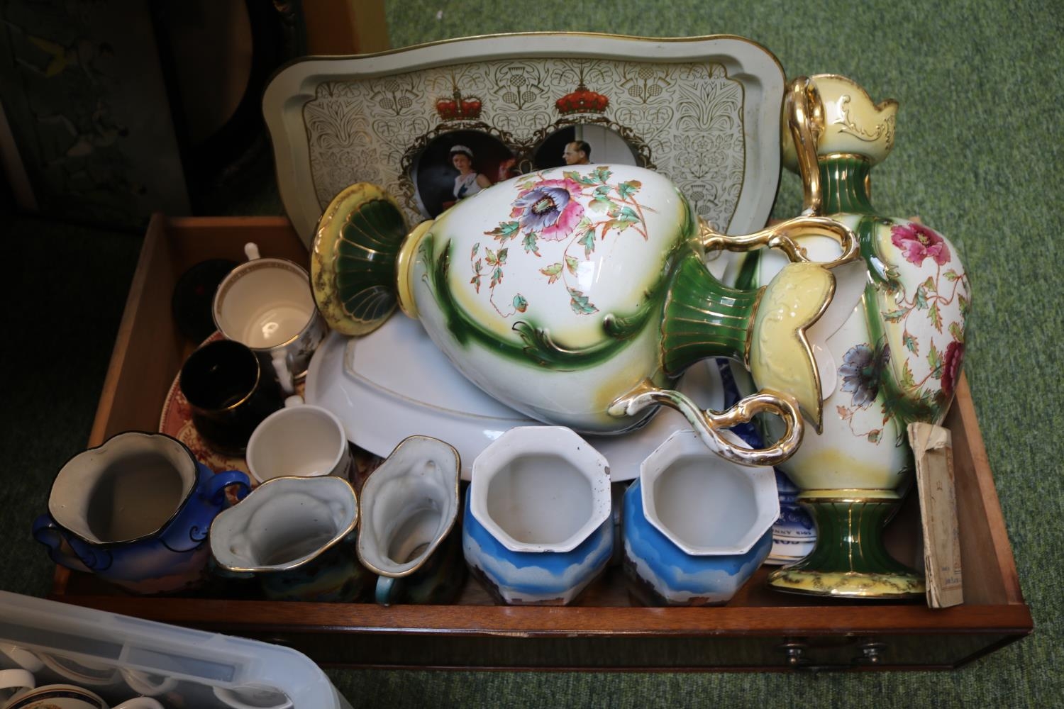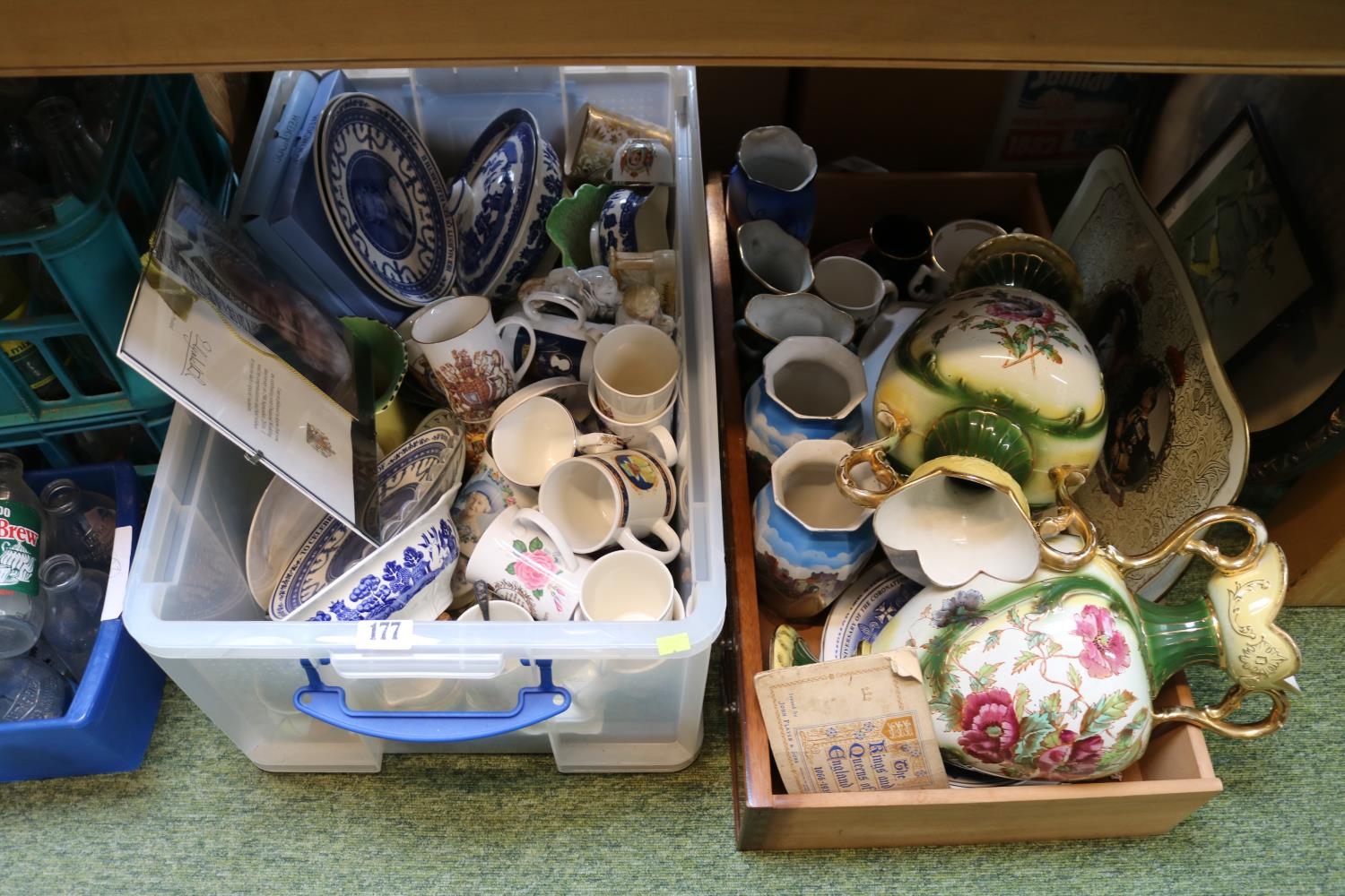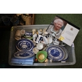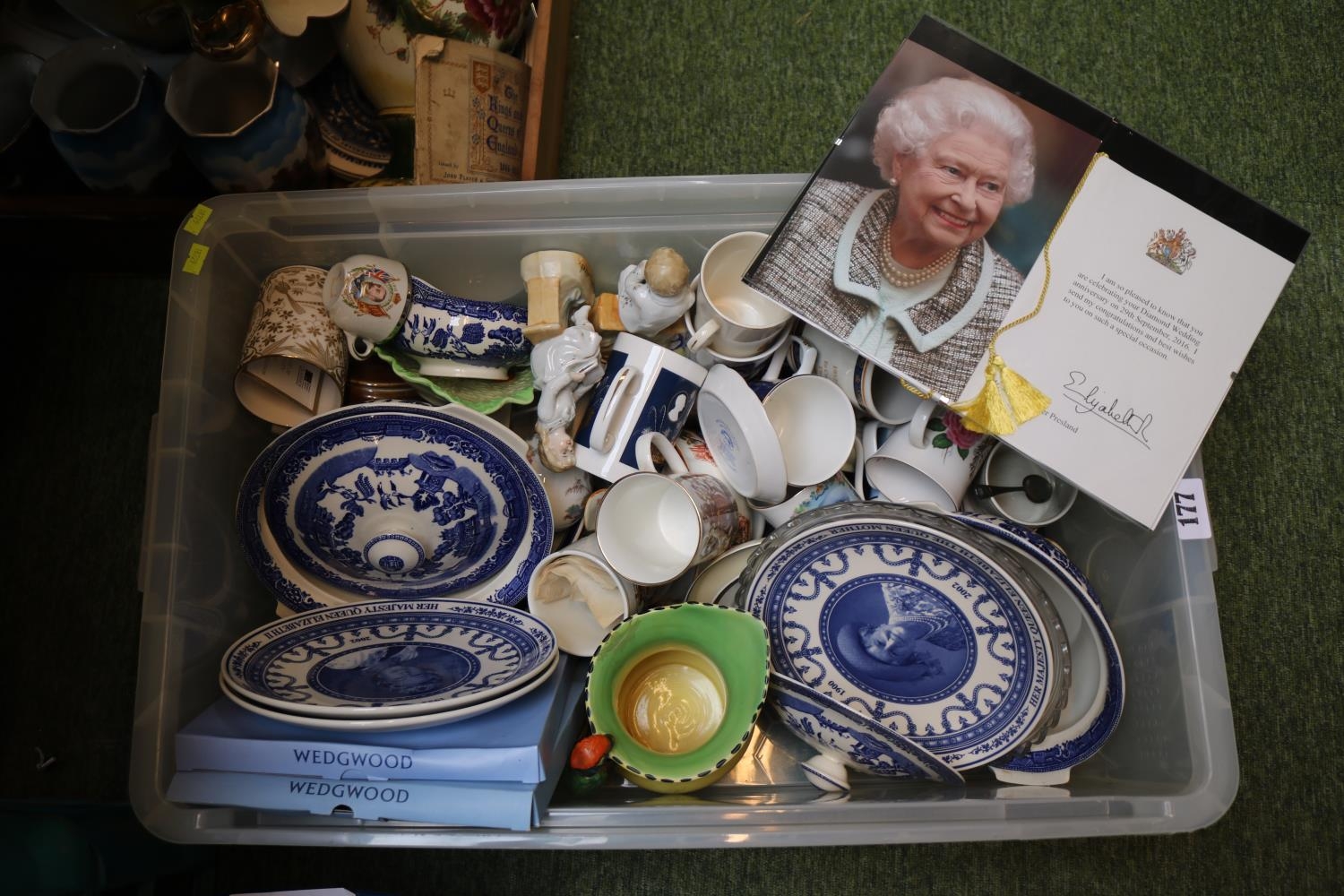 Collection of assorted Ceramics to include Royal Commemorative, Willow Pattern etc and a Queen Elizabeth II Congratulation's letter and a further box of assorted ceramics