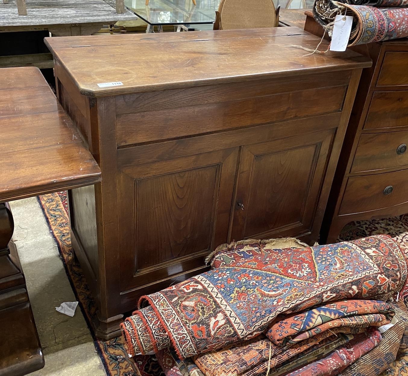 A 19th century French provincial oak hinged top side cabinet, width 107cm, depth 50cm, height 98cm