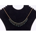 Yellow metal (tests 15ct) turquoise and seed pearl graduated fringe necklace on later 9ct yellow gold curb chain, forty two graduated round turquoise cabochons and twenty one seed pearls, length 58cm, weight 11.9g