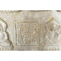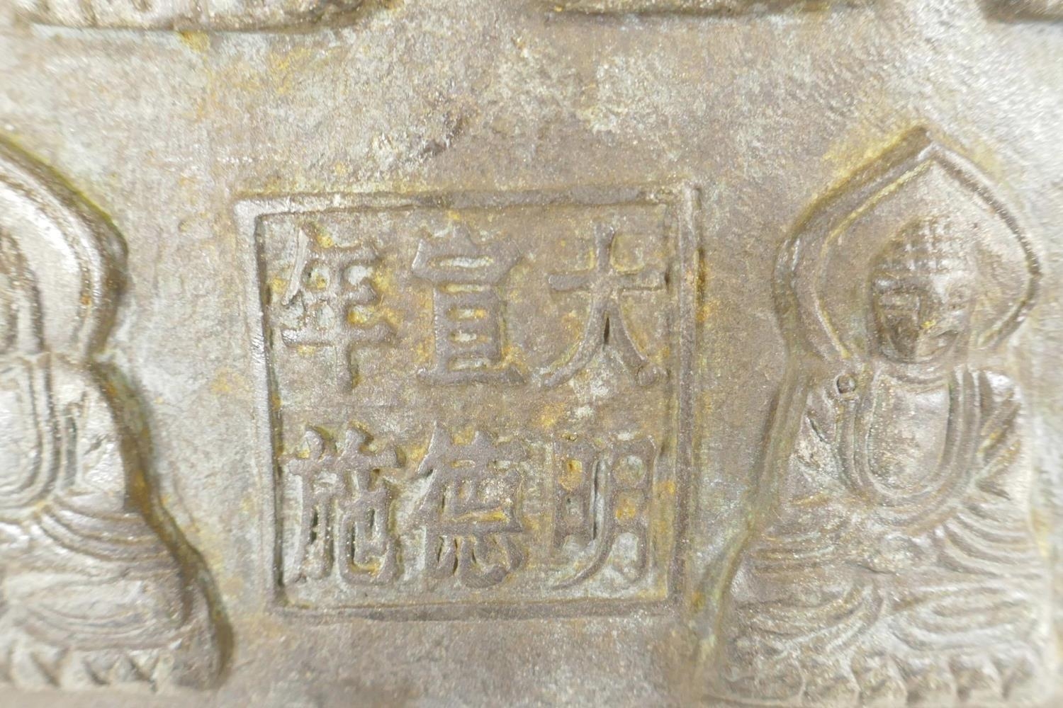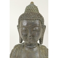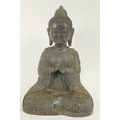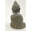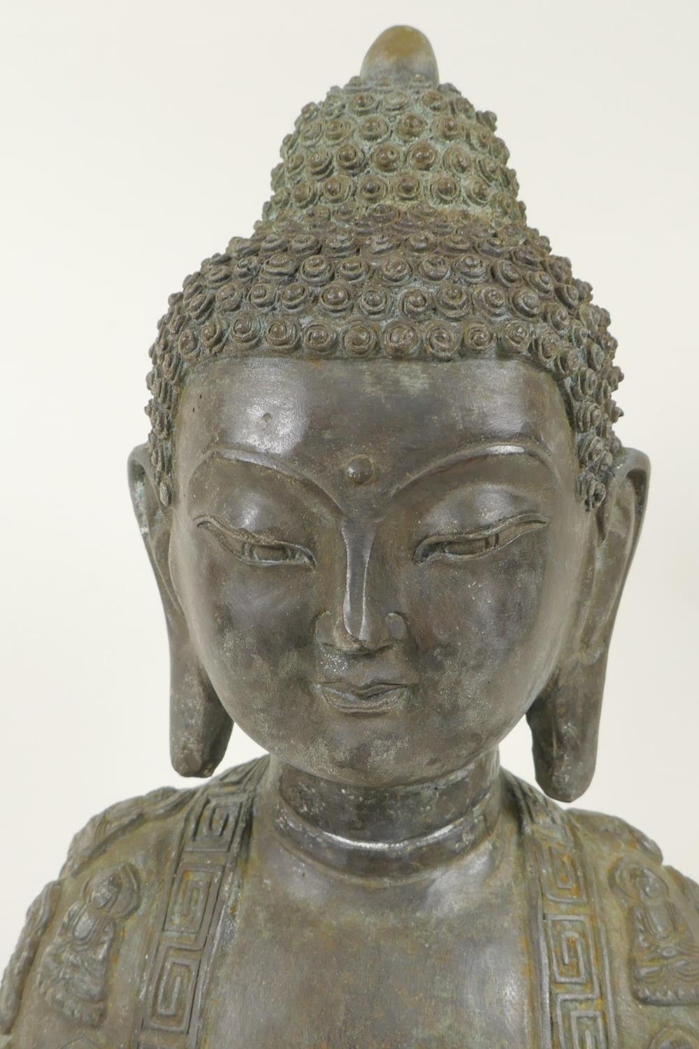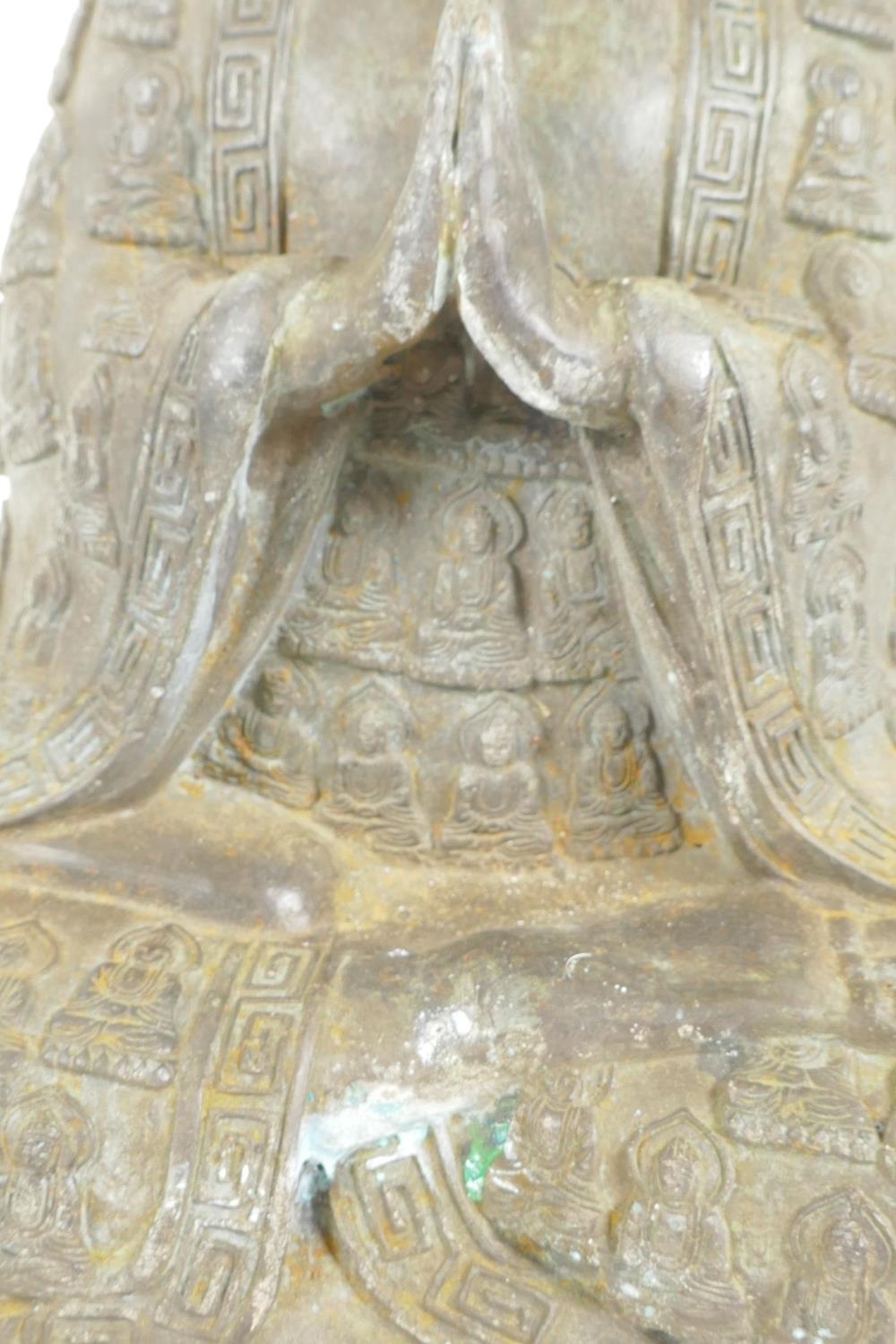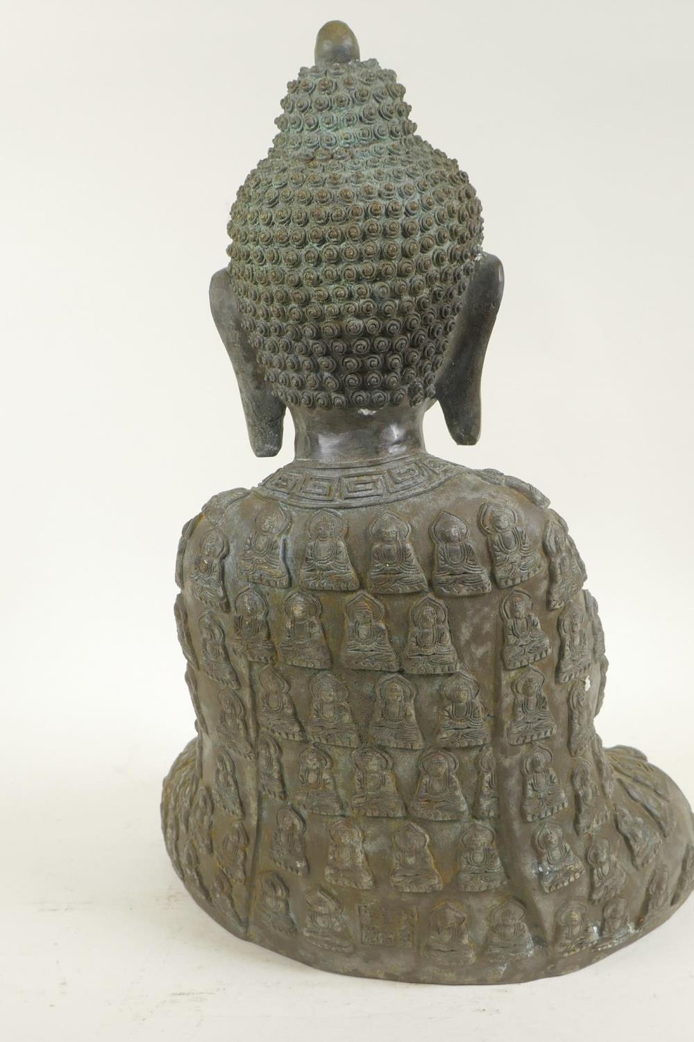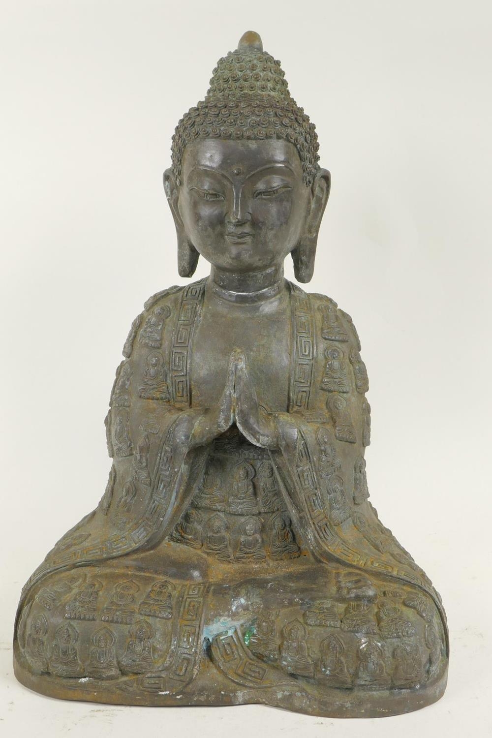 A good Chinese bronze figure of Buddha seated in meditation, his clothing moulded with Buddha figures and cast 6 character mark to back, 16" high