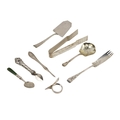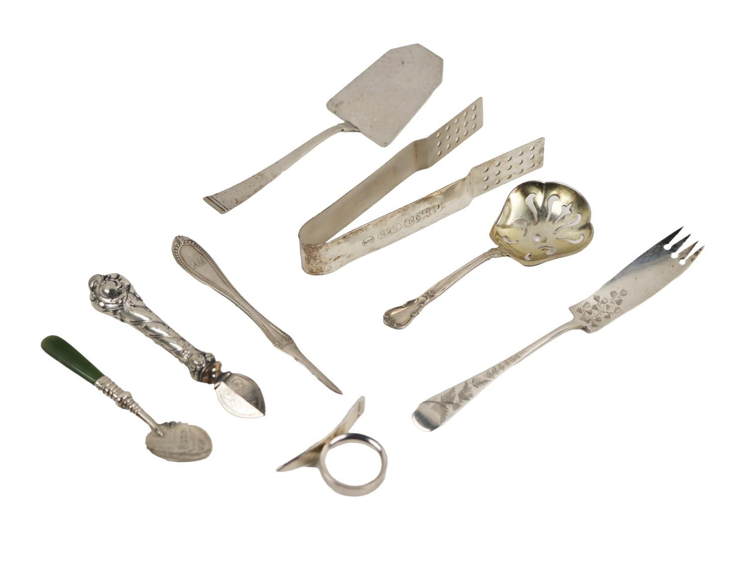 Silverware: An English silver Orange Peeler, London, E.P. Degavino, 2003; an agate handled and leaf shaped silver Jam Spoon, Birmingham, Adie & Lovekin Ltd., 1911; an early 20th Century German silver Wax Seal Lifter, c. 1910; an English silver tea bag Lifter Tongs, Birmingham, M.D. Yates & Sons, 2014; a Victorian leaf etched silver Butter Curler, London, Josiah Williams & Co., 1889; a small German silver Cake or Pastry Lift with shaped shovel, c. 1970; a Victorian period American 'Nut Pick' Canefield Bro. & Co. 1832-45; an American silver pierced and decorated 'Bon Bon' Spoon, c. 1910, as a lot. (8)