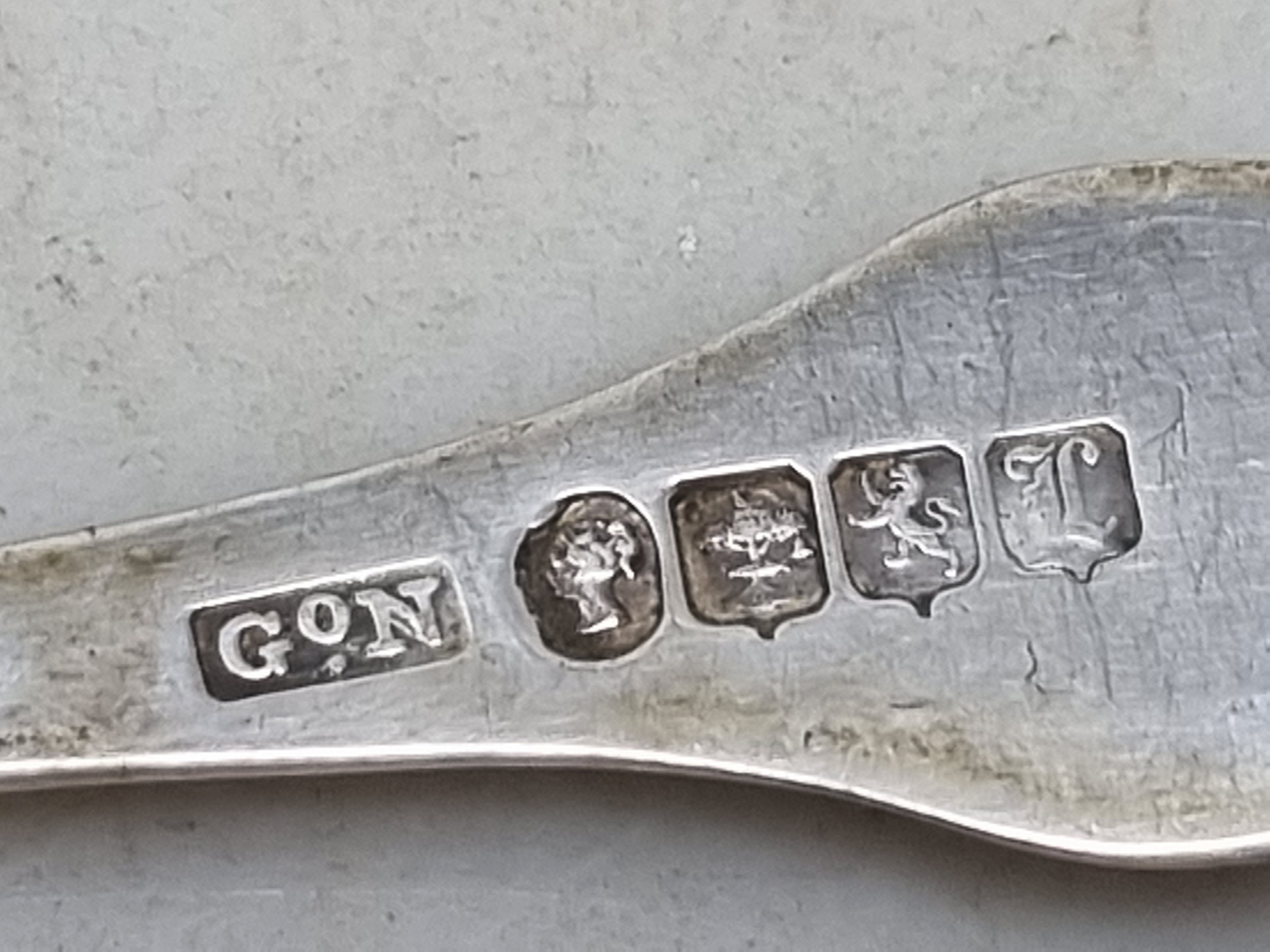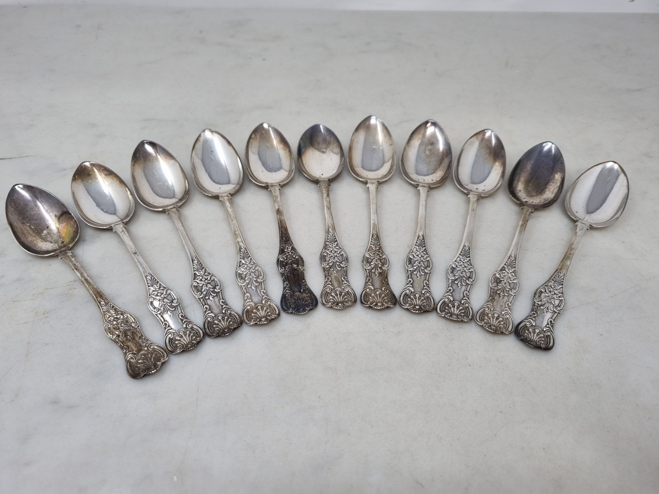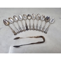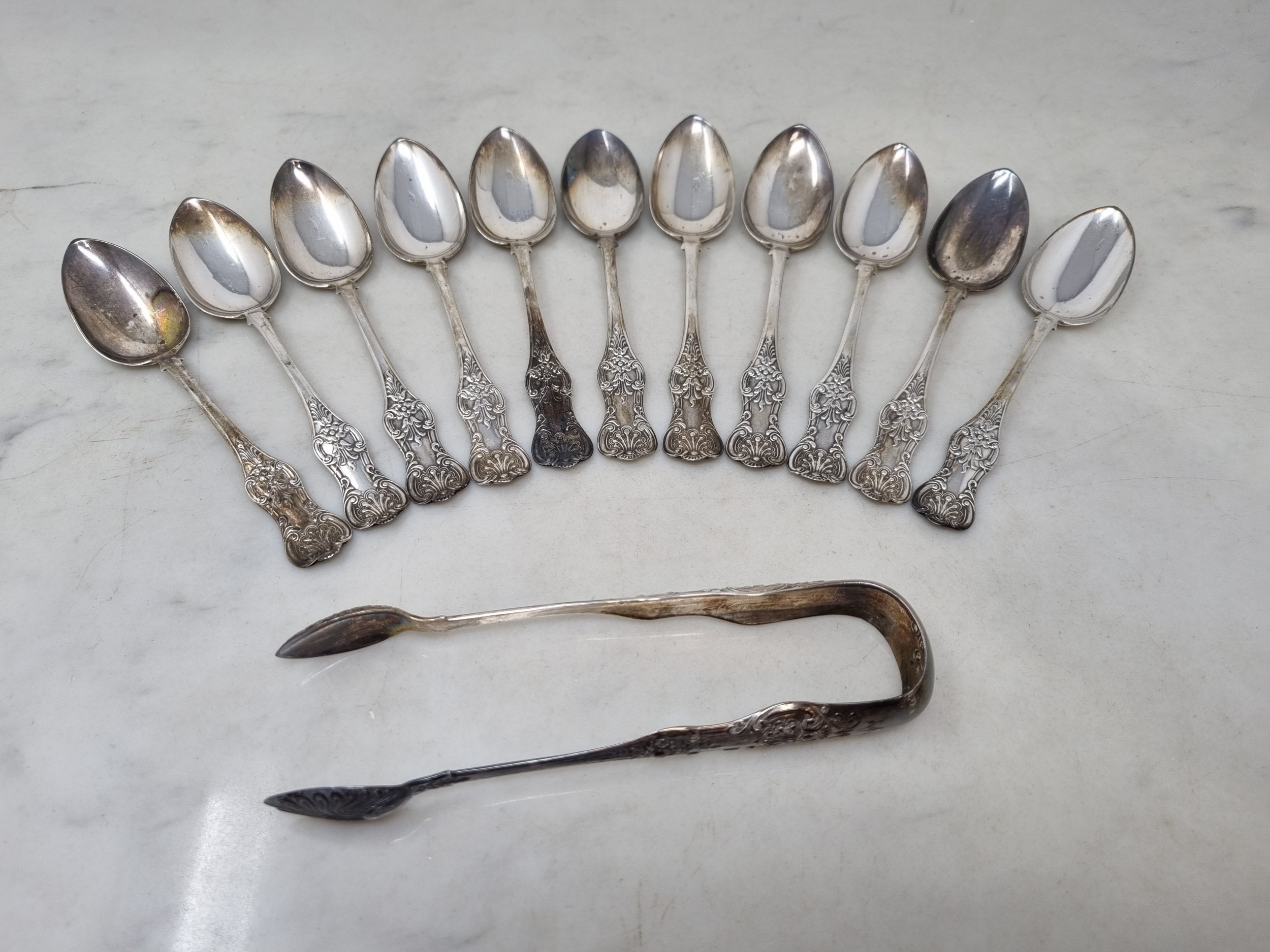 Eleven Victorian Scottish silver Teaspoons and Sugar Tongs queens pattern, Edinburgh 1842, maker: GoN, 230gms