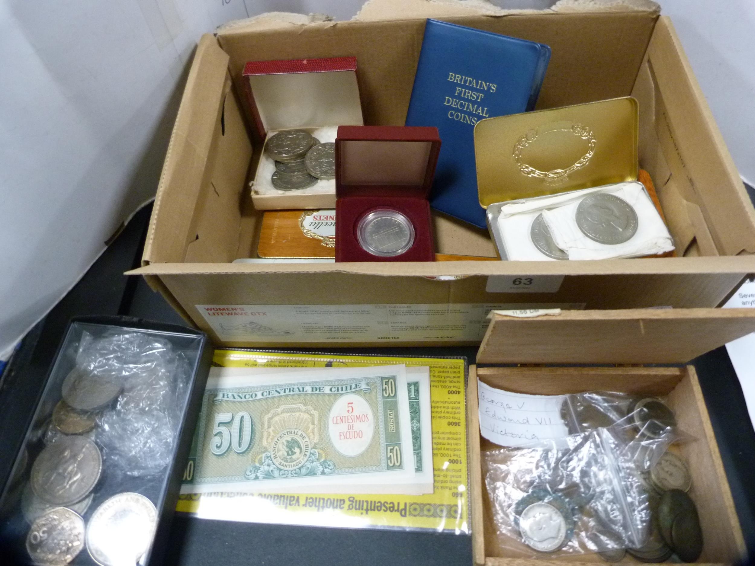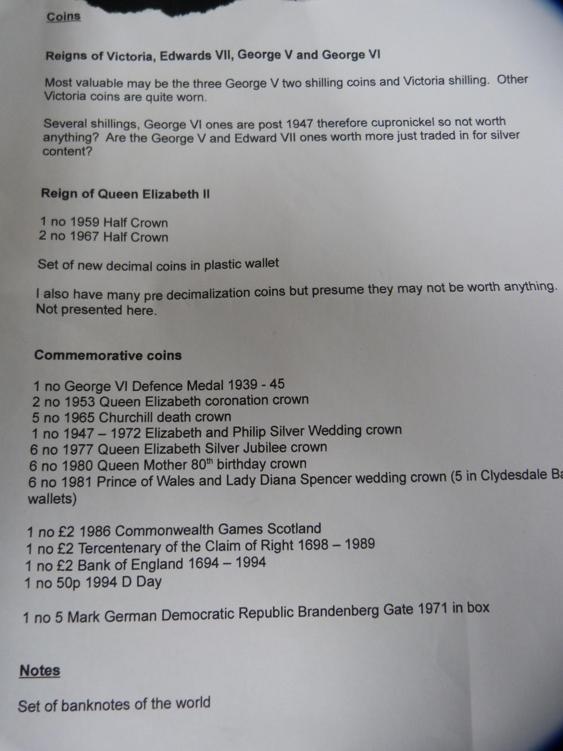 Coins and banknotes to include Victorian and later coinage, half crowns, commemorative coins, George VI Defence medal, Commonwealth Games £2 coin etc.
