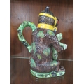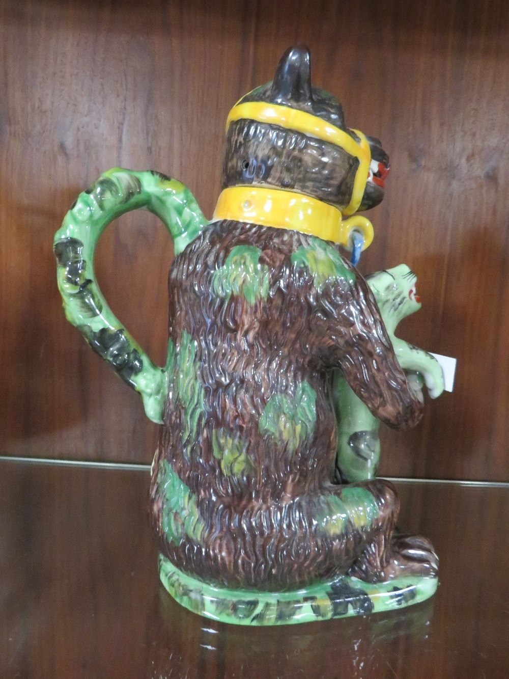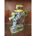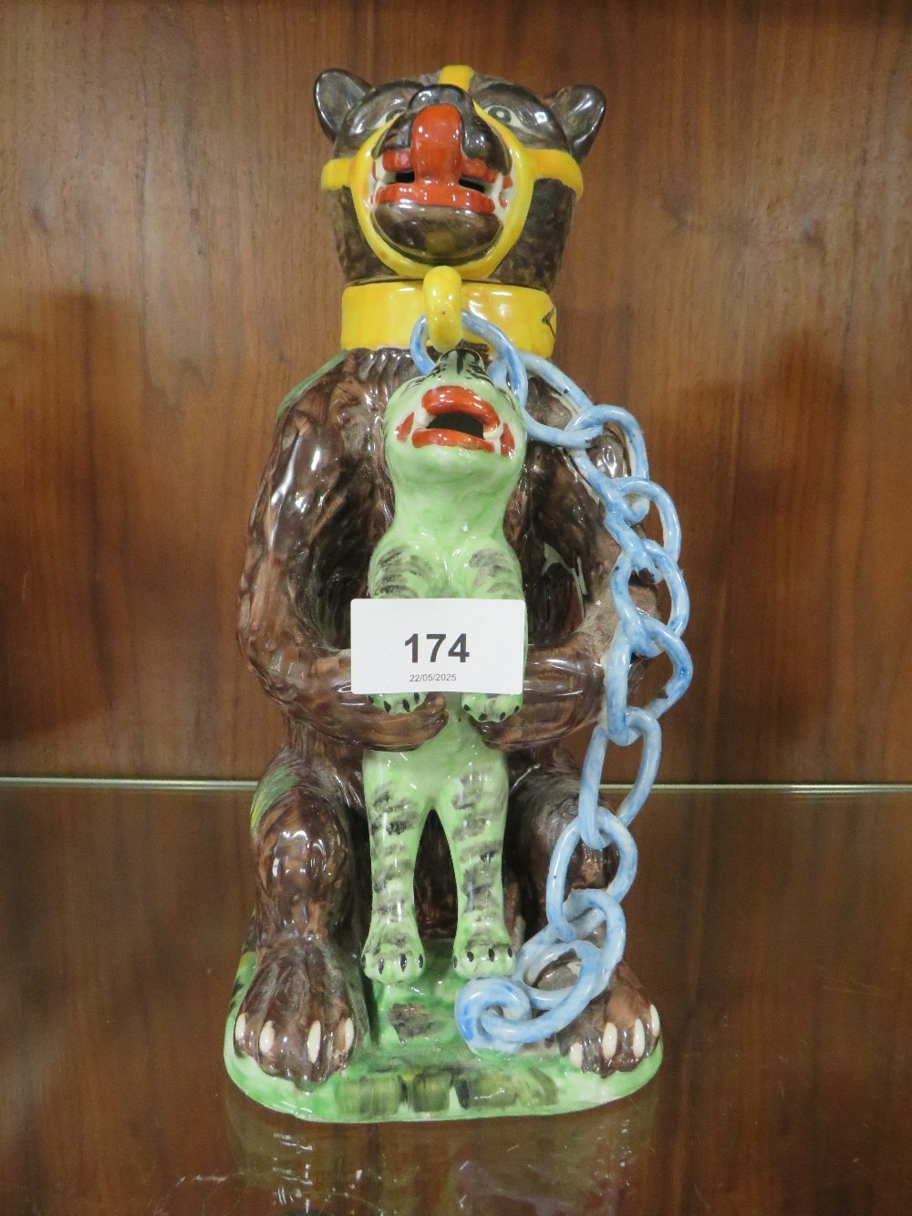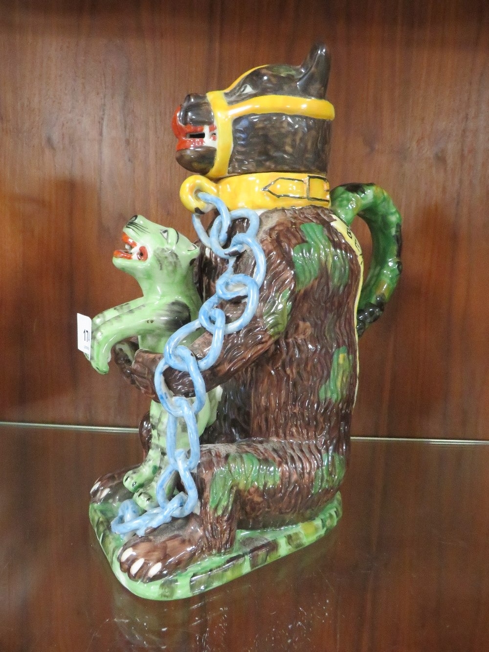 A reproduction bear grease jug - the leopard coloured green with blue chains