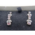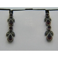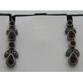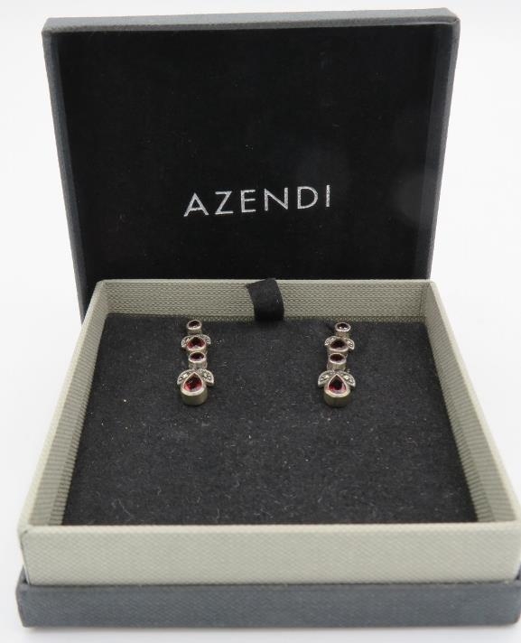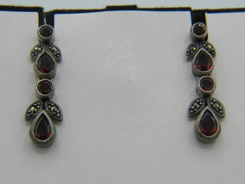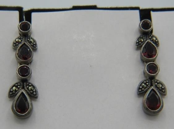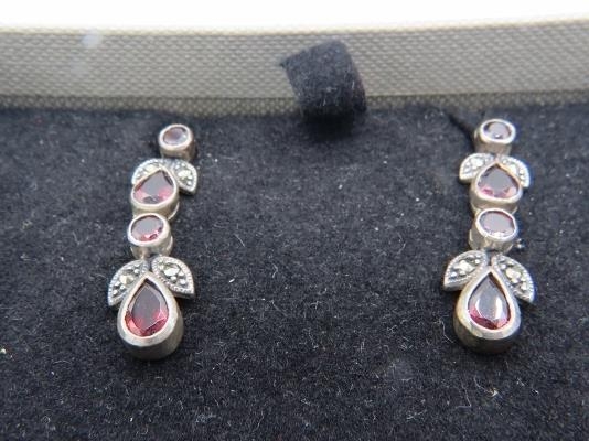 A pair of silver, garnet & marcasite drop earrings, 3cm drop, in branded Azendi box.