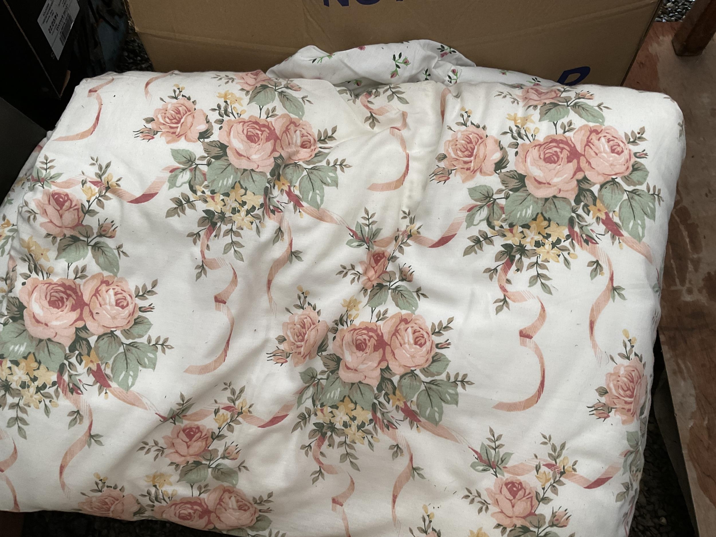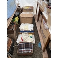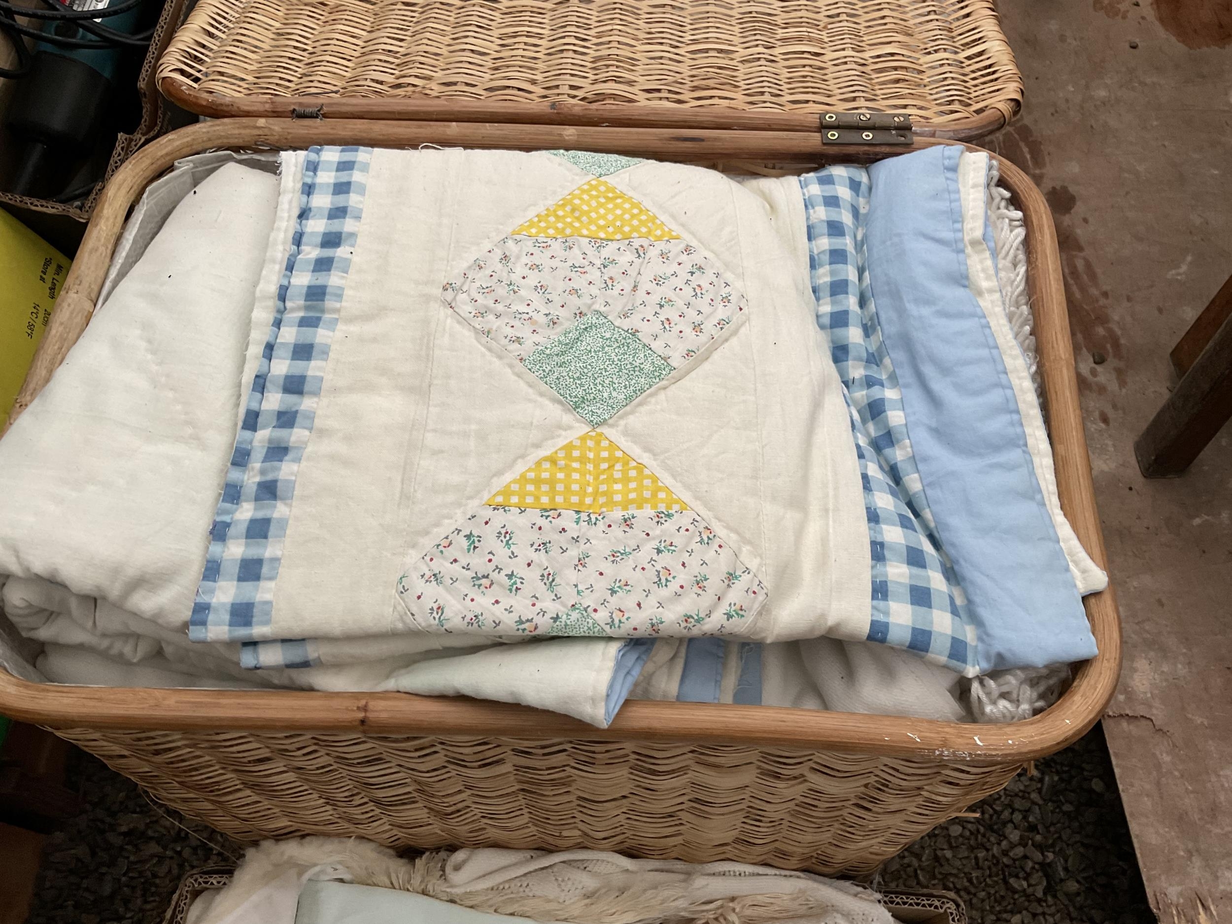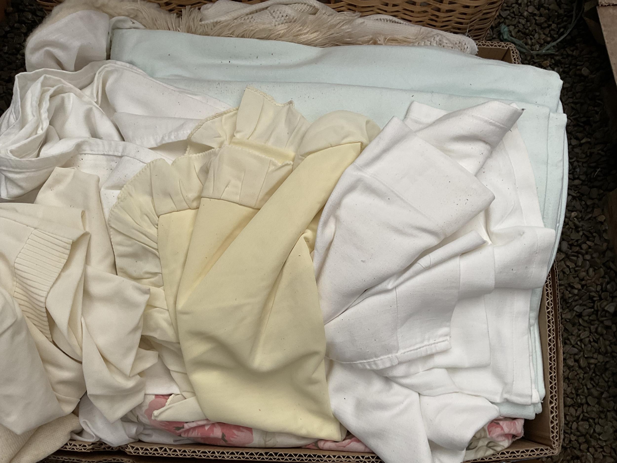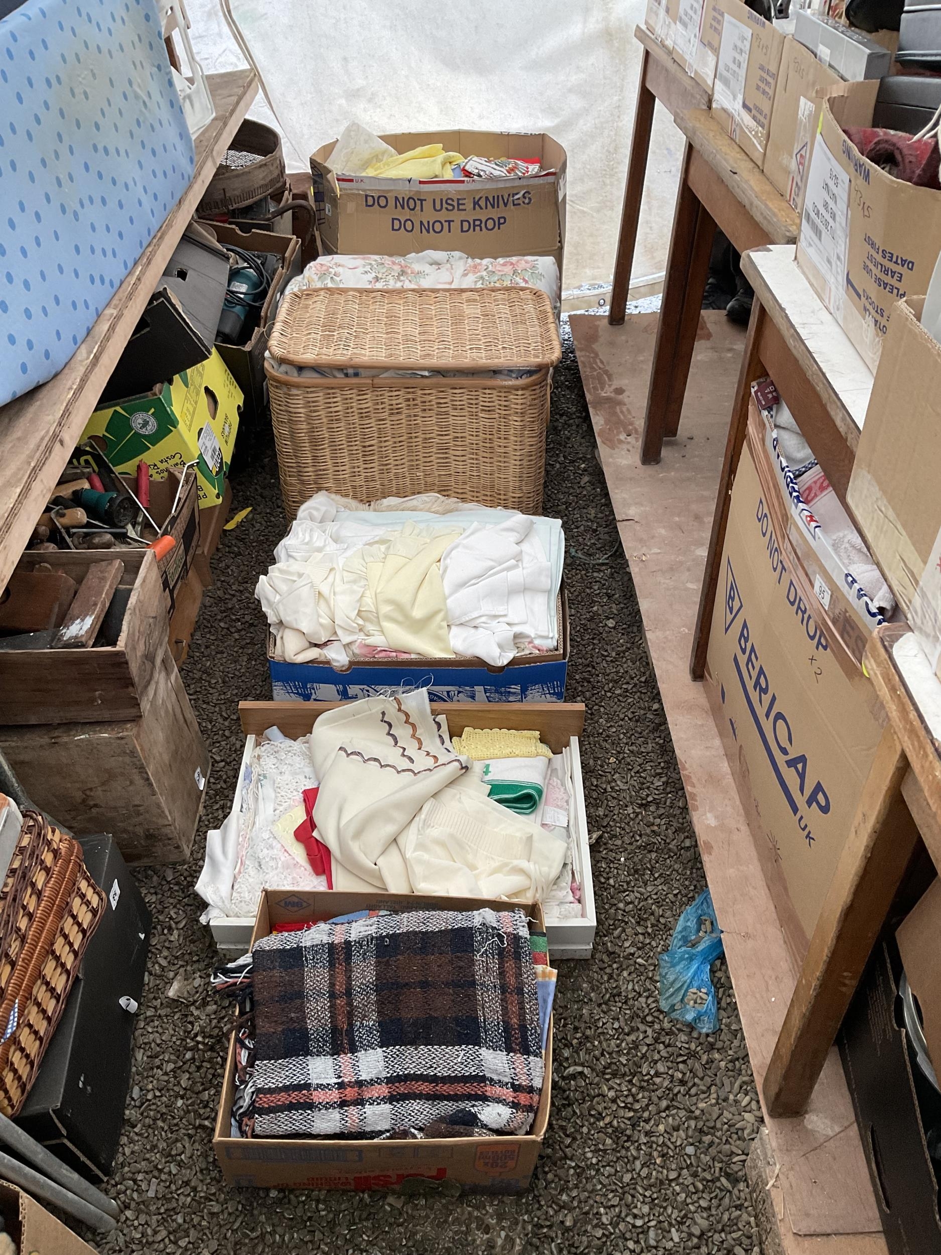 5 BOXES AND A LINEN BASKET OF BEDDING