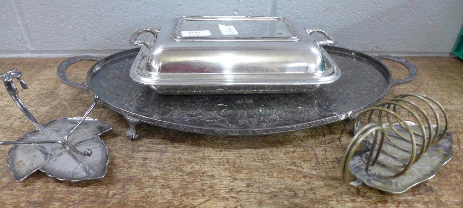 A plated tureen, tray, toast rack and dish stand **PLEASE NOTE THIS LOT IS NOT ELIGIBLE FOR POSTING AND PACKING**