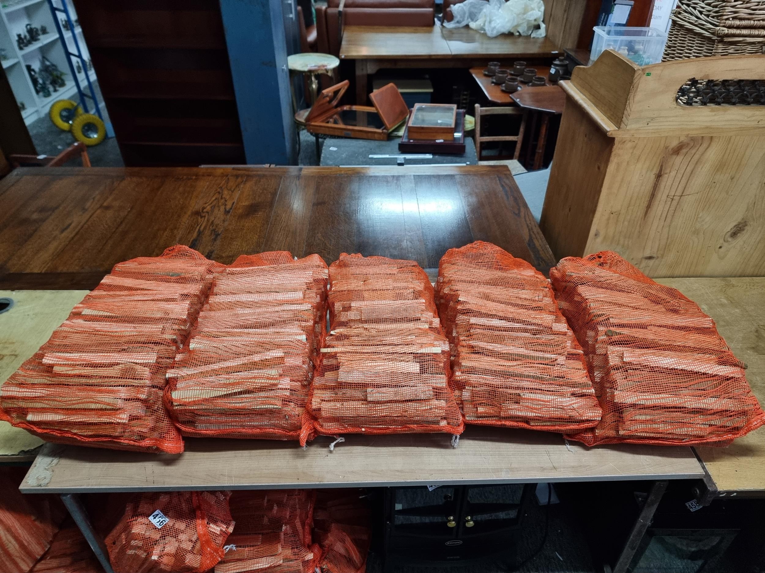 Quantity of 5x bags of kindling wood morning sticks in carrot bags, all full of seasoned wood, each bag weighs 7.9kg and measures 56cm long