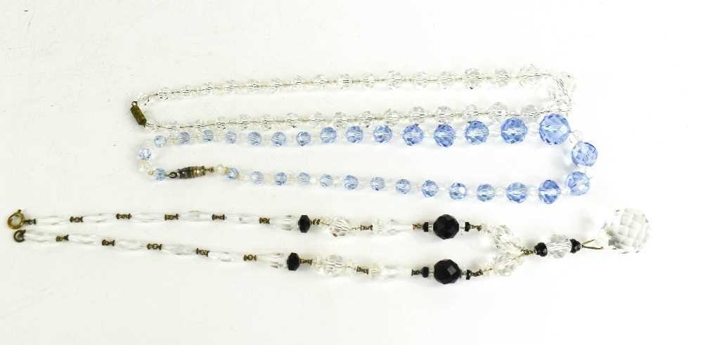 Three cut glass / crystal necklaces, one 1920s example composed of facet cut beads, clear and black, and two similarly composed examples circa 1930 in blue and clear both with screw-barrel clasps.