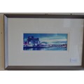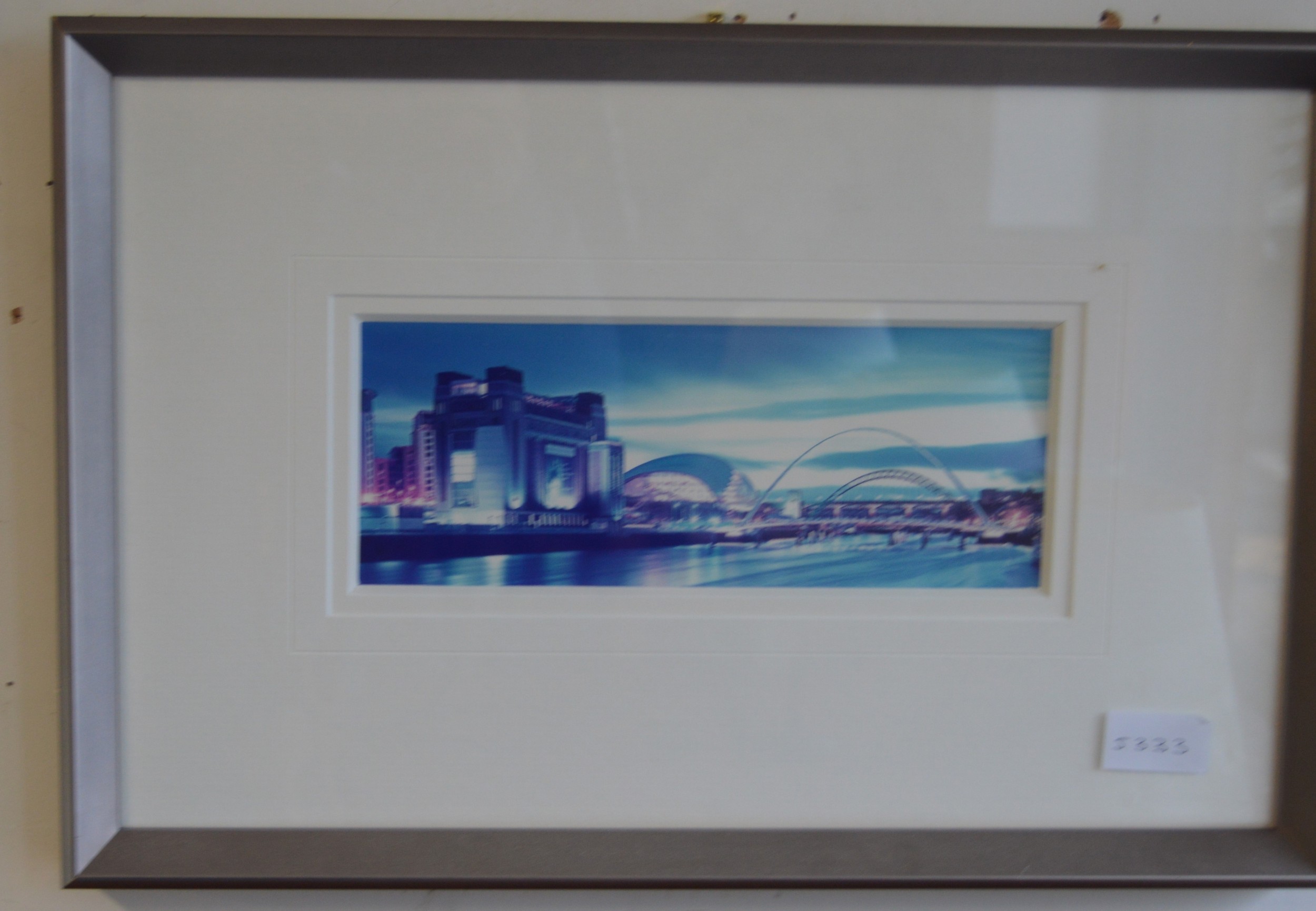 Framed, Mounted of a Glazed Panoramic Photographic Print of Newcastle-on-Tyne city's Quayside area at night, highlighted by vibrant blue and purple lighting. (Newcastle) - 18" x 12"