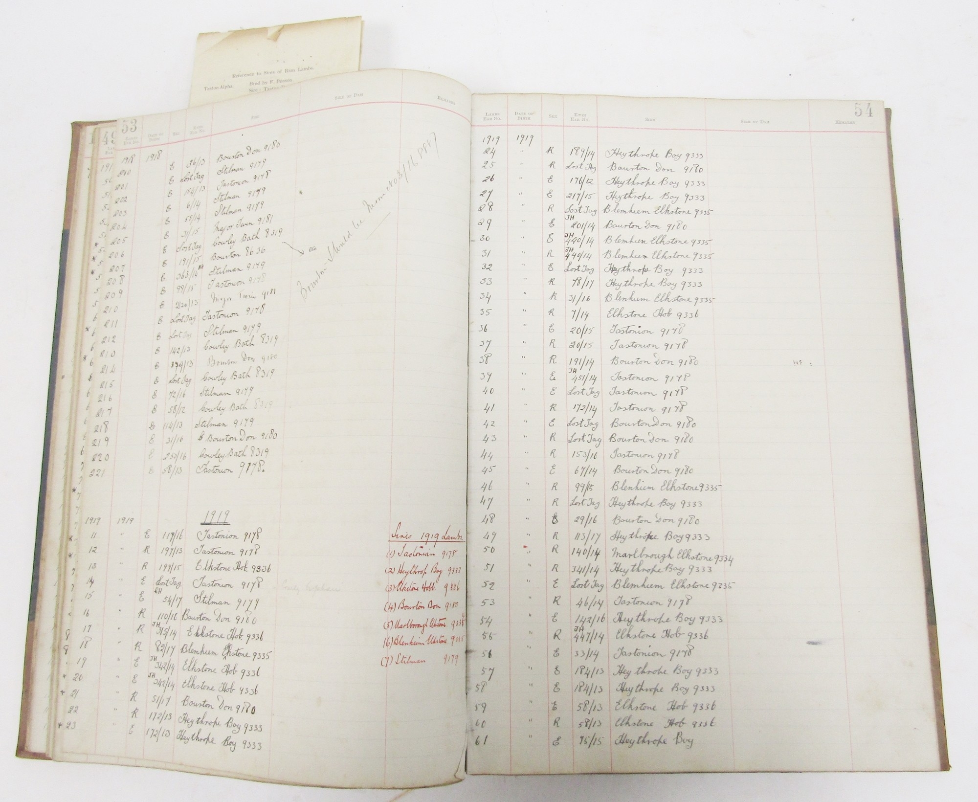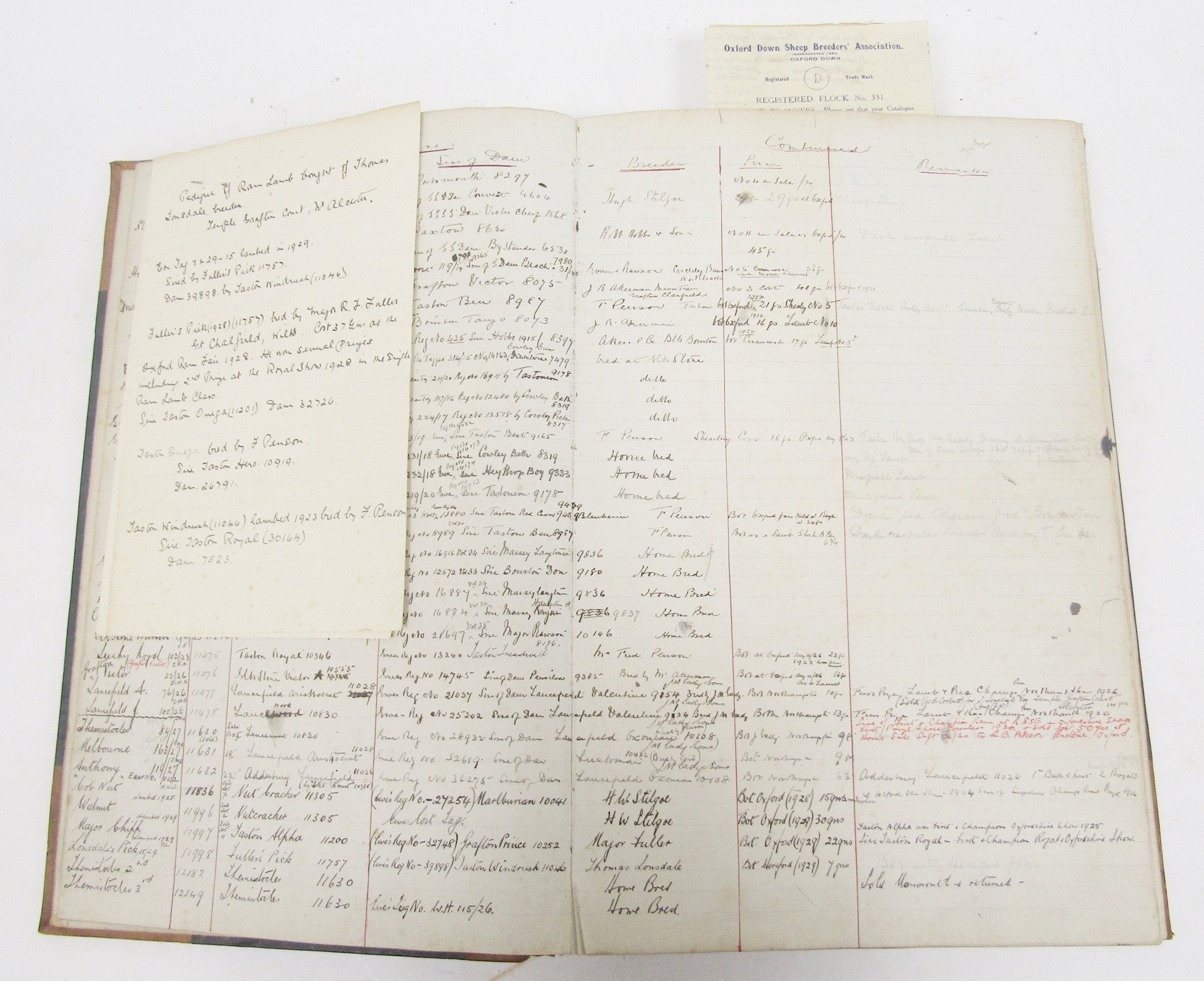 Early 20th century stock book ledger, leather bound and and canvas covered, partial filled with a registration of sheep ram sires dating from 1911 to 1930 together with three Oxford Ram Fair catalogues