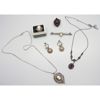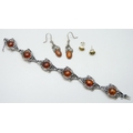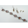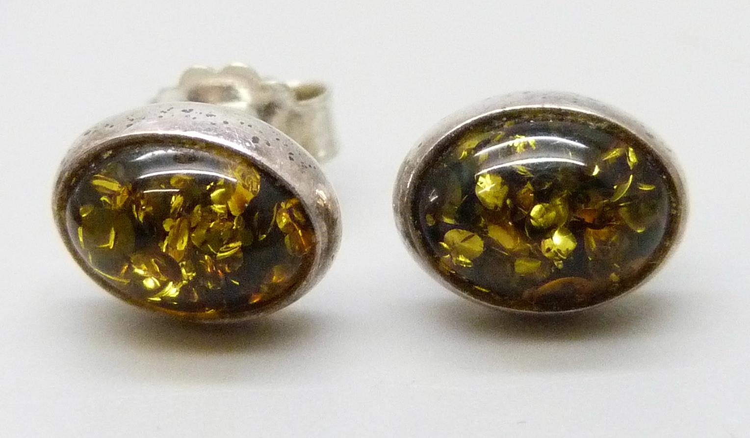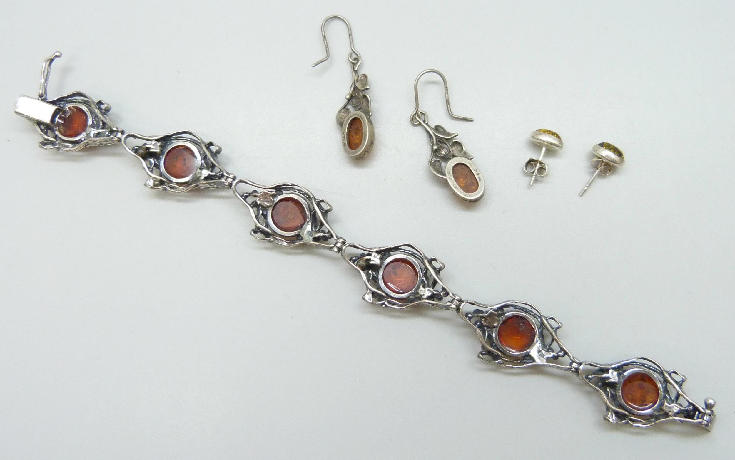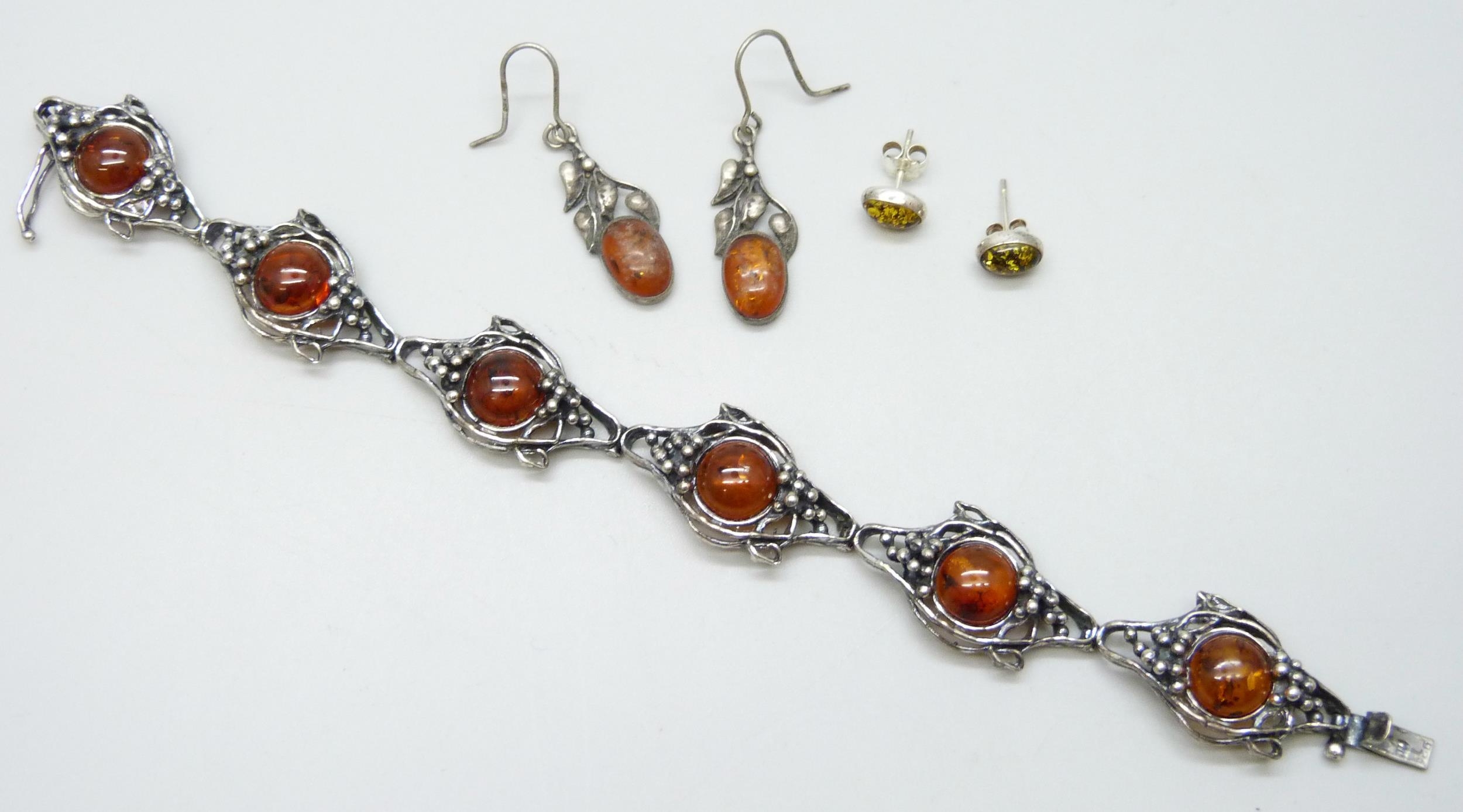 A silver and amber bracelet, 18.5cm, and two pairs of silver earrings, 30g