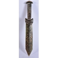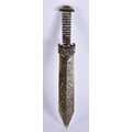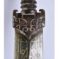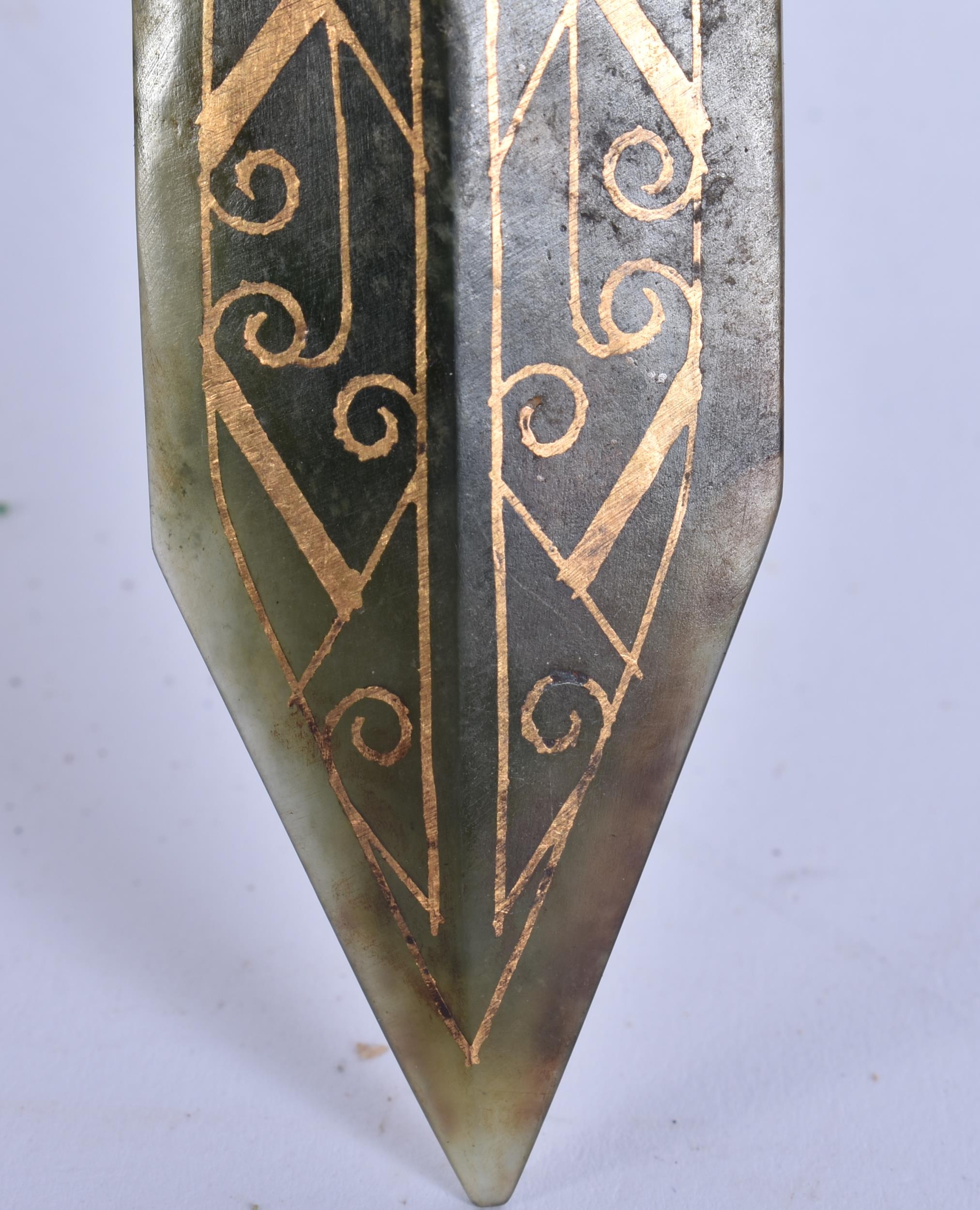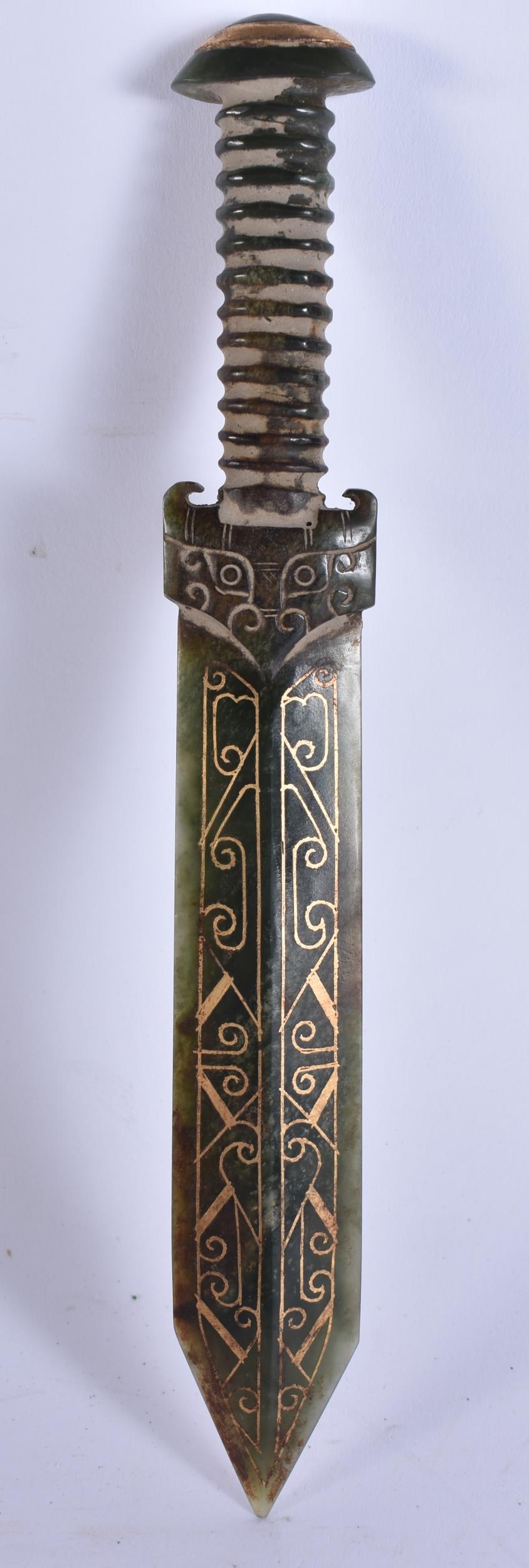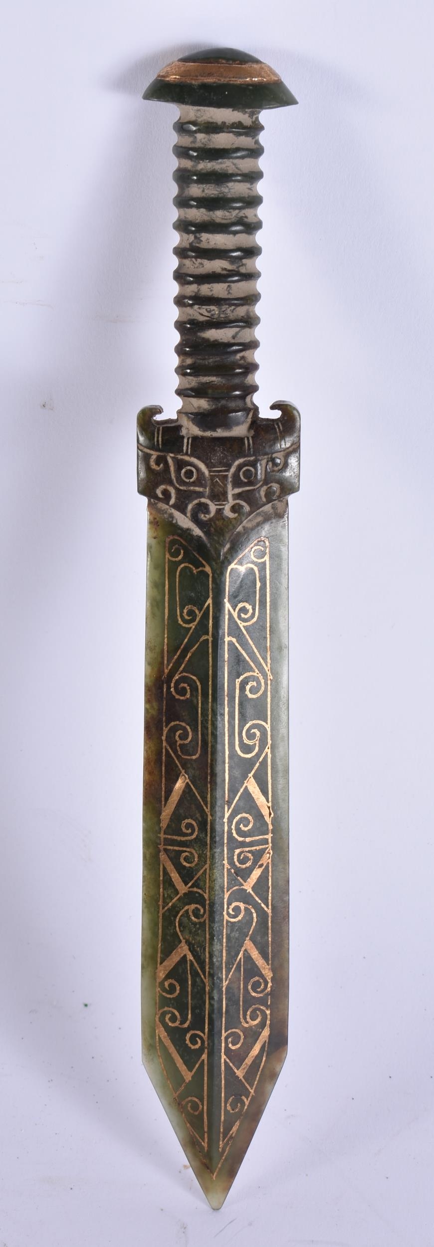 A CHINESE GOLD INLAID JADE KNIFE. 22 cm long. WE ARE UNABLE TO OFFER IN HOUSE SHIPPING ON THIS LOT