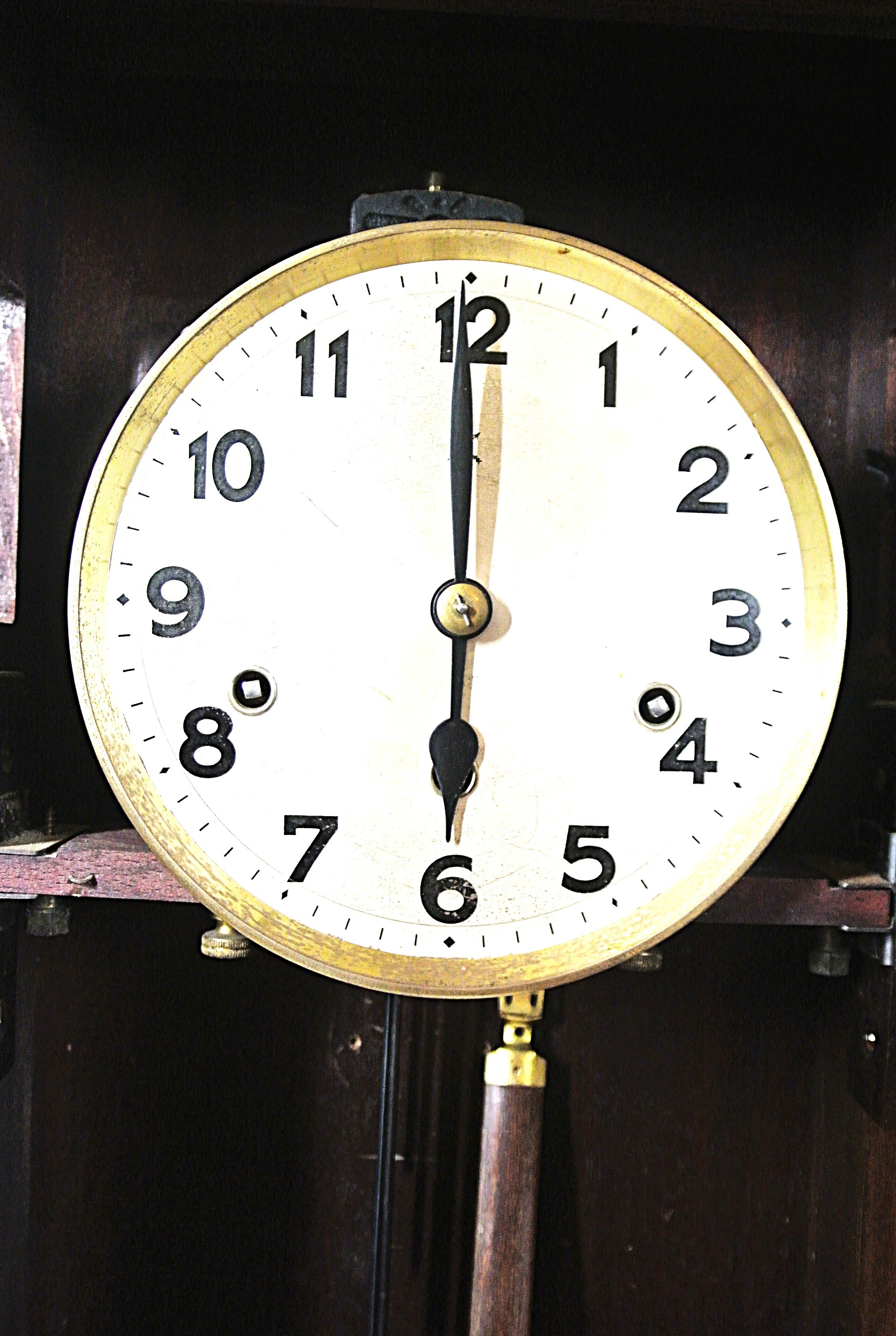 Edwardian style mahogany cased wall clock with brass framed dial and pendulum