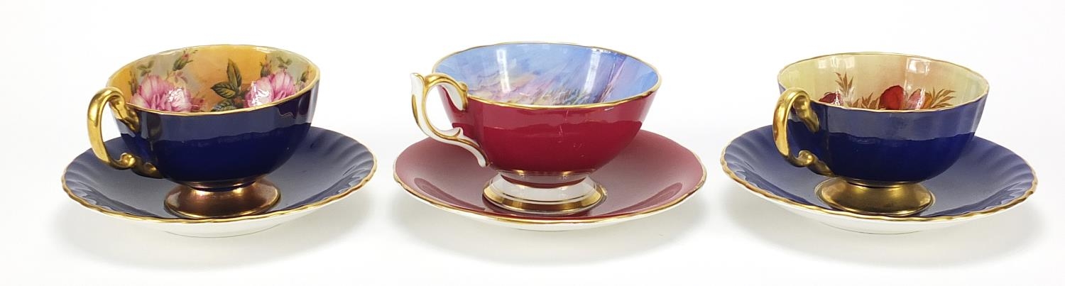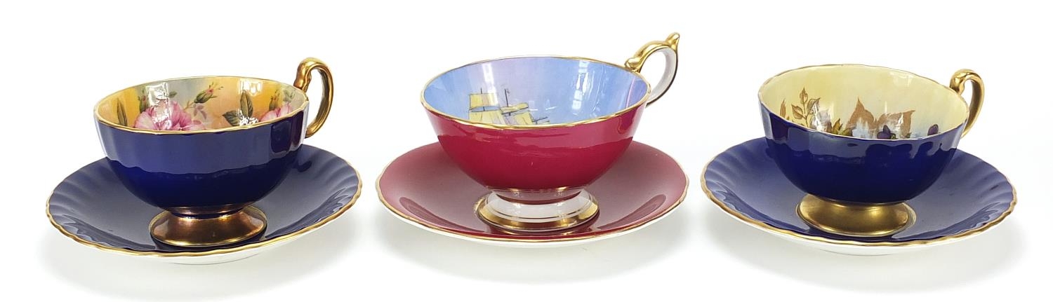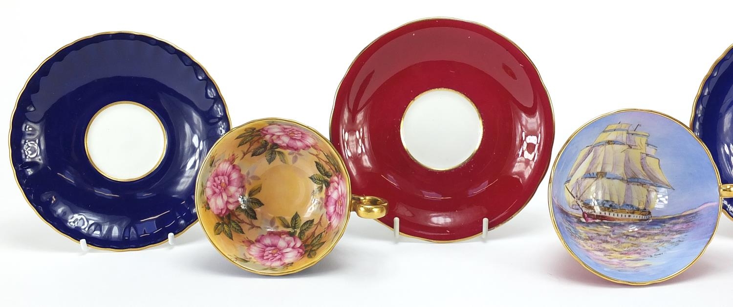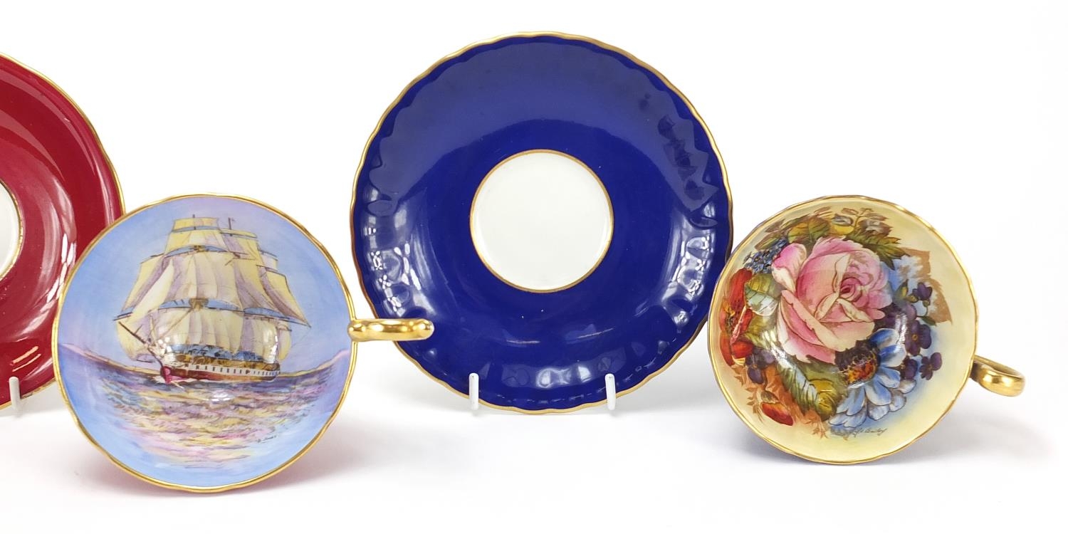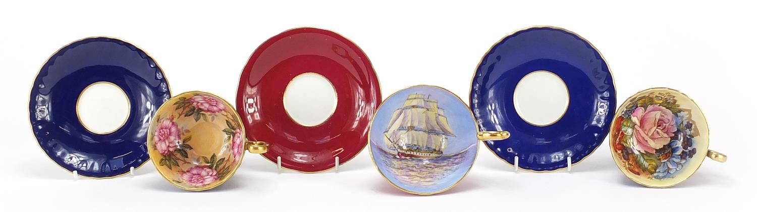 Three Aynsley cups and saucers including two hand painted with flowers and one decorated with a rigged ship signed D Jones, each cup 6cm high