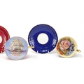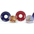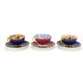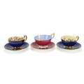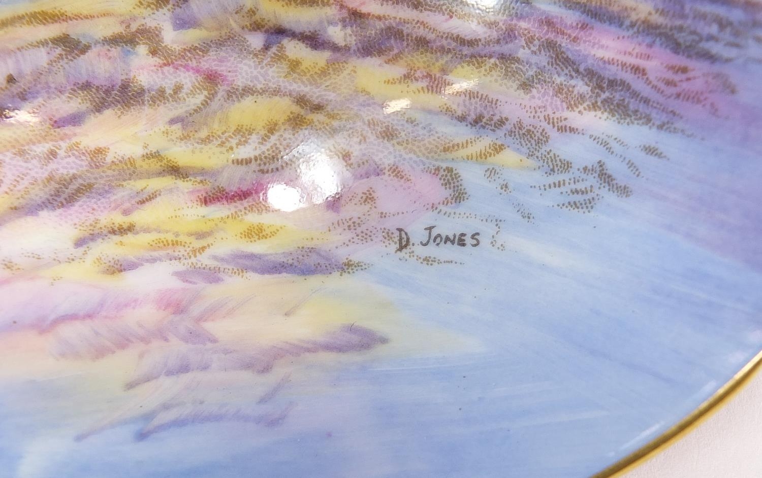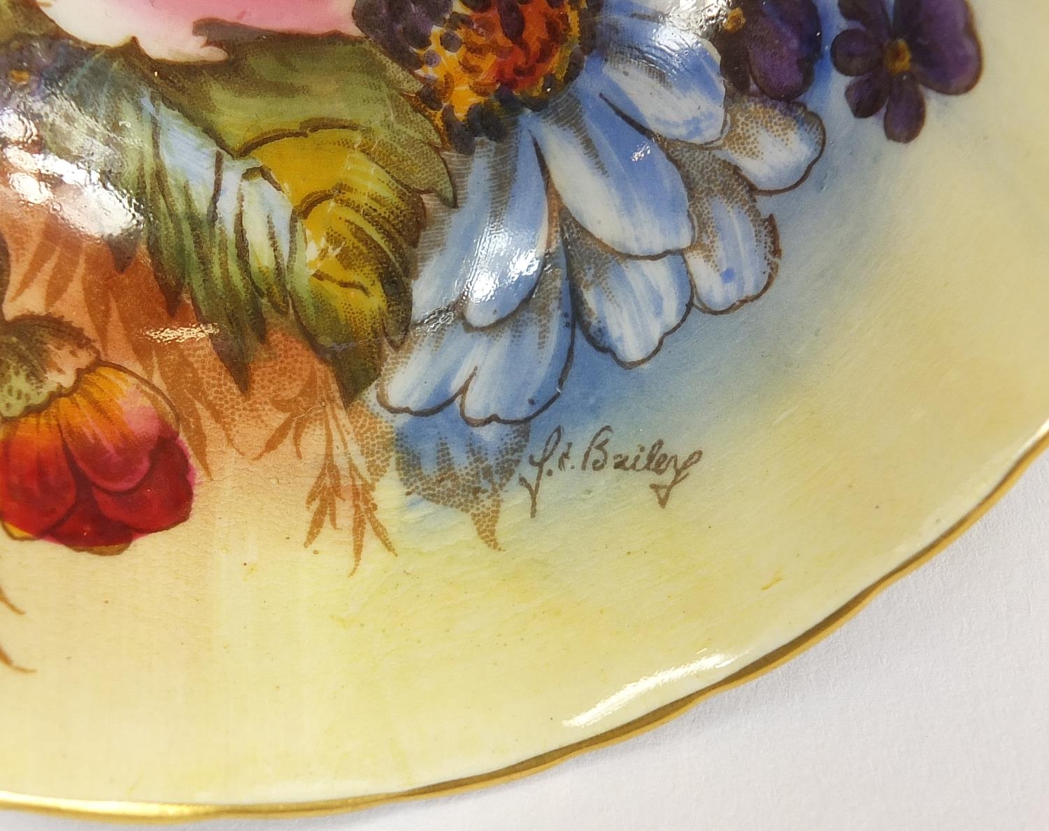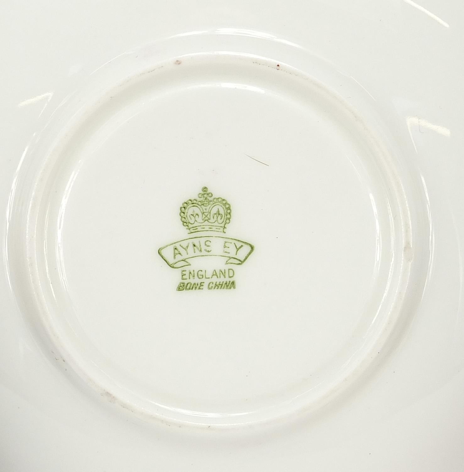 Three Aynsley cups and saucers including two hand painted with flowers and one decorated with a rigged ship signed D Jones, each cup 6cm high