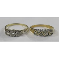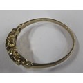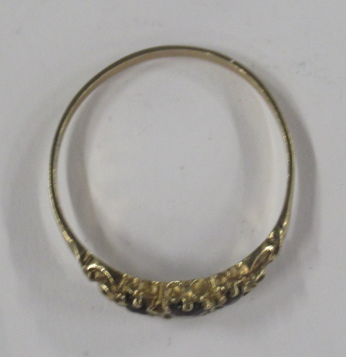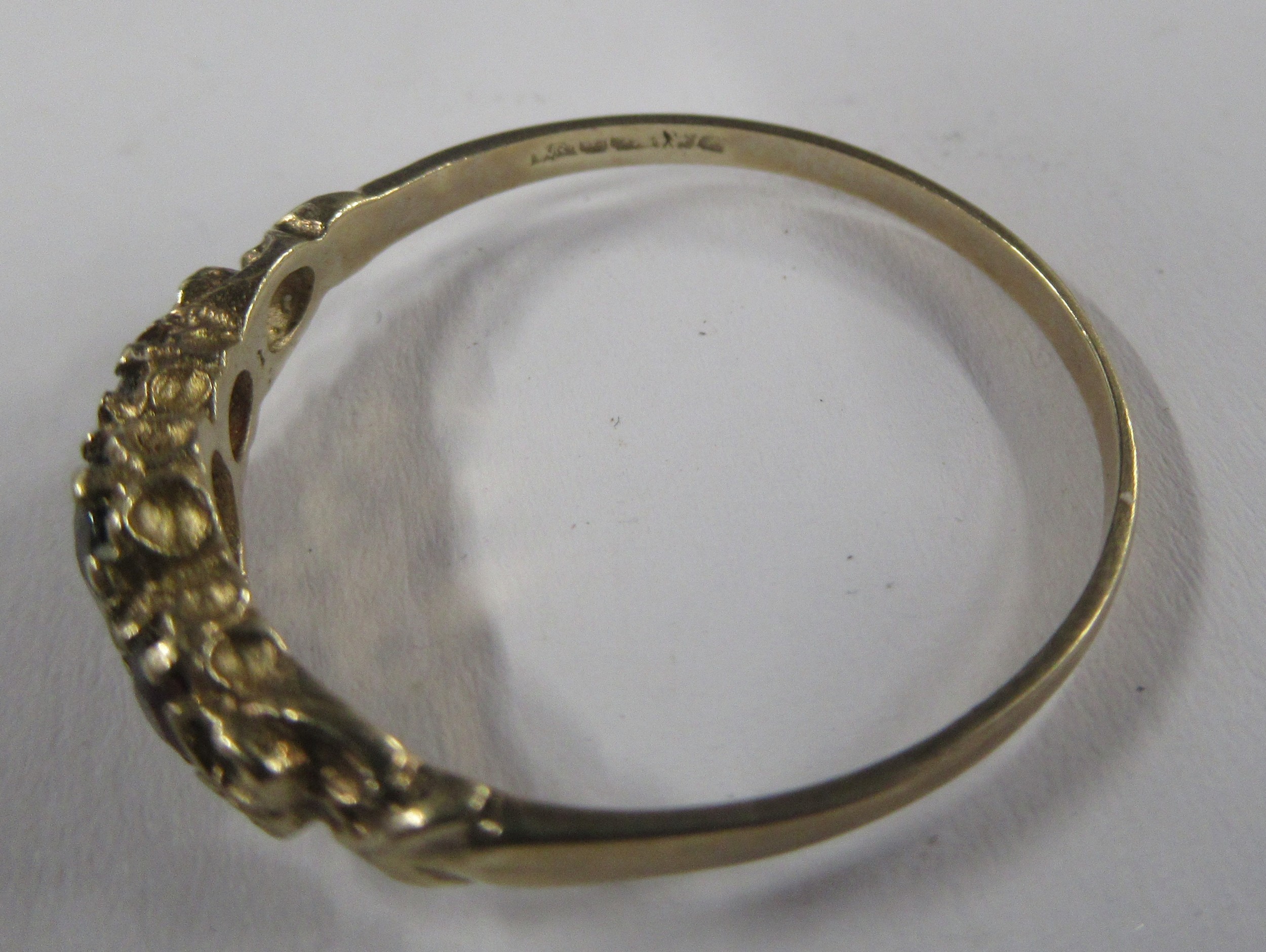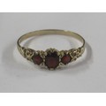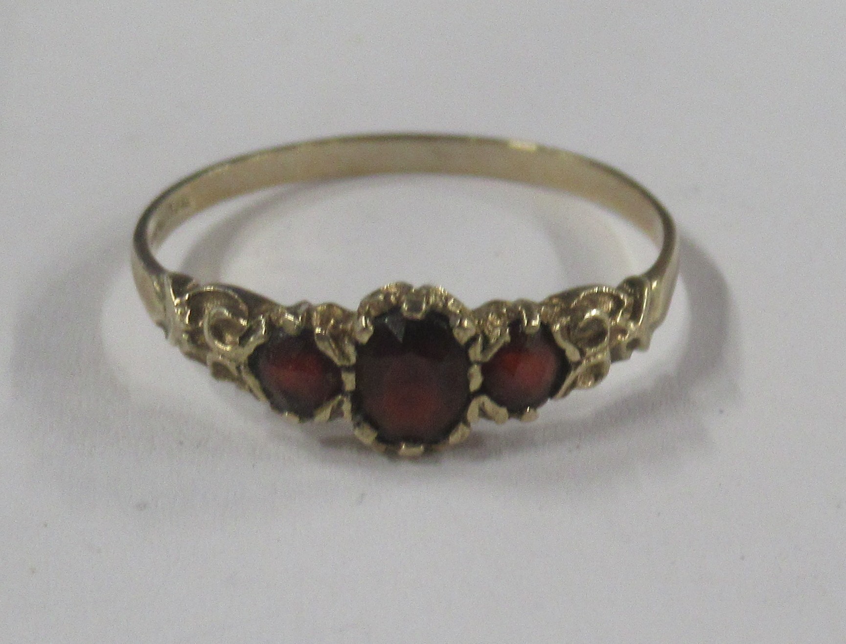 A 9ct graduated three stone garnet set ring, cast scroll shoulders, hallmark indistinct