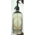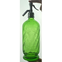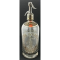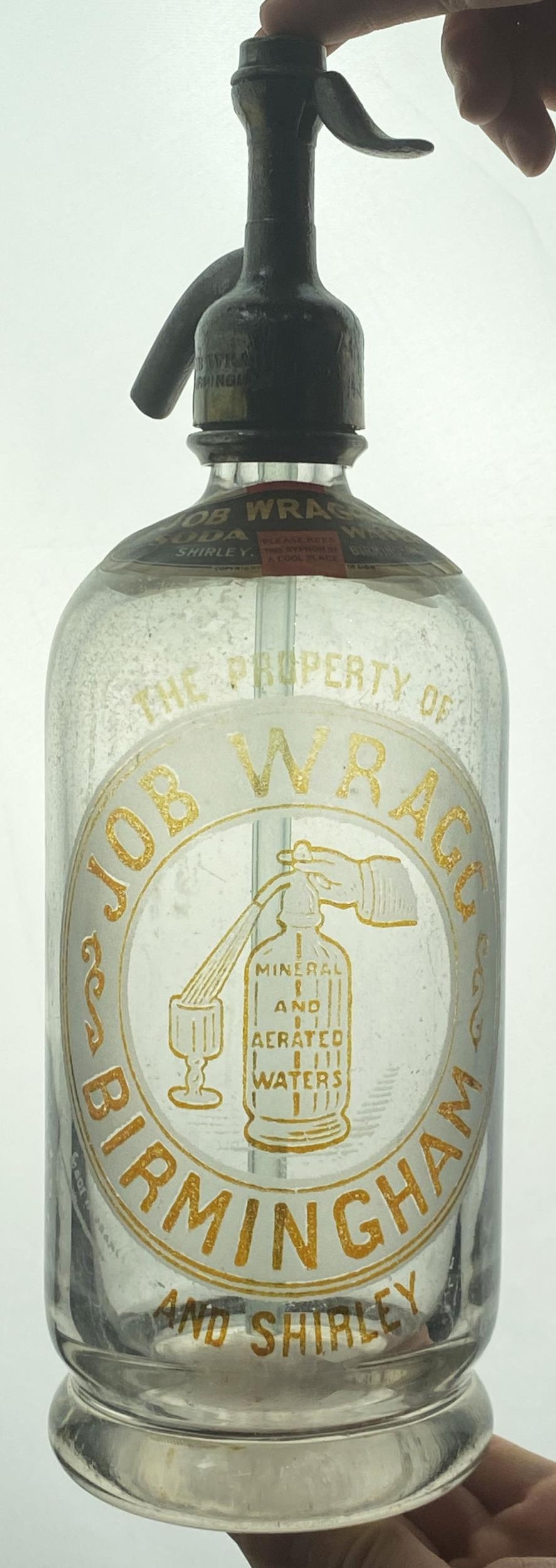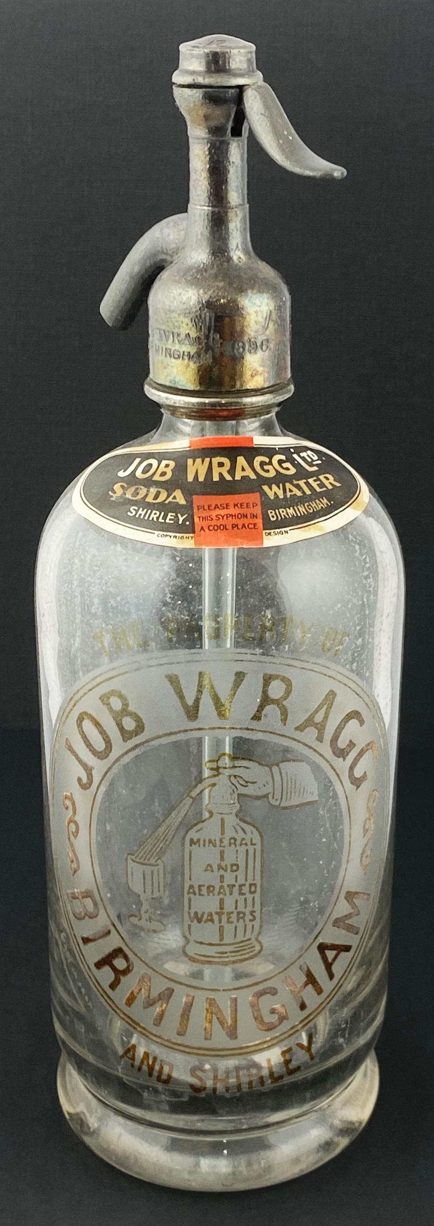 BIRMINGHAM JOB WRAGG SODA SYPHON. 11.9ins tall, matt pewter top, footed, clear glass. Boldly acid etched with familiar large soda syphon trade mark, all cleverly picked out in mid amber. Original printer shoulder label. Very slight inside haze, generally good.