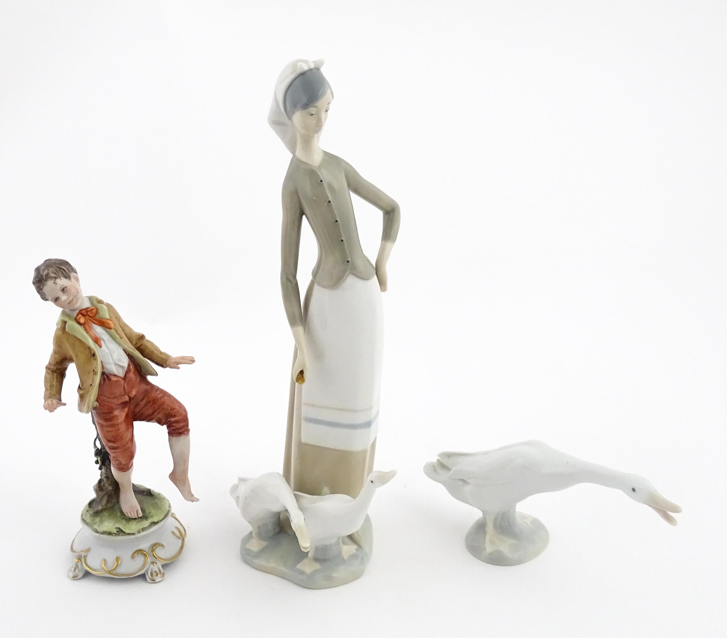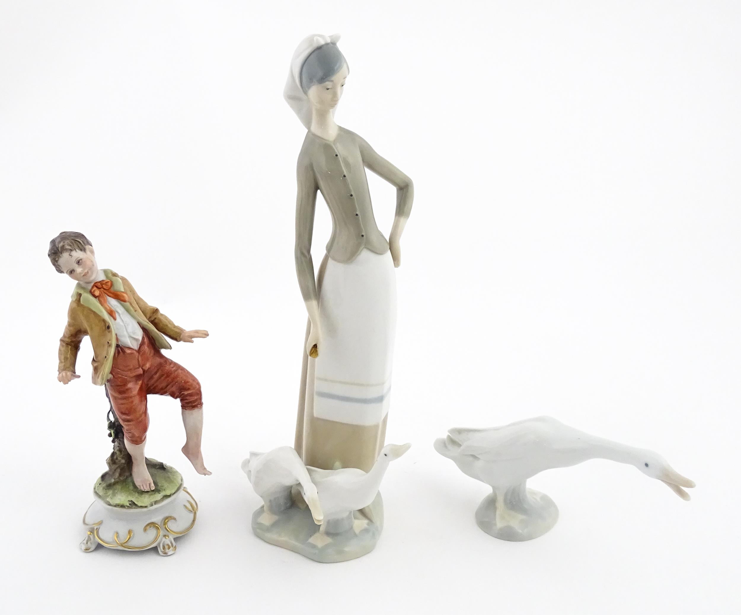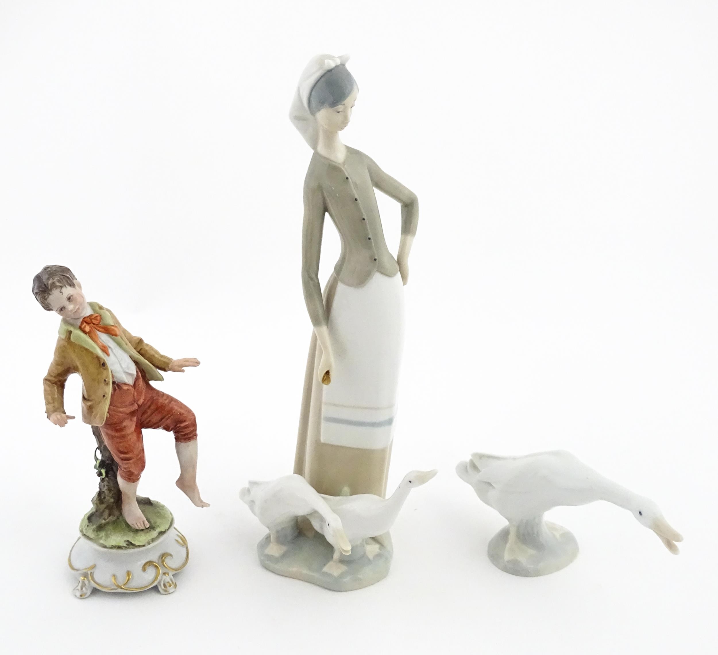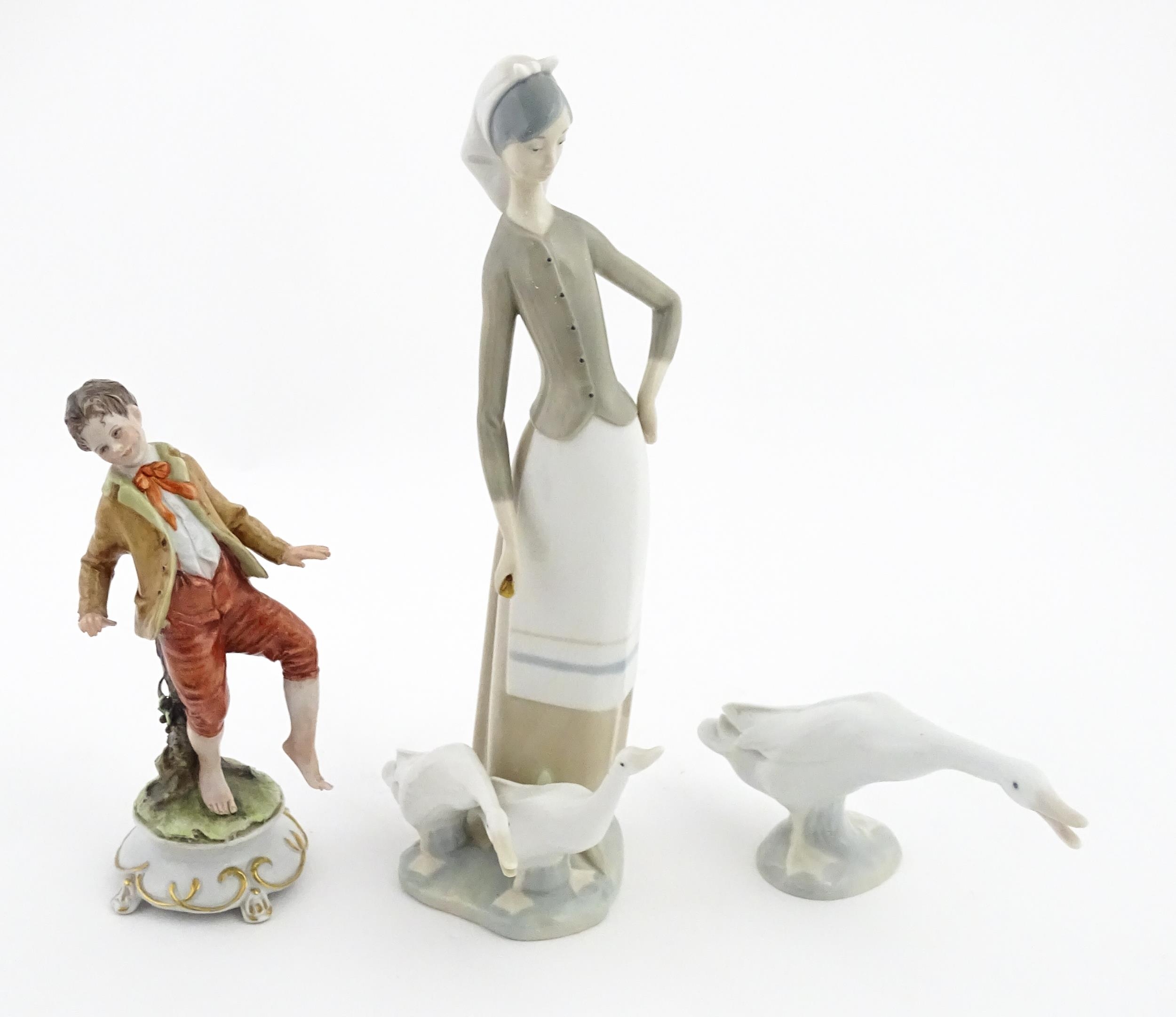 A Lladro figure Girl with Geese, and a Lladro model of a goose. Together with a Capodimonte model of a dancing boy. Largest approx. 10 1/2" high (3)