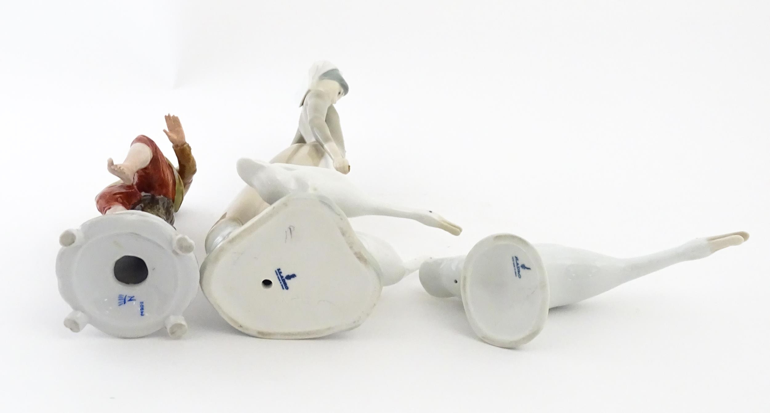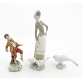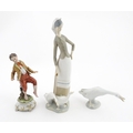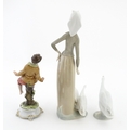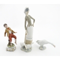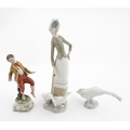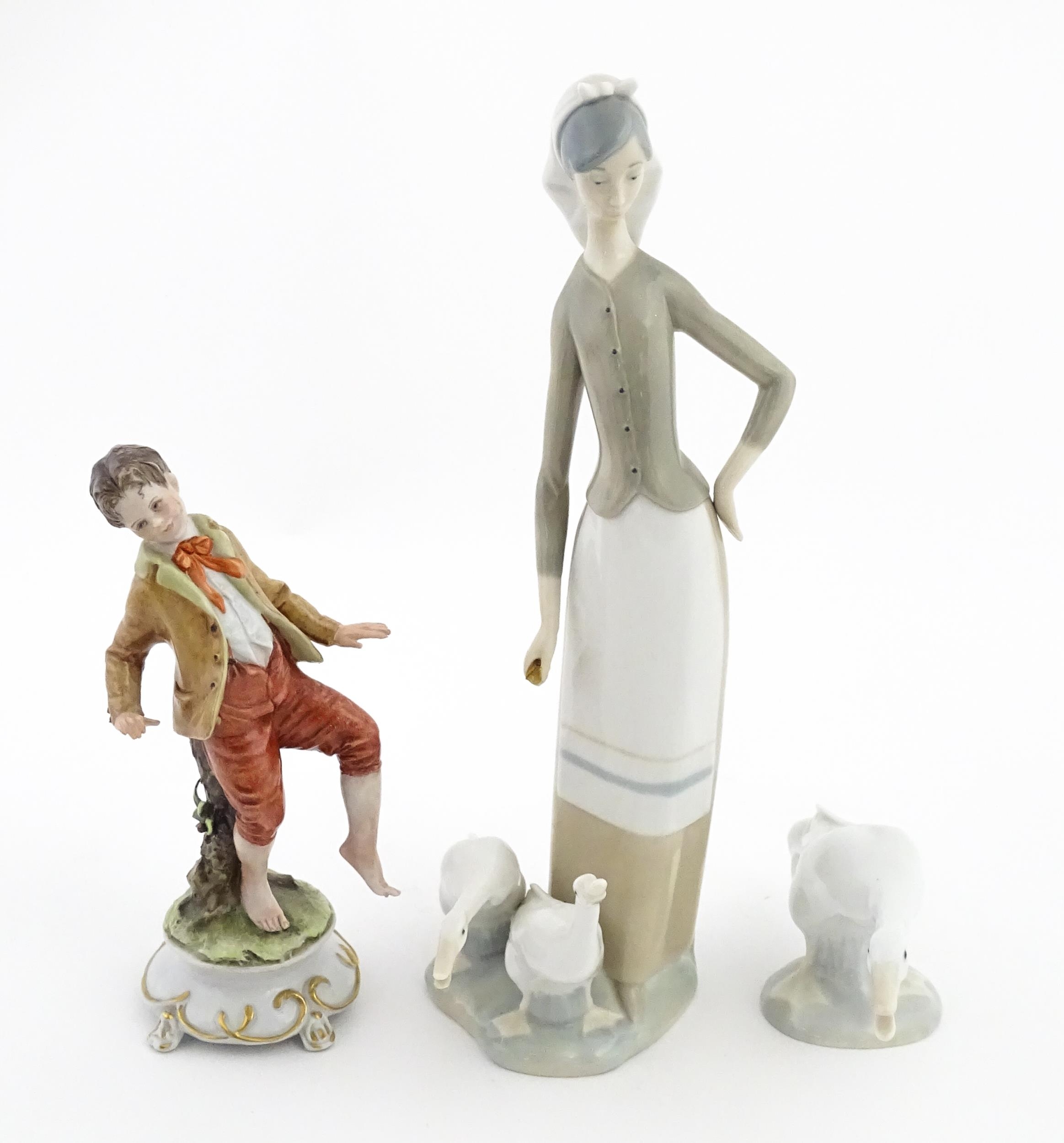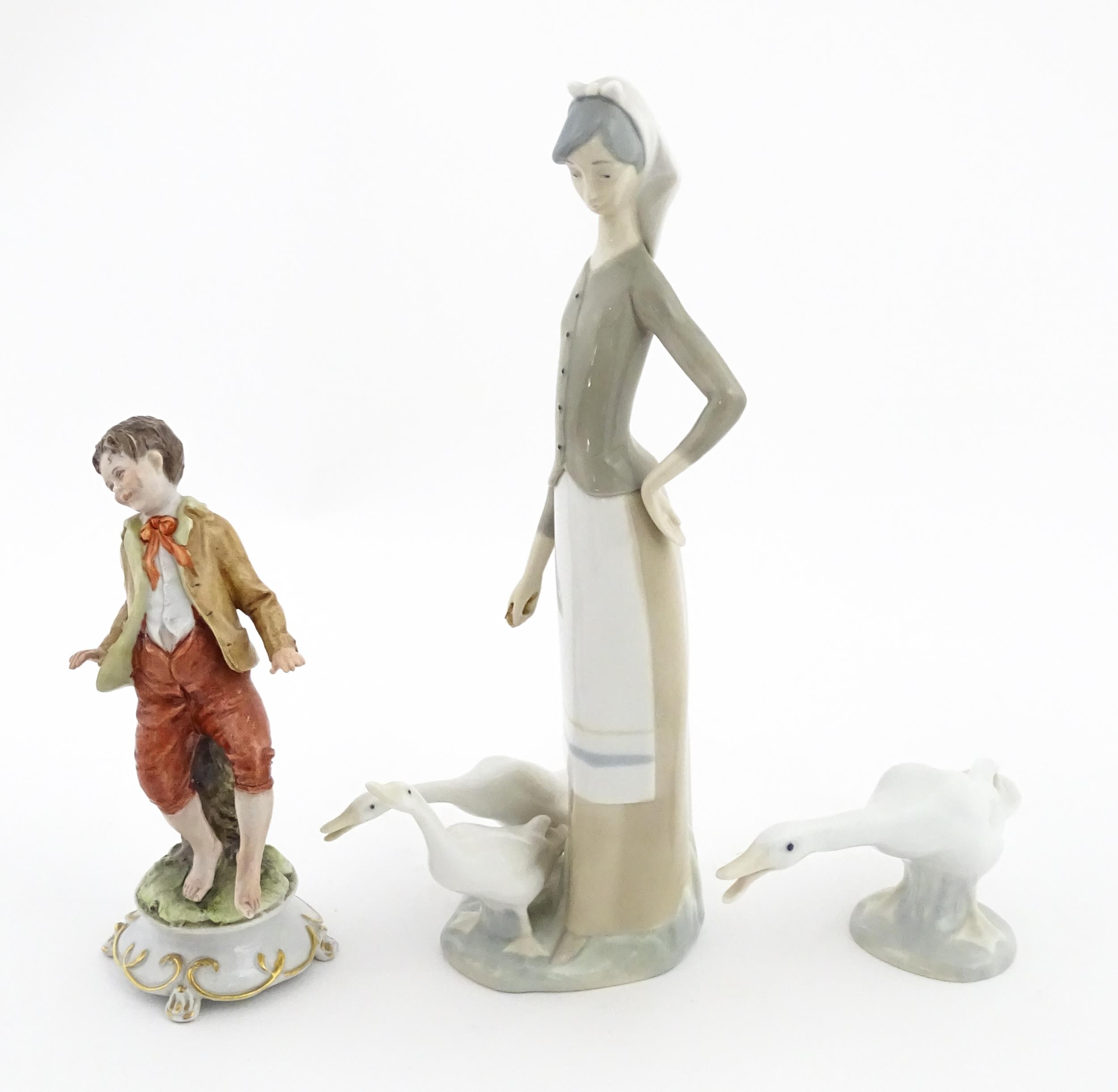 A Lladro figure Girl with Geese, and a Lladro model of a goose. Together with a Capodimonte model of a dancing boy. Largest approx. 10 1/2" high (3)