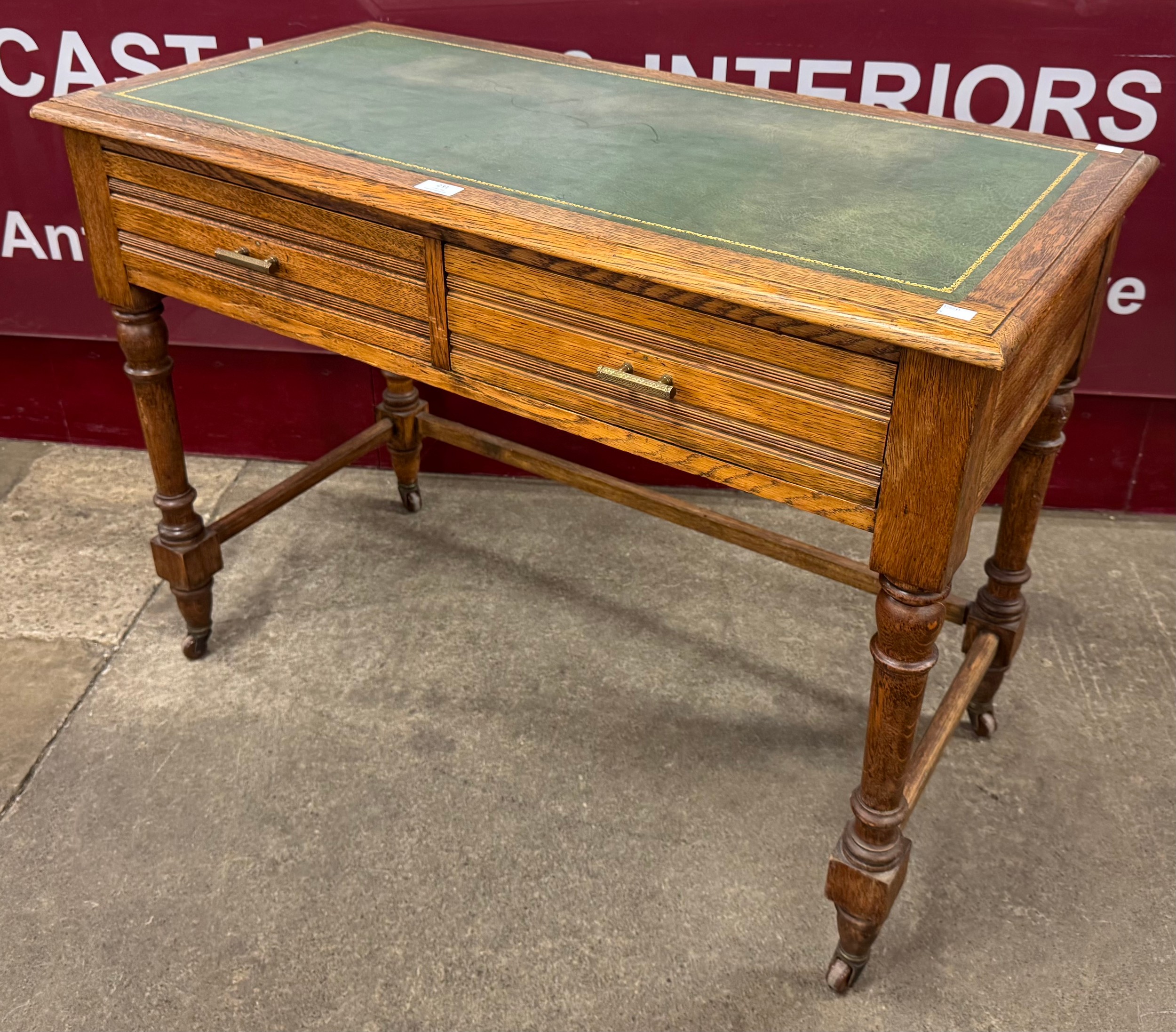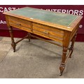 A Victorian oak and green leather topped two drawer writing table