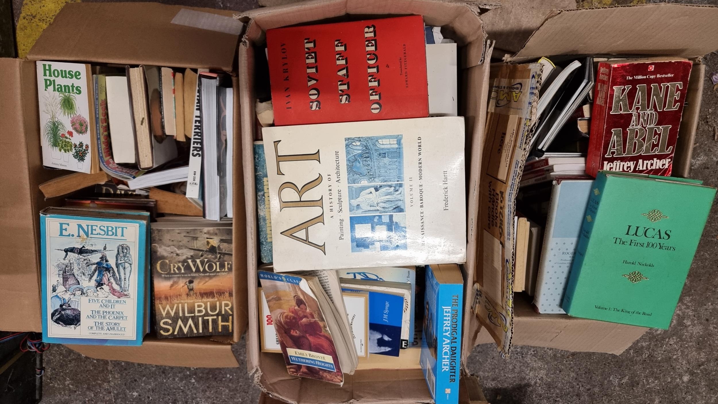 A very large collection of books, covering a wide range of subjects. Books include "Wuthering Heights" by Emily Bronte, "Handyman in the Garden" by Brian Furner and Brian Walkden, and "Art: a History of Painting, Sculpture, Architecture", by Frederick Hartt. (3 large boxes of books)