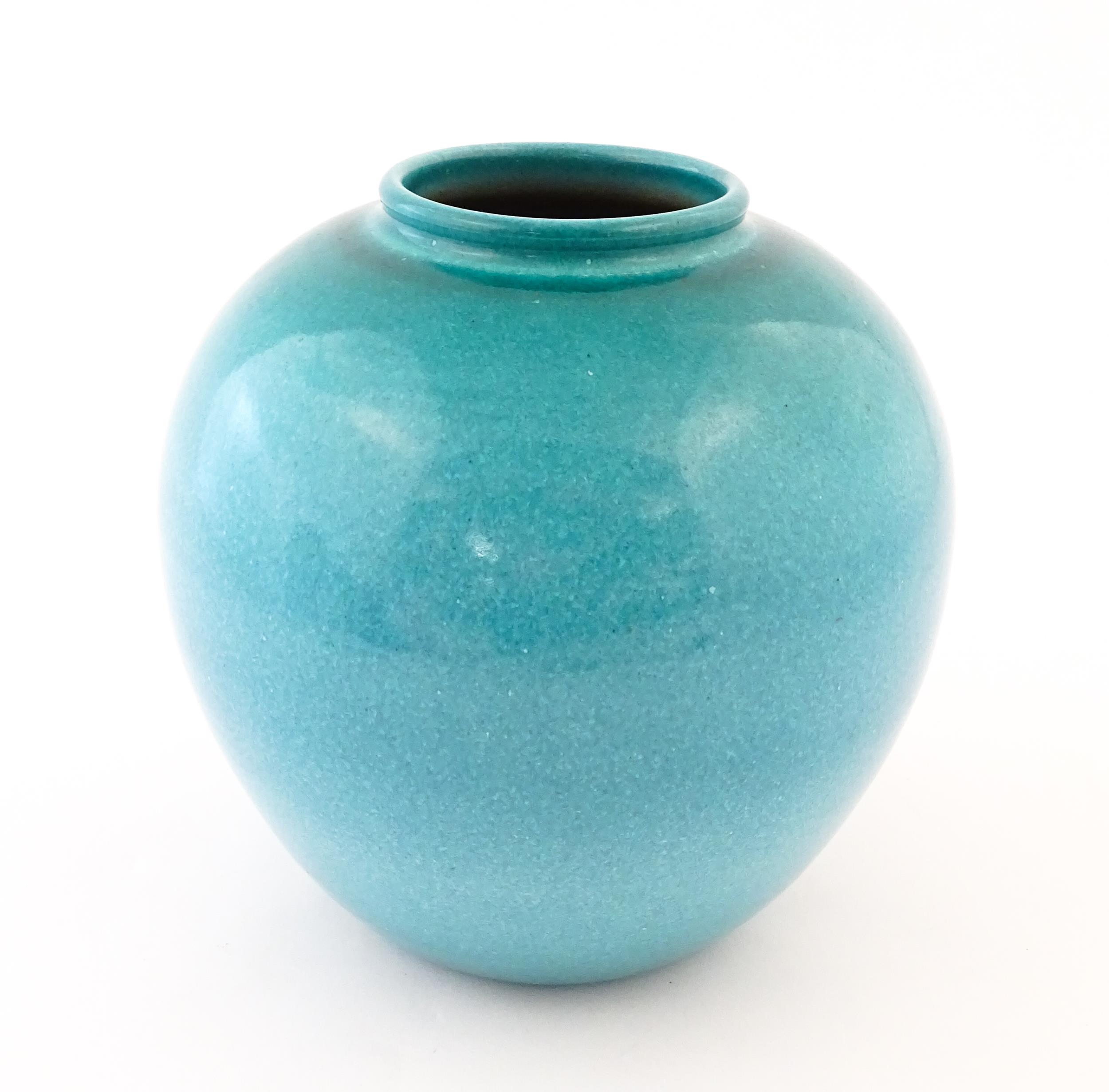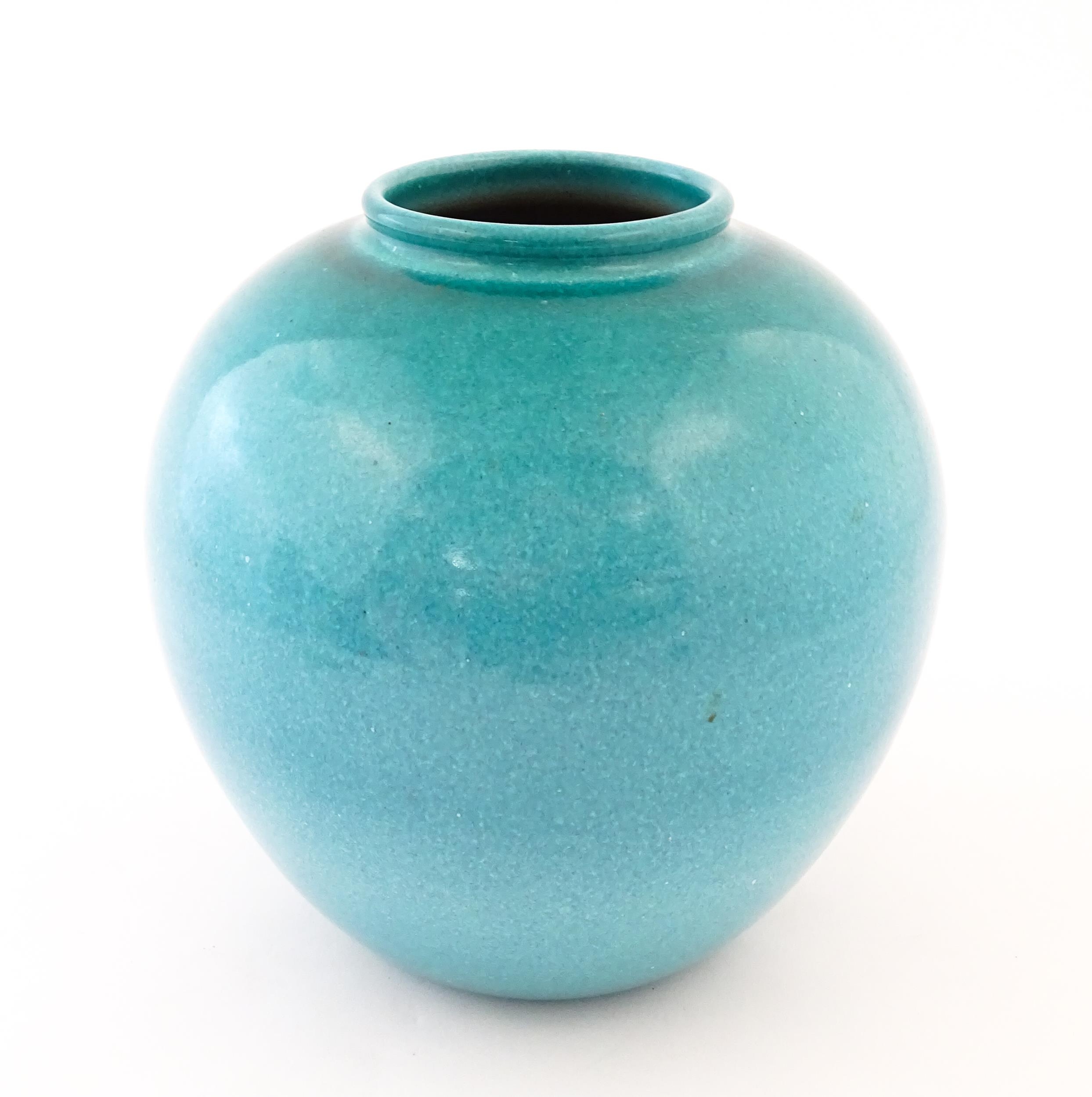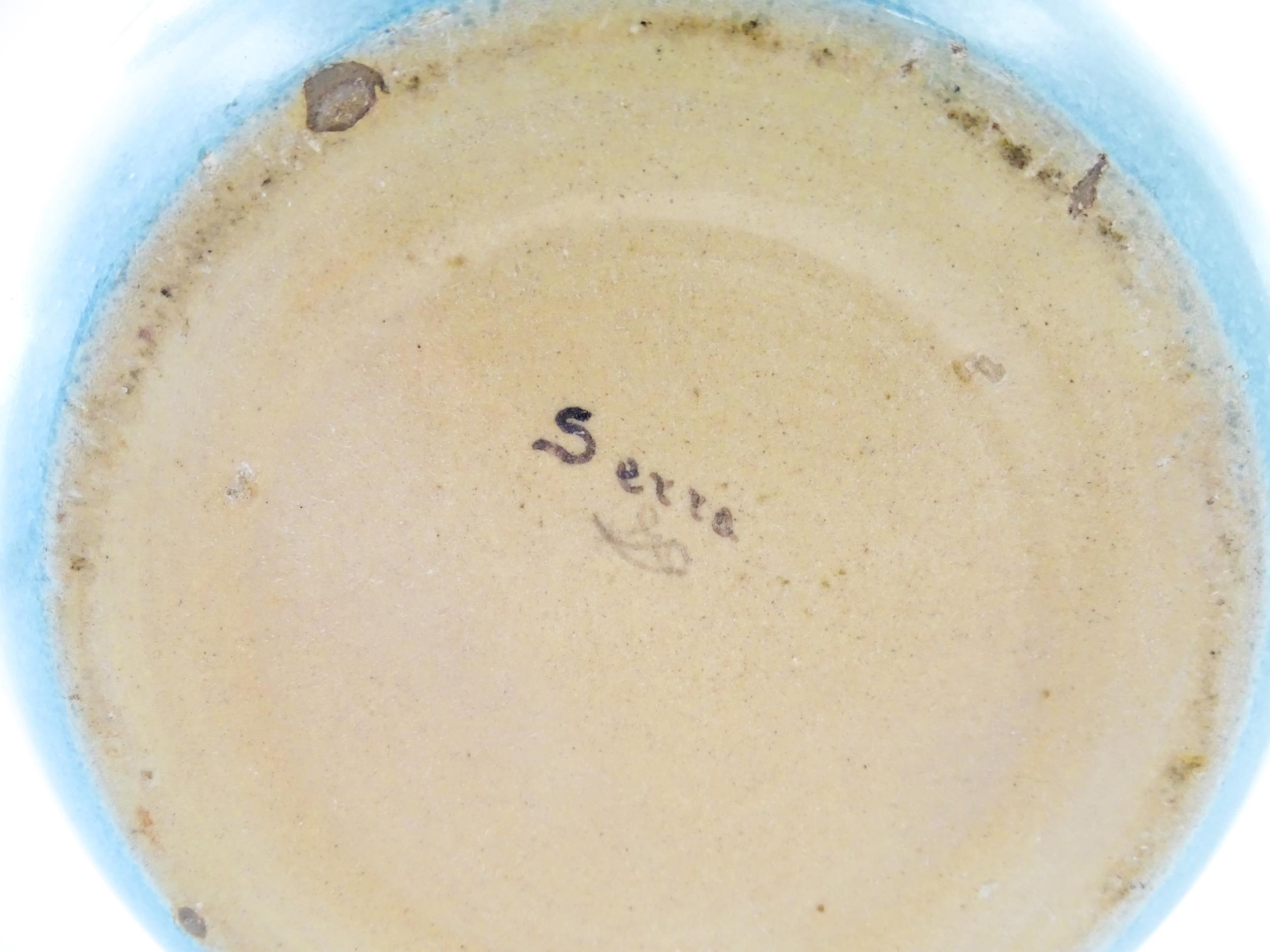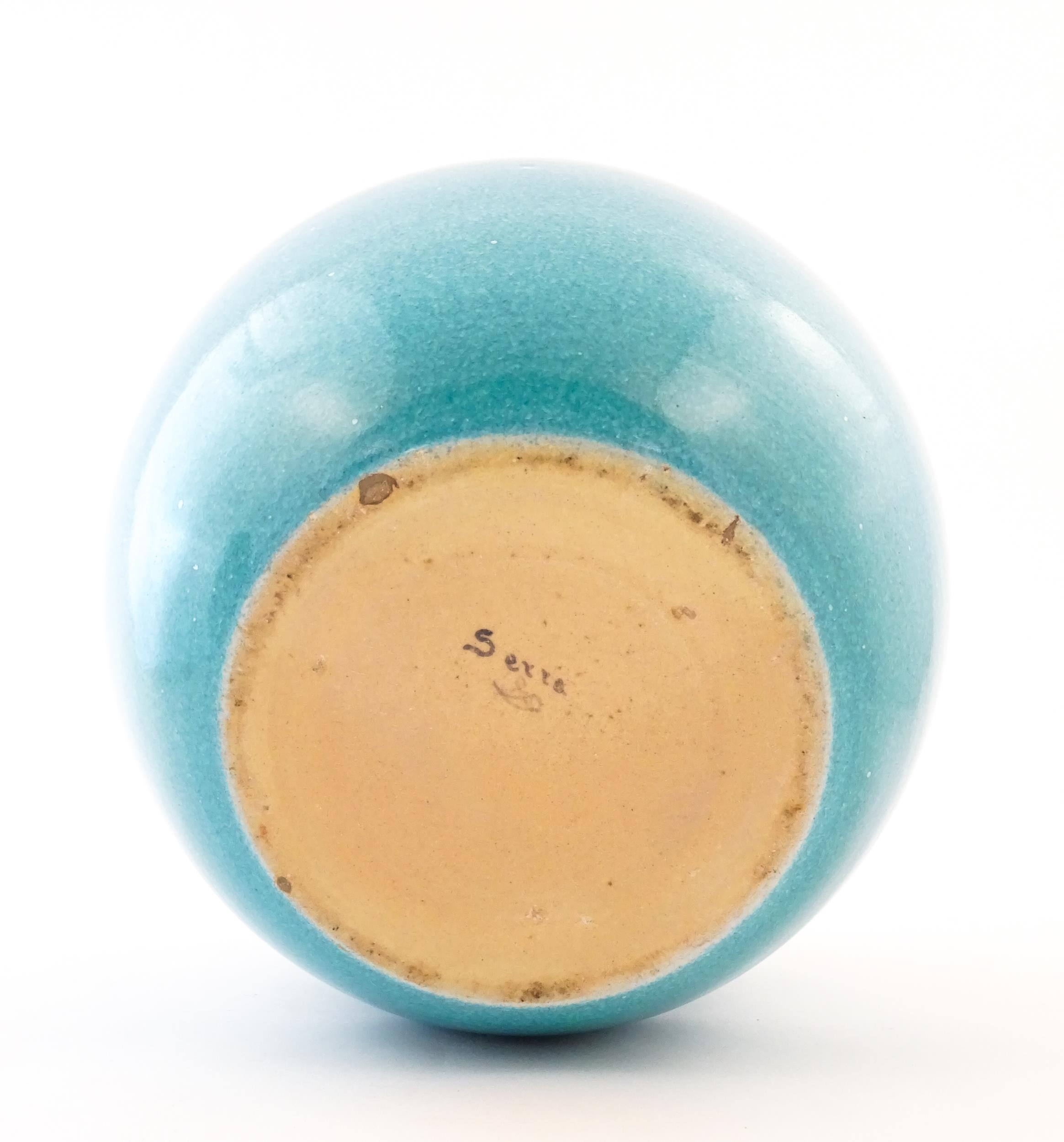 A Continental vase of bulbous form with blue / turquoise glaze. Marked Serra under. Approx. 9 1/4" high