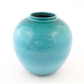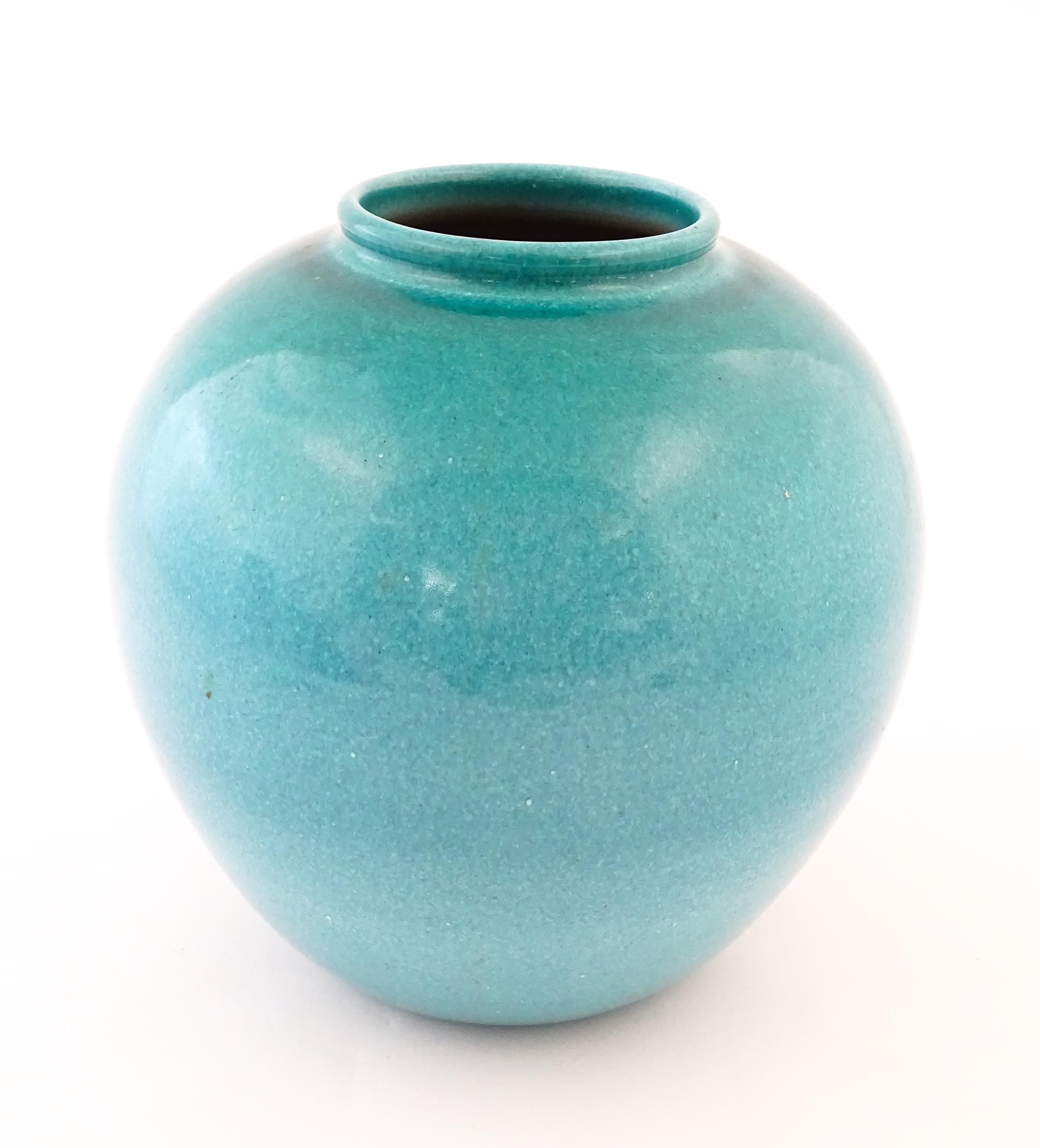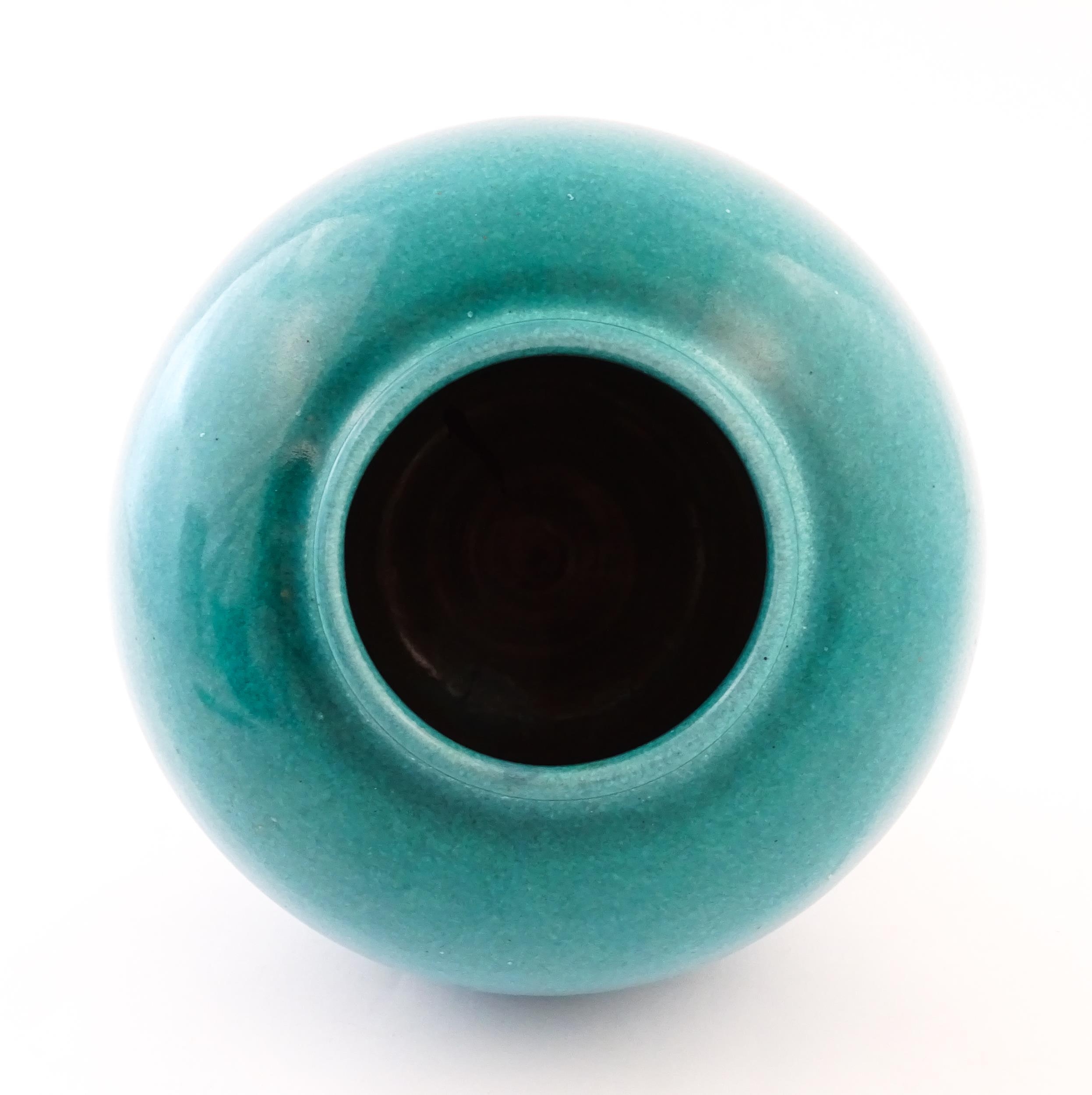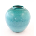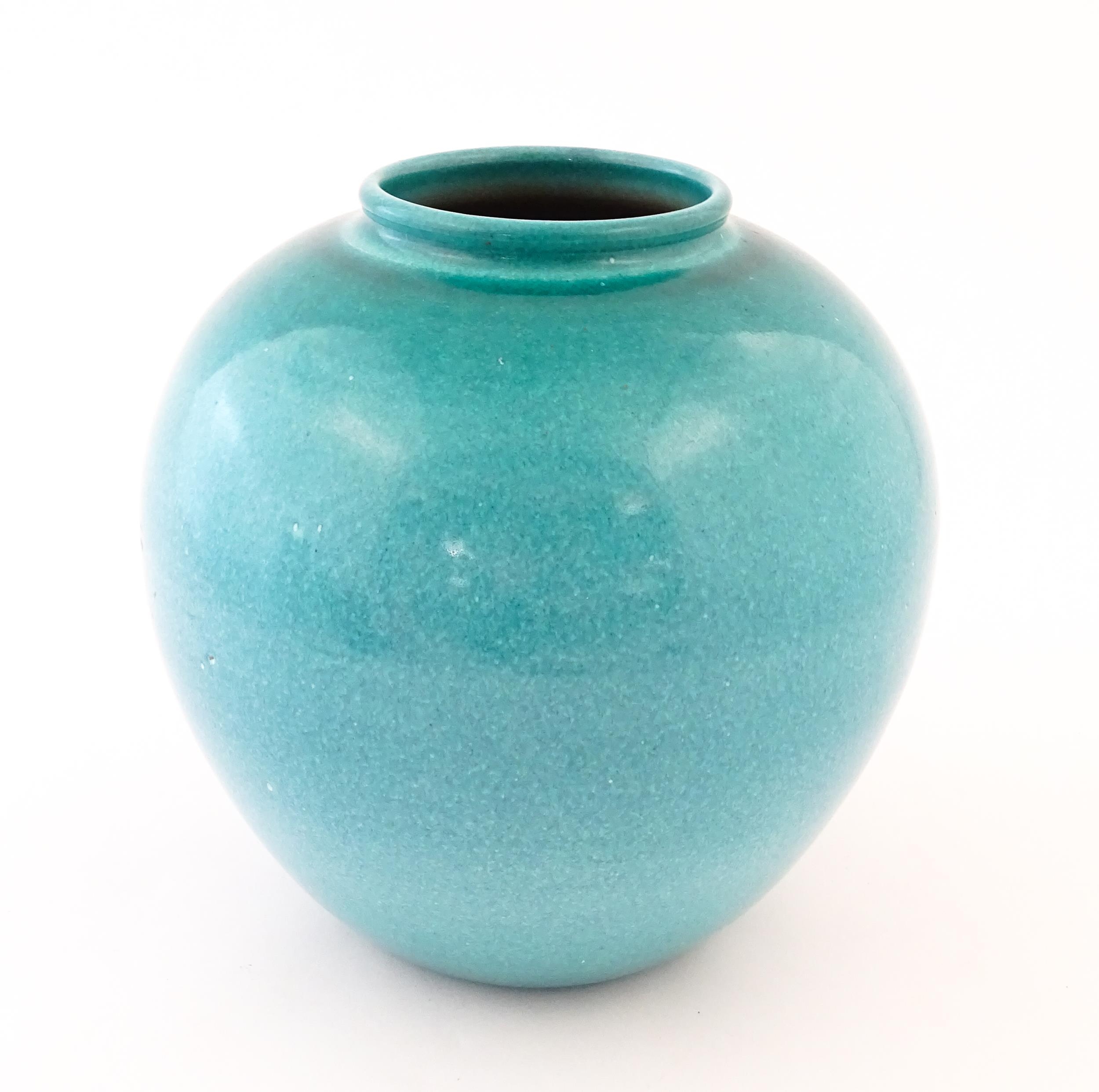 A Continental vase of bulbous form with blue / turquoise glaze. Marked Serra under. Approx. 9 1/4" high