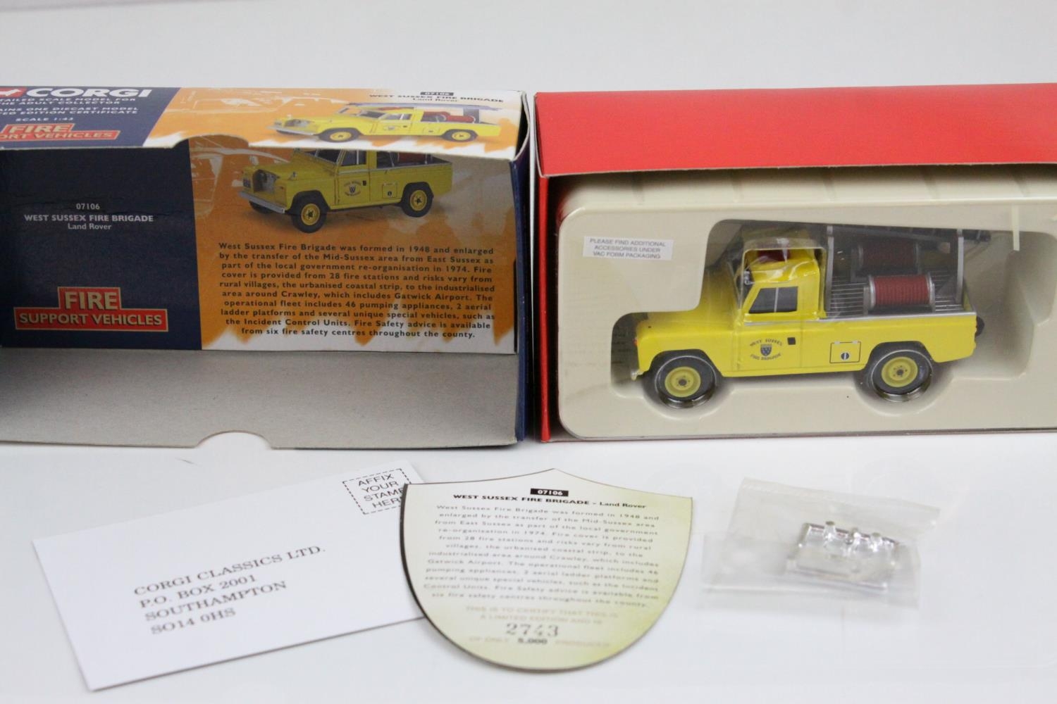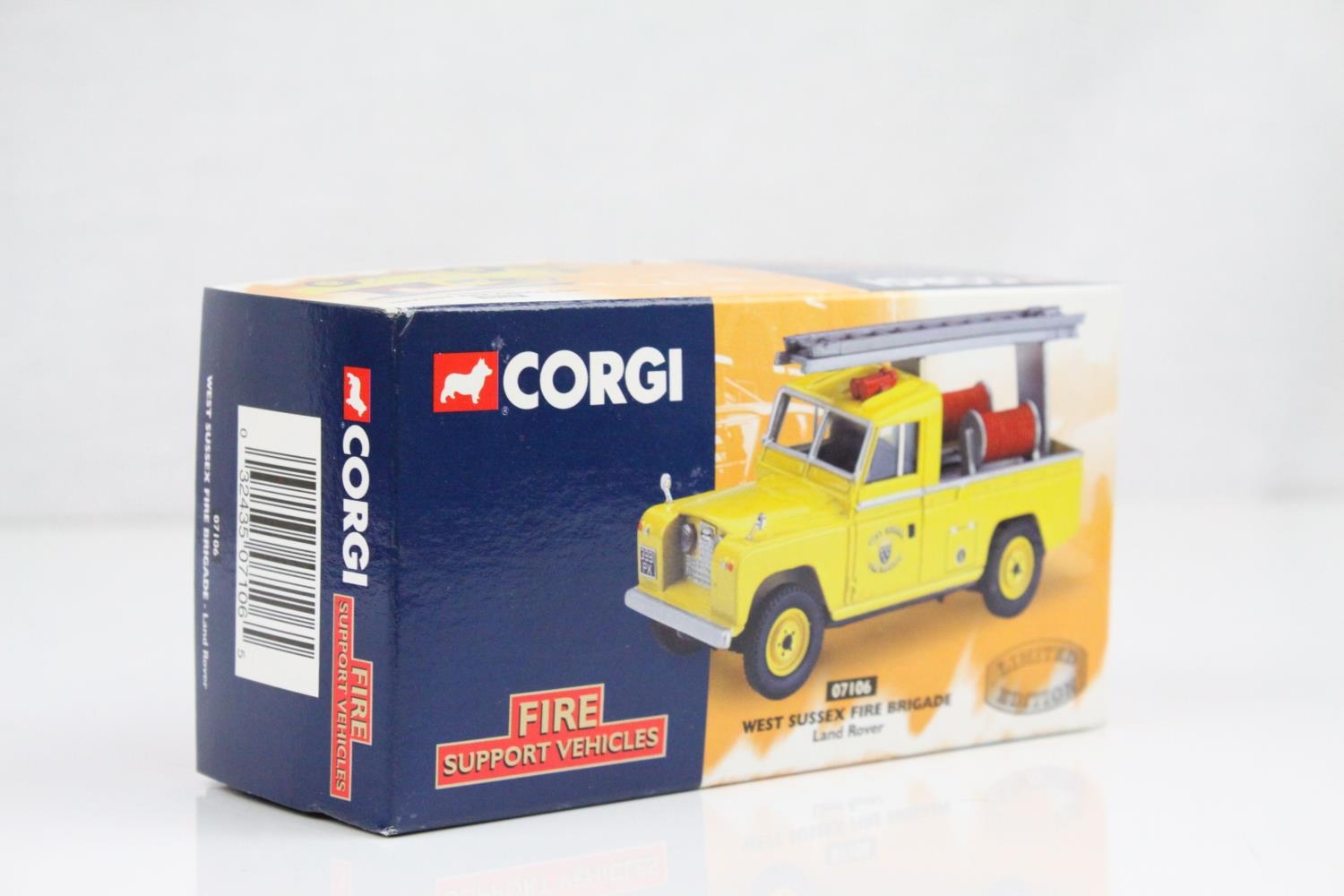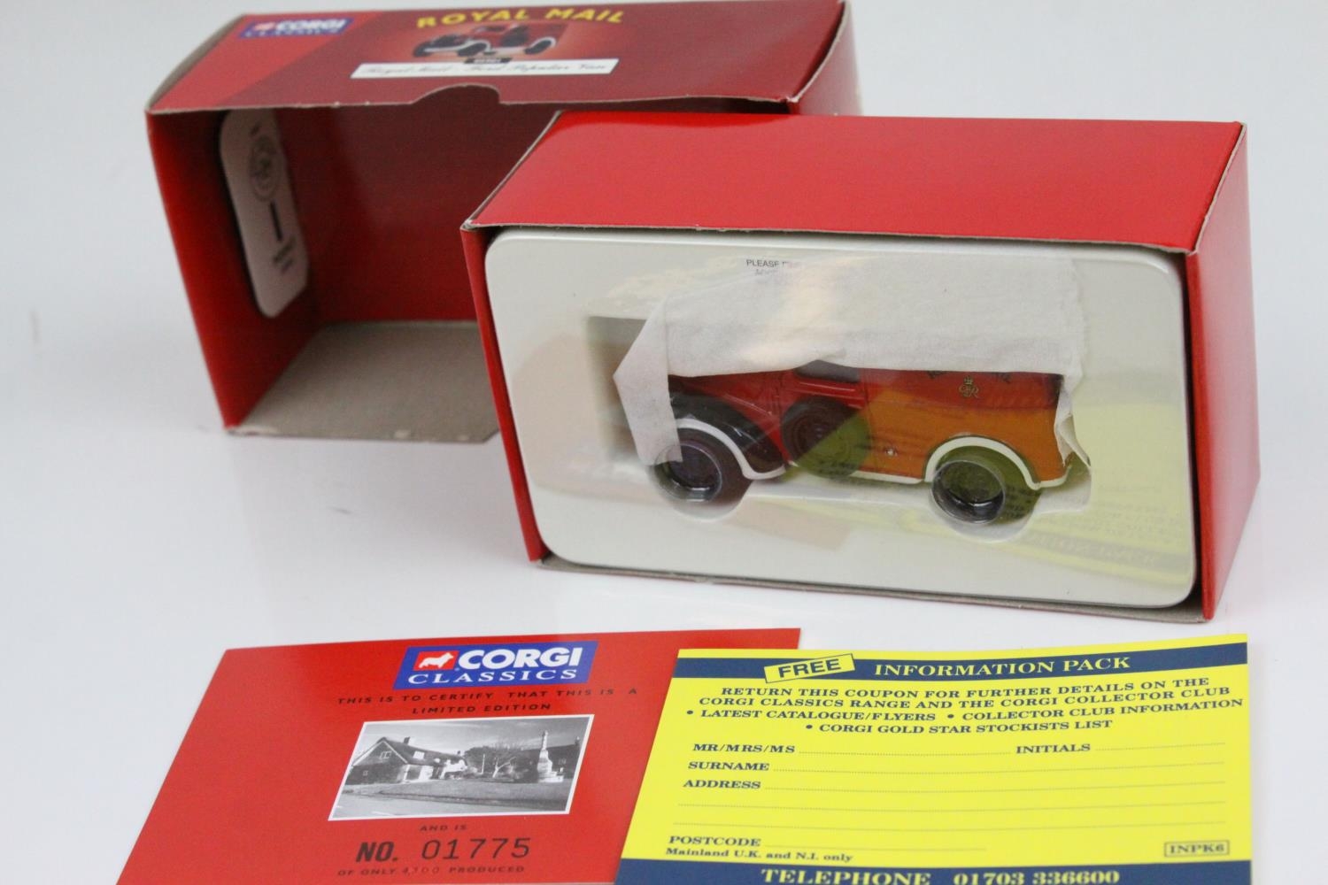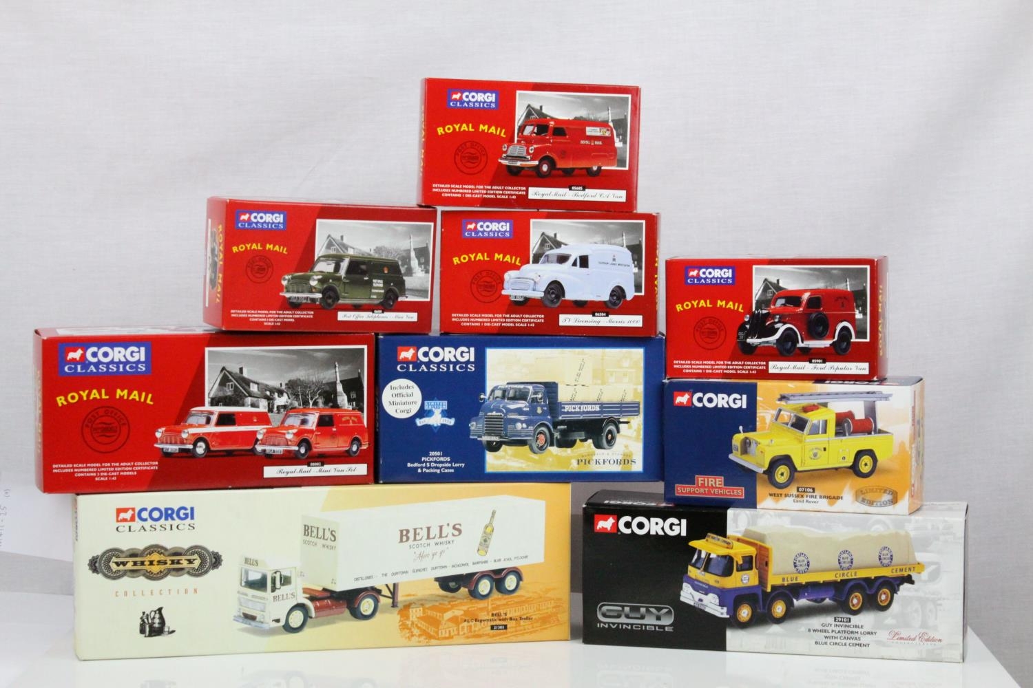 Nine boxed Corgi diecast models to include Royal Mail x 5 (06504, 06001, 08002, 05605 & 05901), Fire Support Vehicles 07106, Pickfords 20501, Whiskey Collection 21303 and Guy Invincible 29101, all vg and with certificates