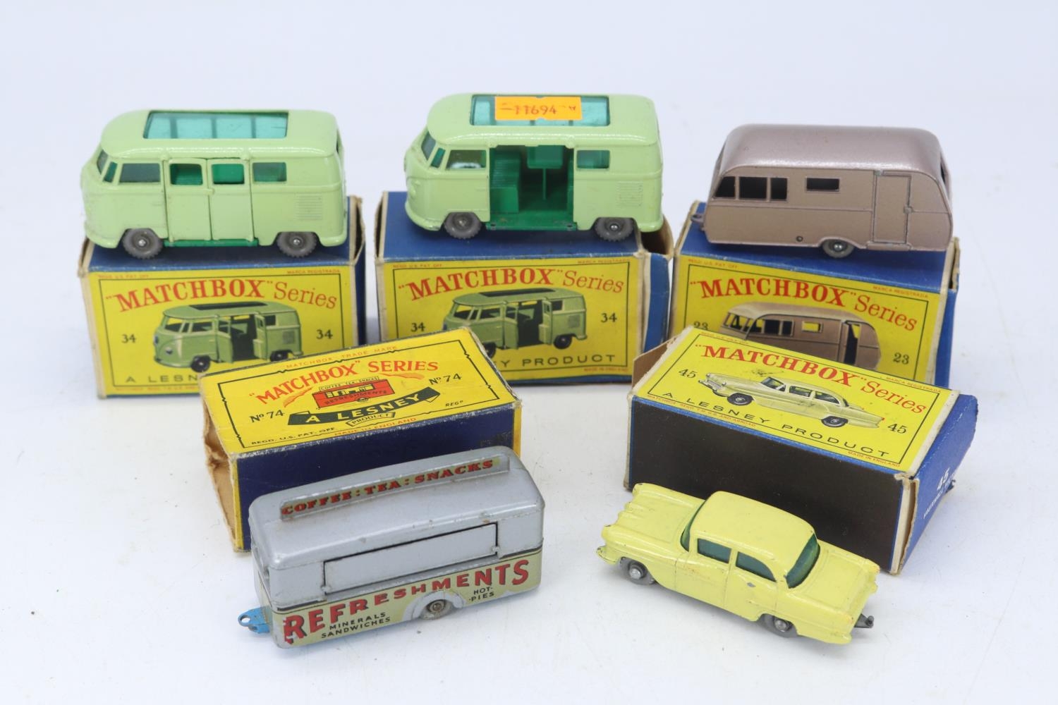 Matchbox Lesney caravette x 2 one missing doors, a bluebird, a mobile canteen and a Vauxhall Victor all boxed showing various levels of playware