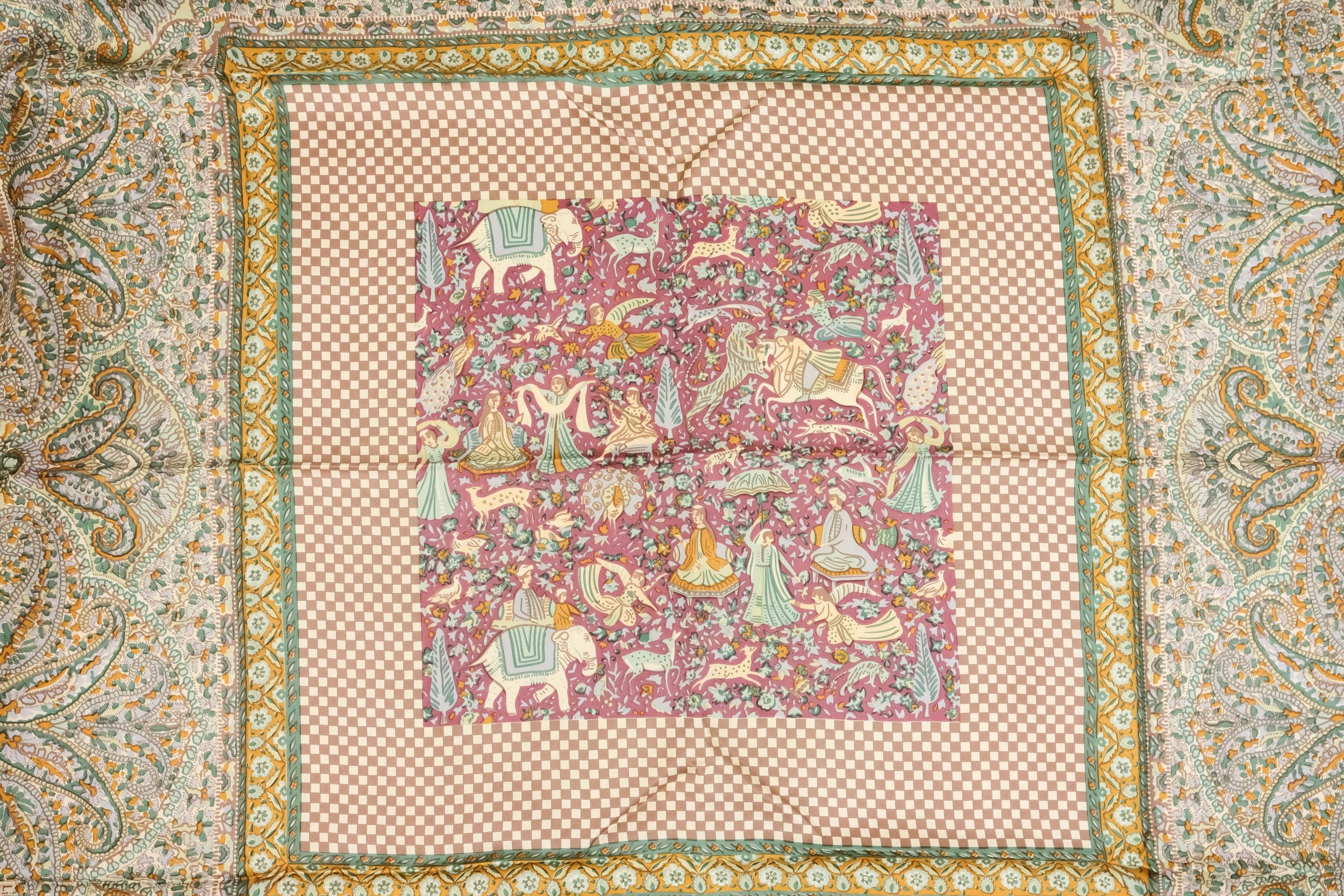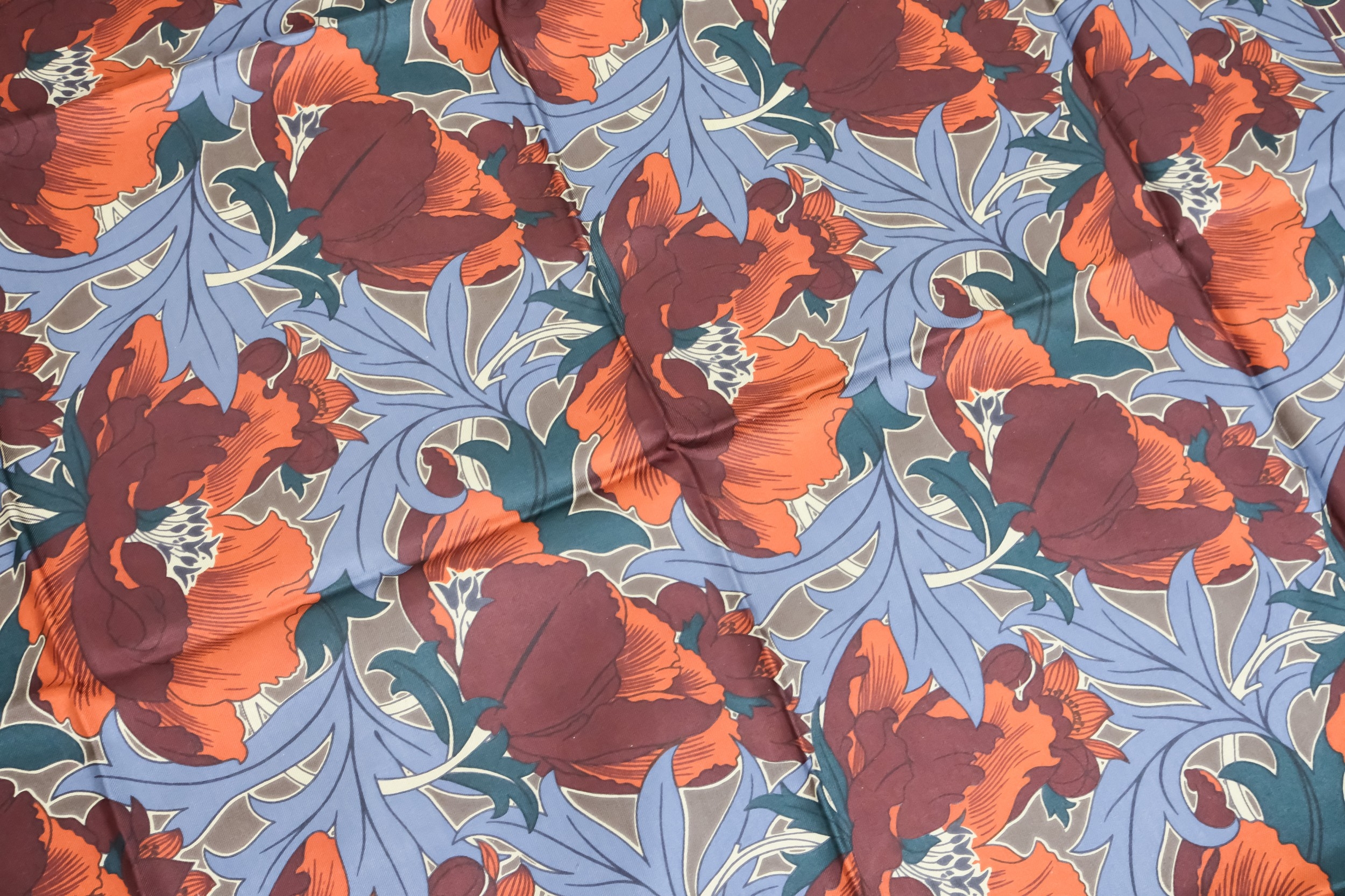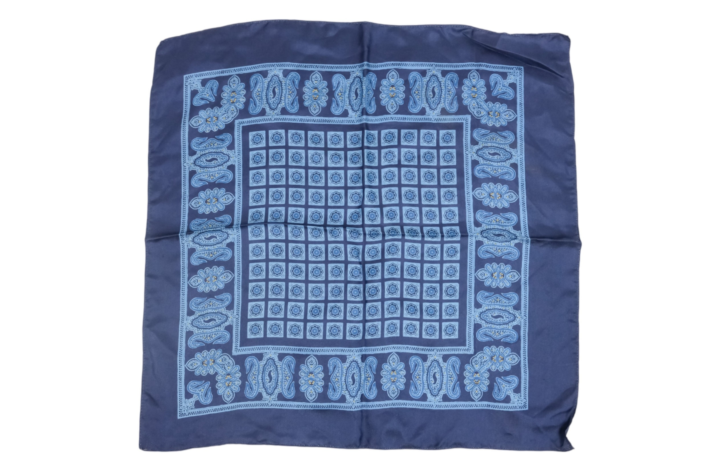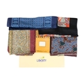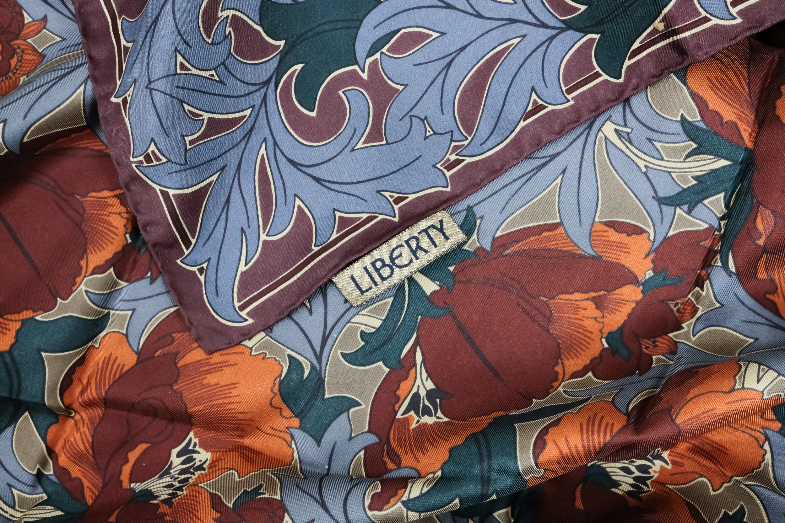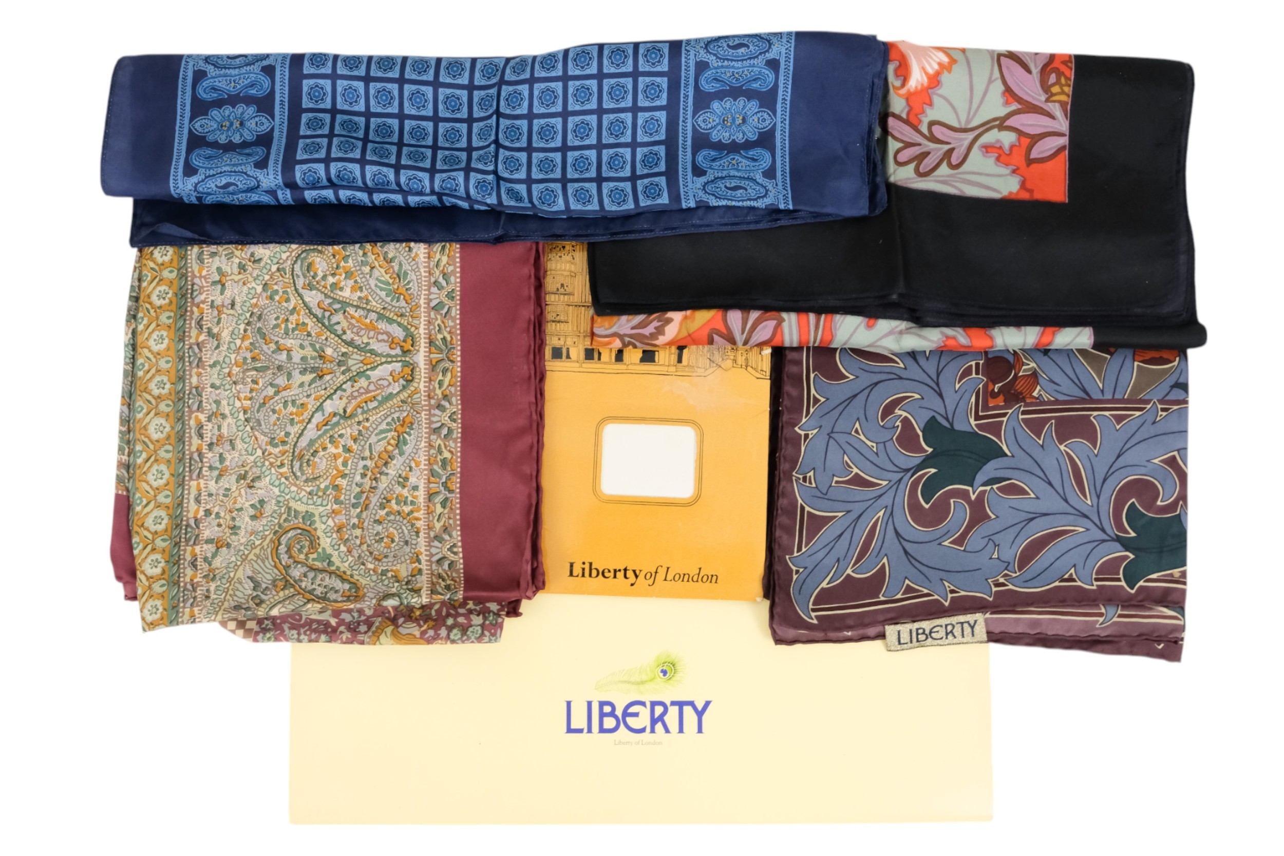 Three various Liberty silk scarves - together with another blue silk pocket square. (4)