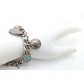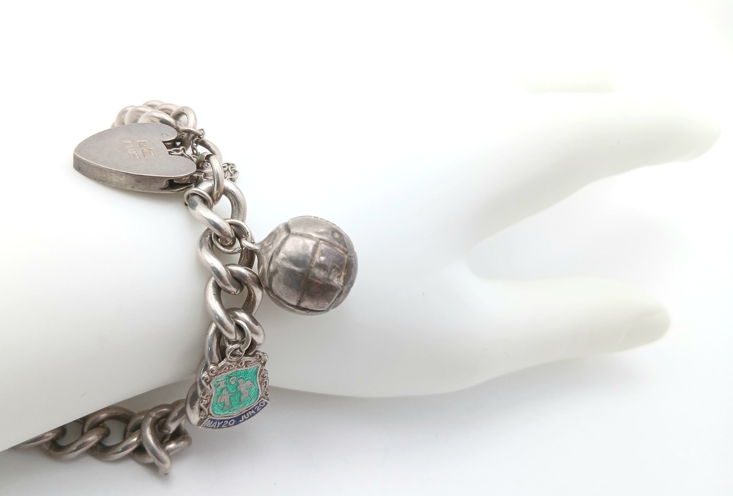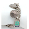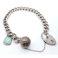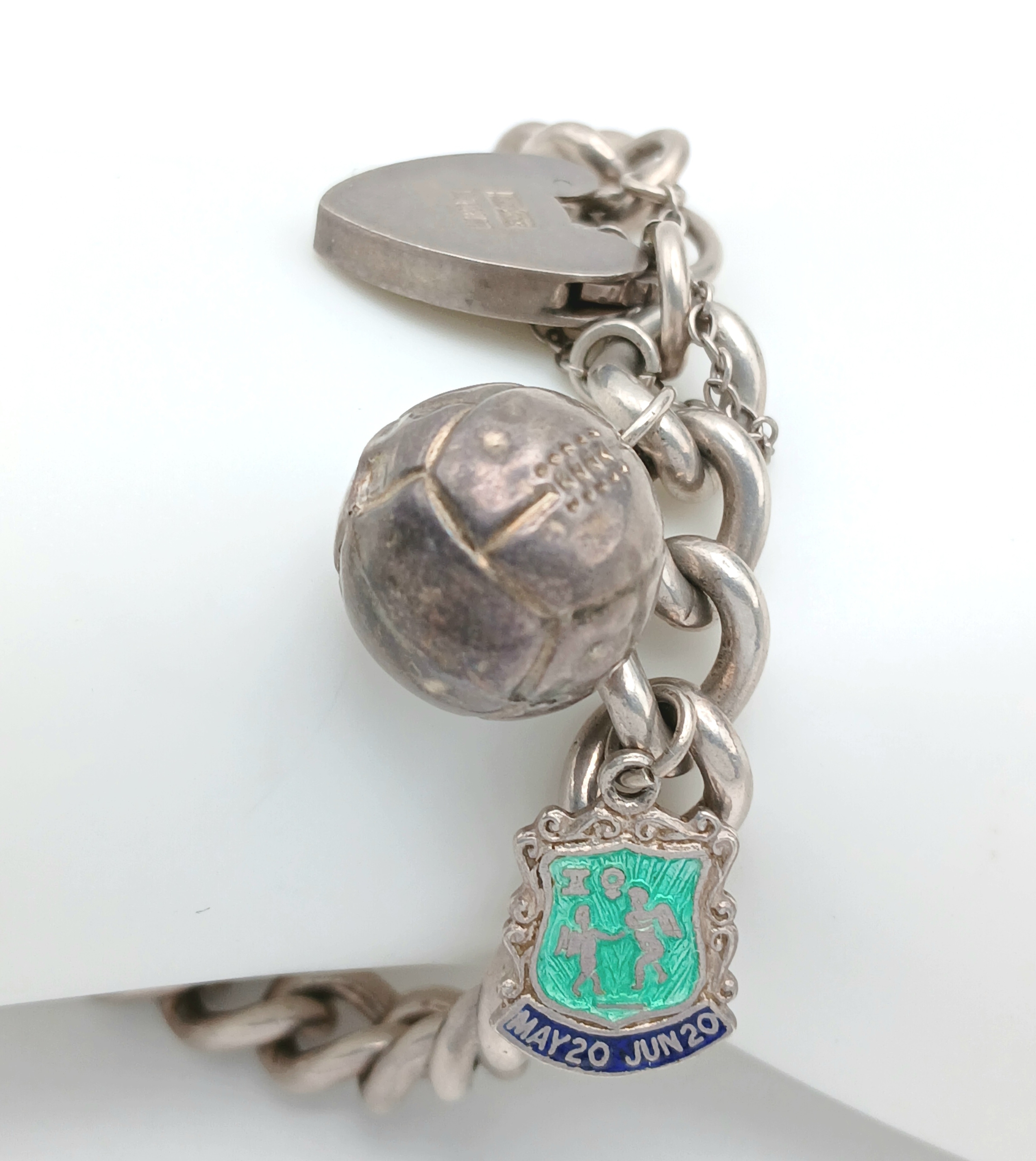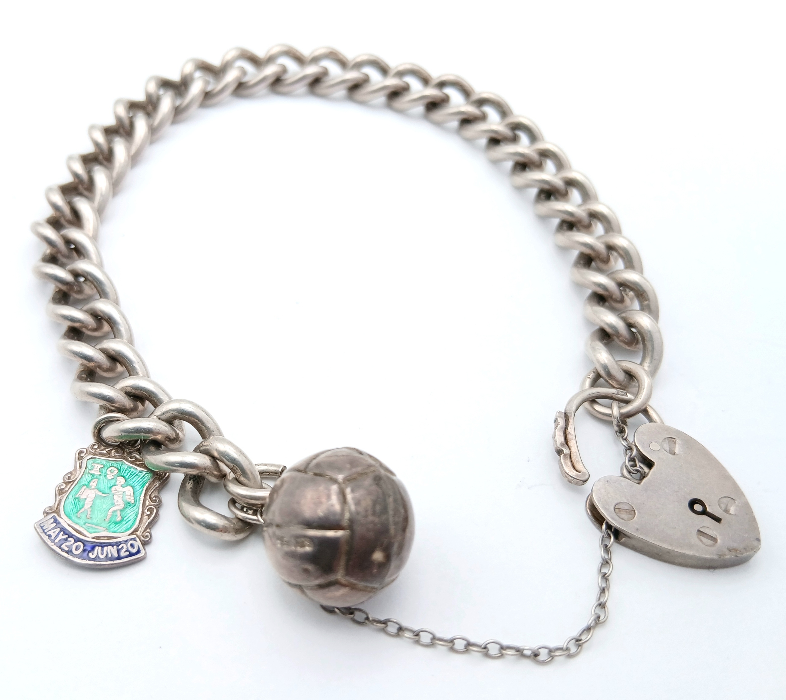 A Sterling Silver Chain Bracelet with Padlock Charm Closure, and Sterling Silver Enamel Gemini Shield Charm, and A Football Charm. Hallmarked Birmingham 1966, Total Weight 38.36 gr, Approximate Length 21cm.