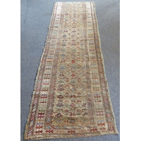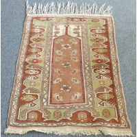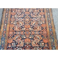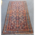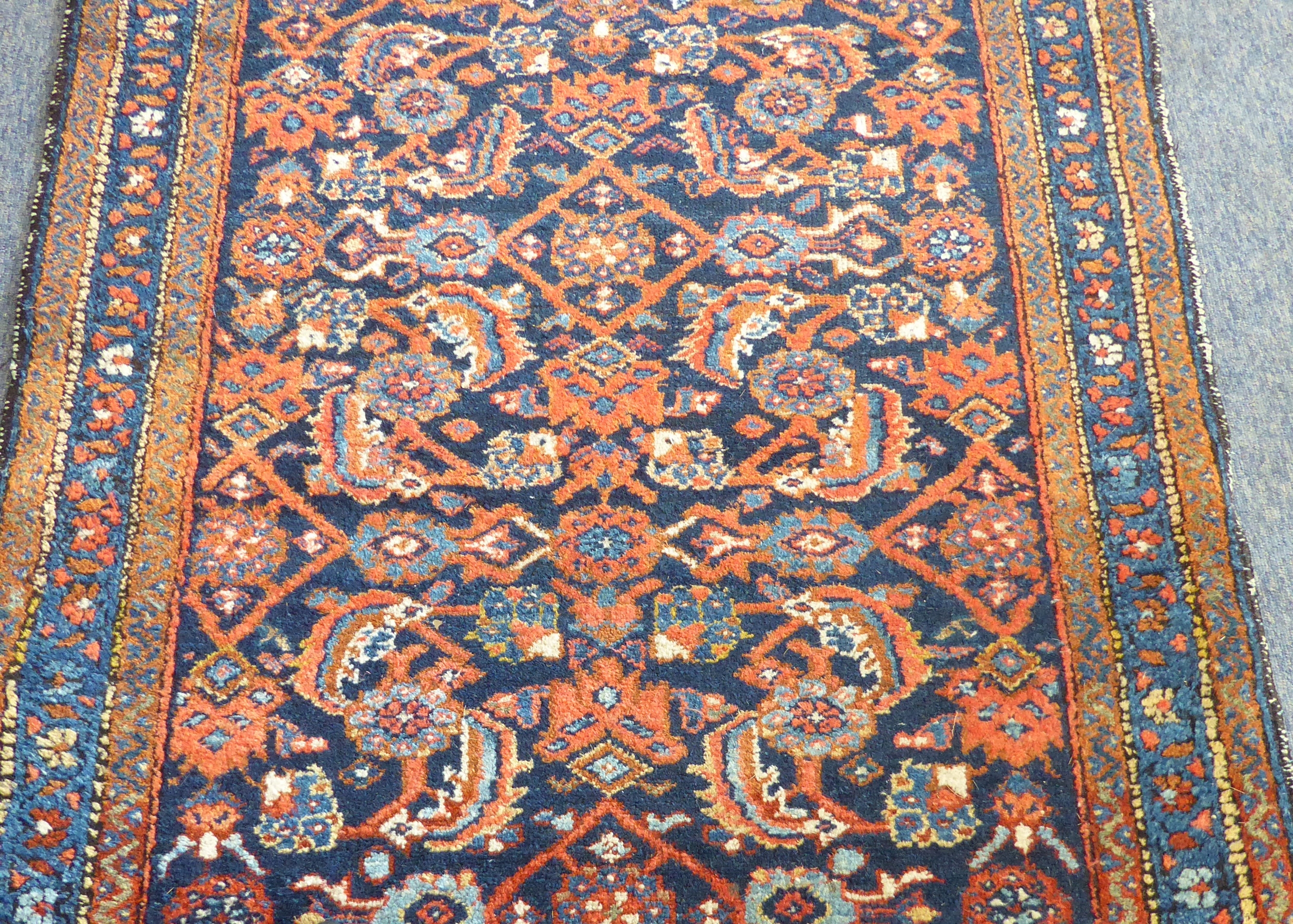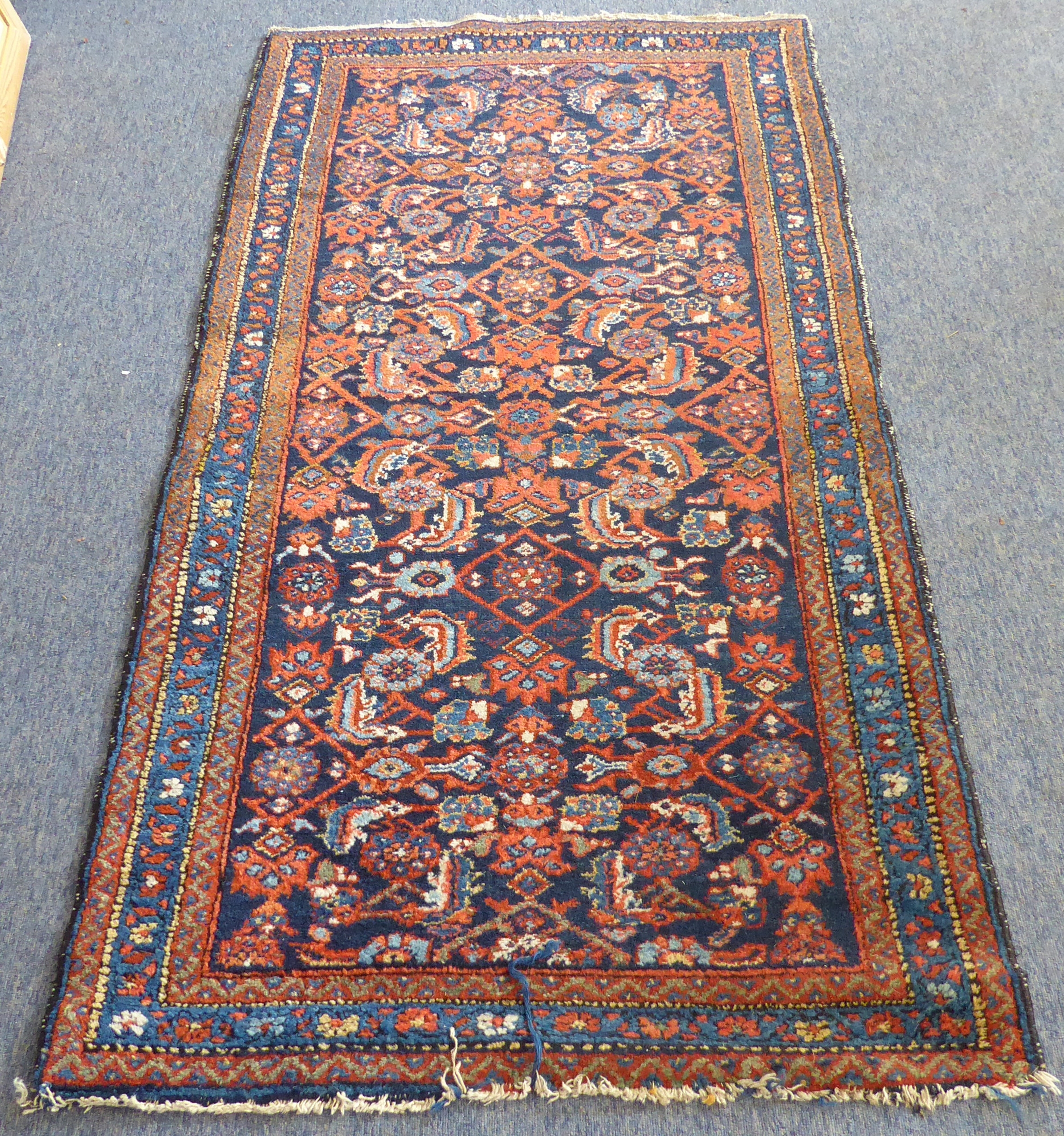 An early to mid 20th century hand-knotted carpet (possibly Turkish): cobalt-blue rectangle with varying turquoise and red stylised repeating patterns (196 x 99 cm)