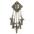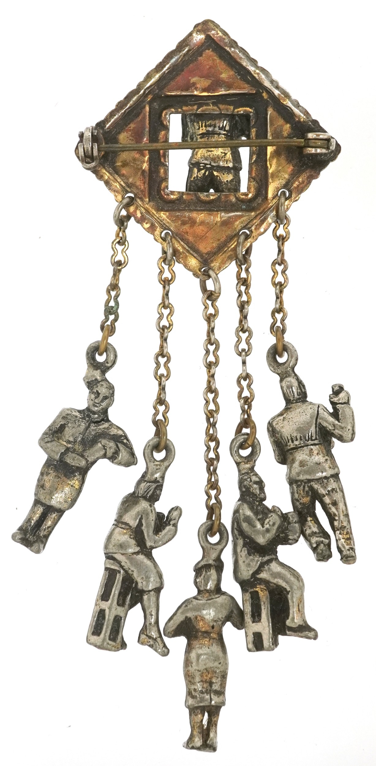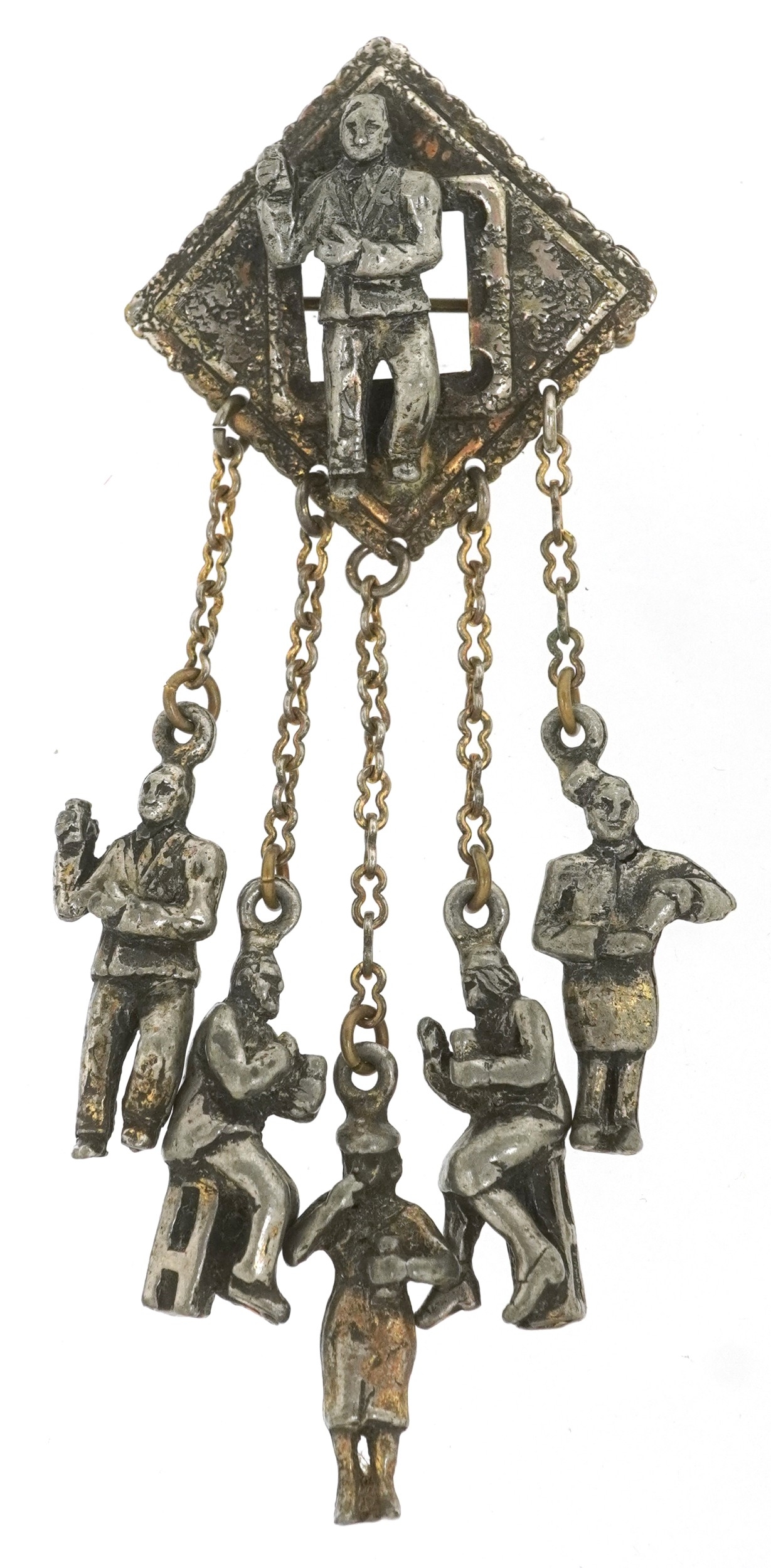 A vintage white metal dangling brooch in the form of figures at a bar bar including cocktail mixologist and figures seated on bar stools, 10cm high, 26.3g.