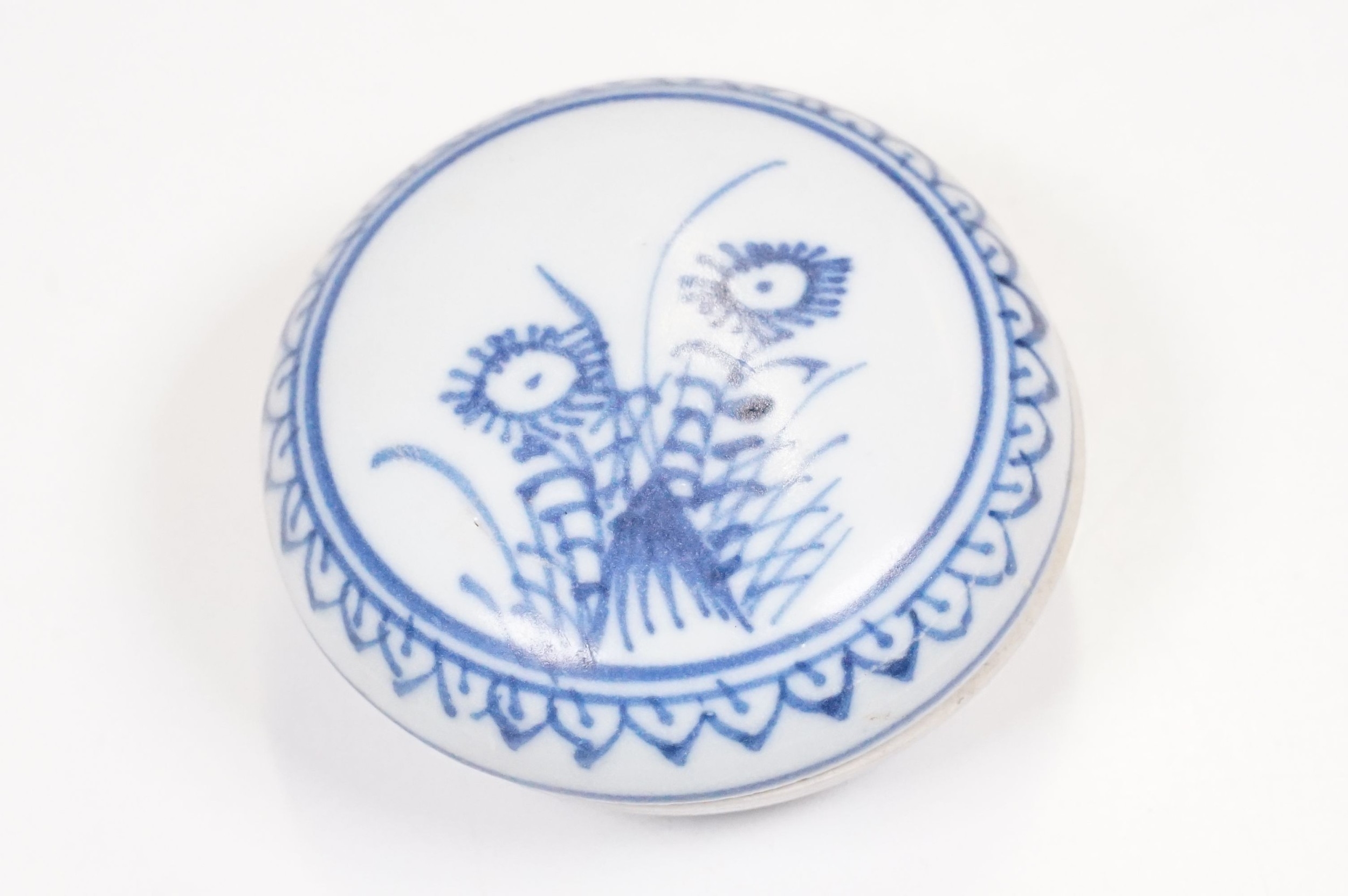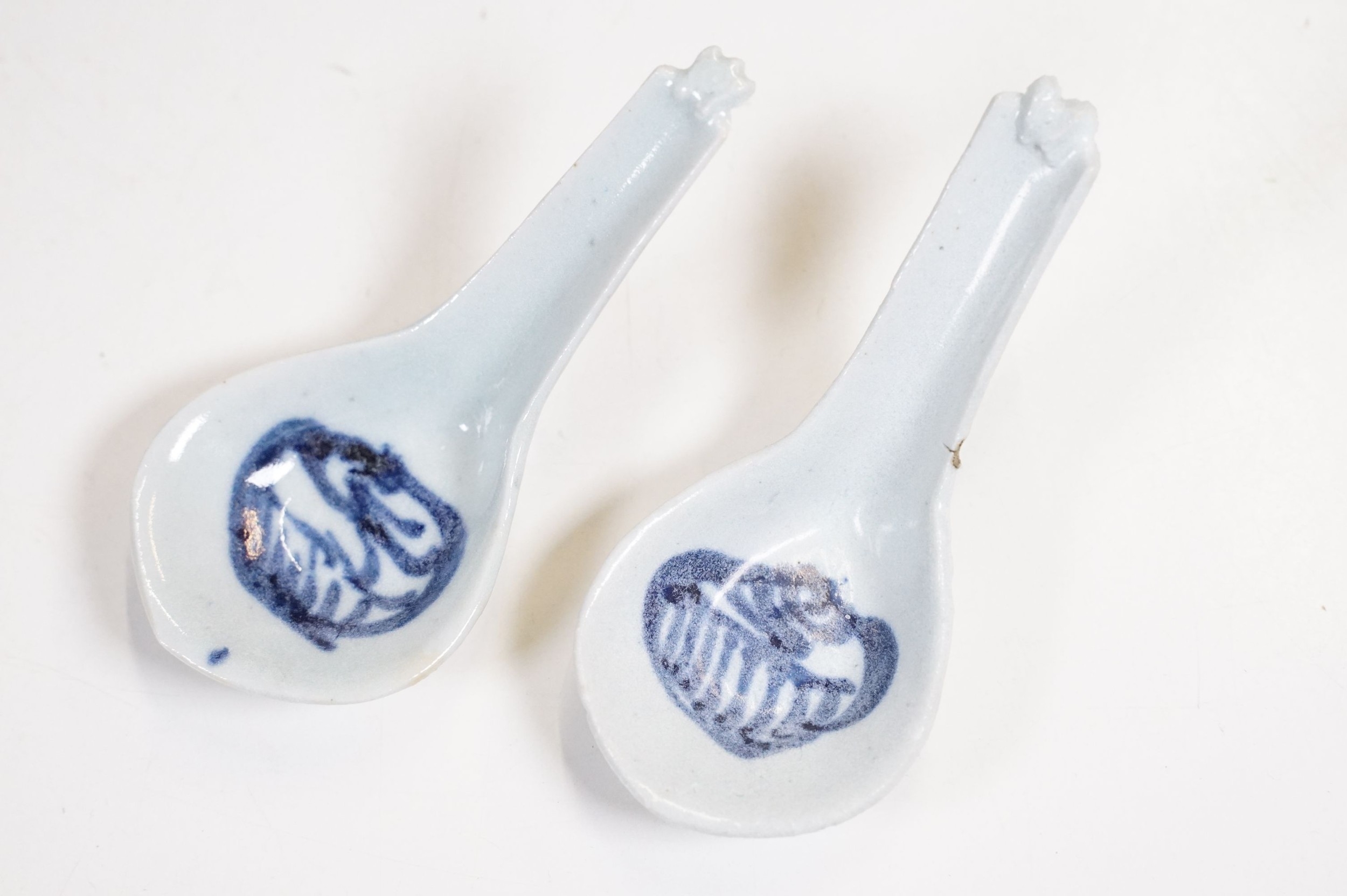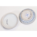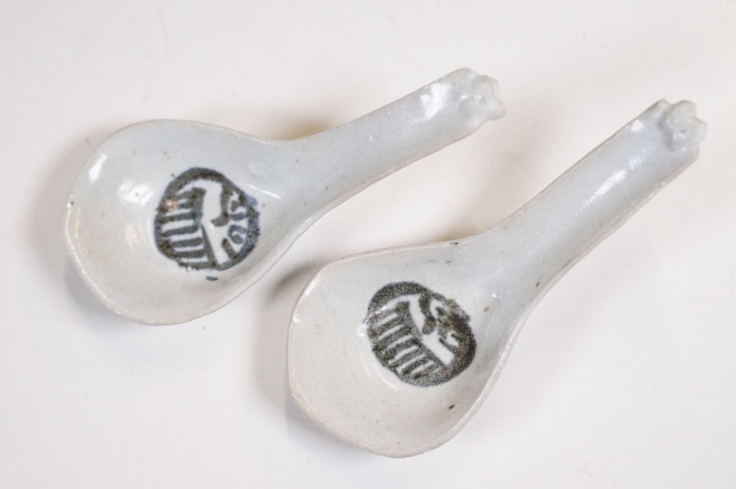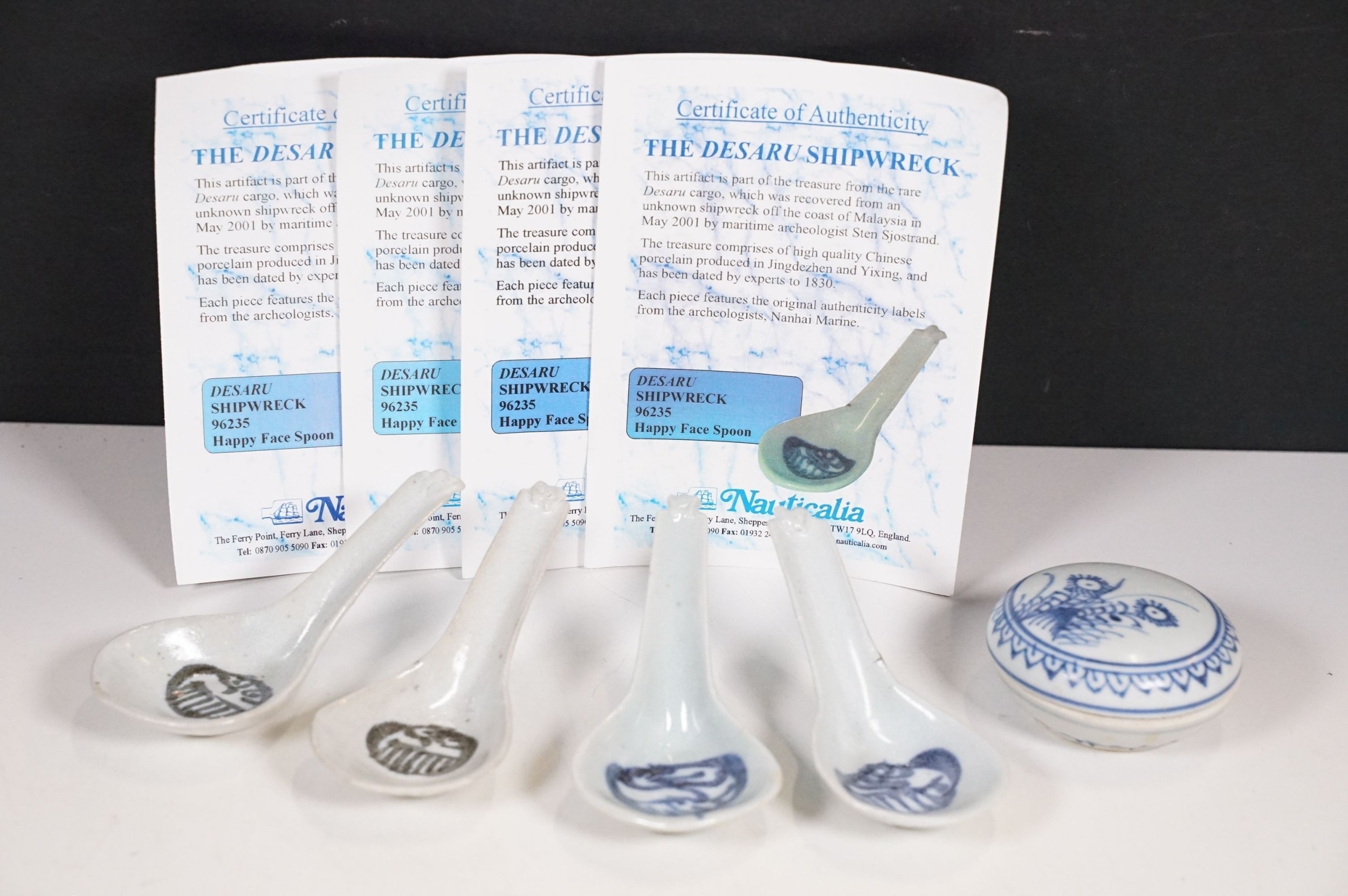Early 18th century Ca Mau shipwreck small lidded pot, diameter 6.5cm together with four 'Desaru Shipwreck' 'Happy Face' noodle spoons with COA's