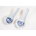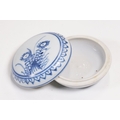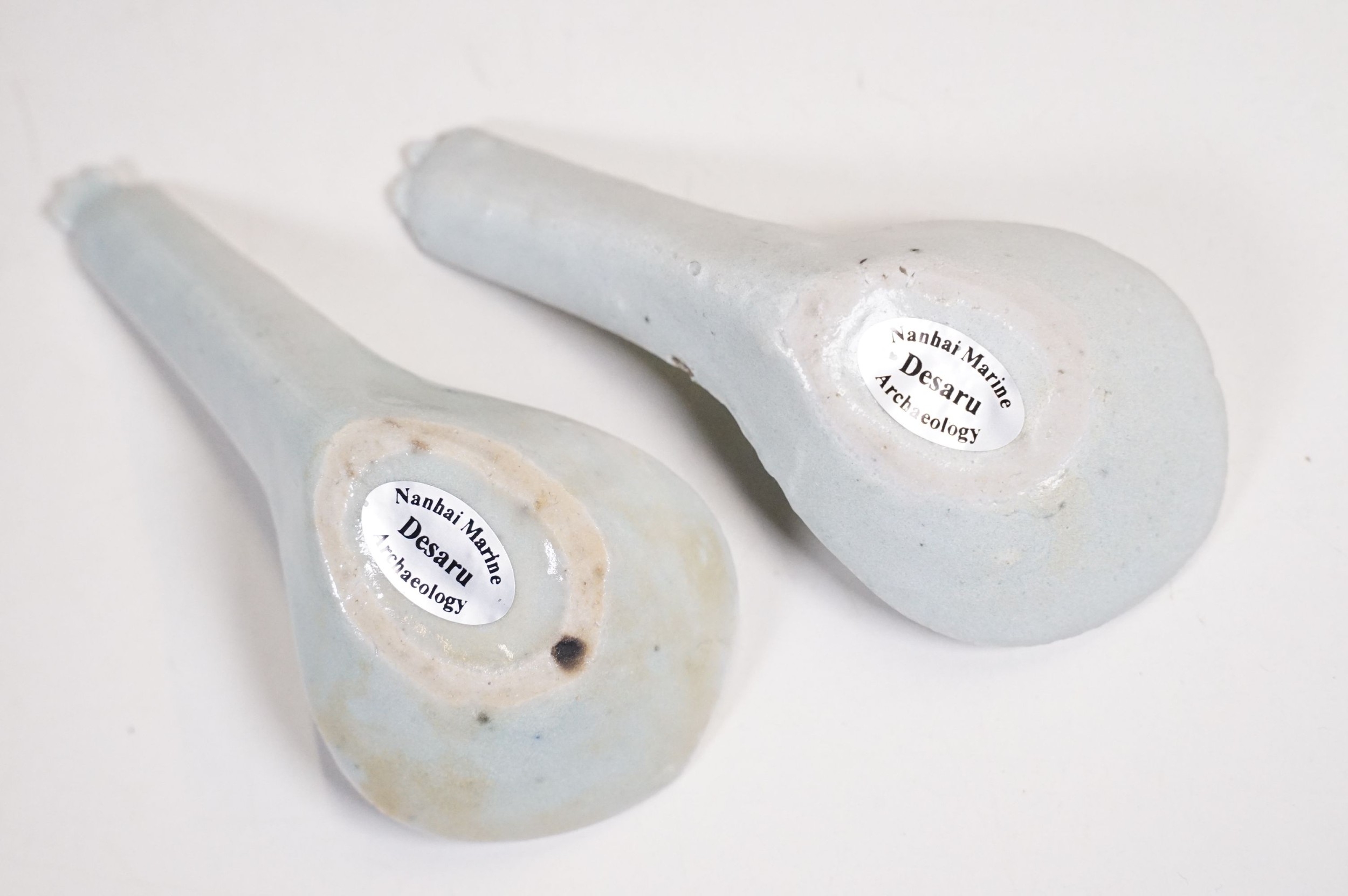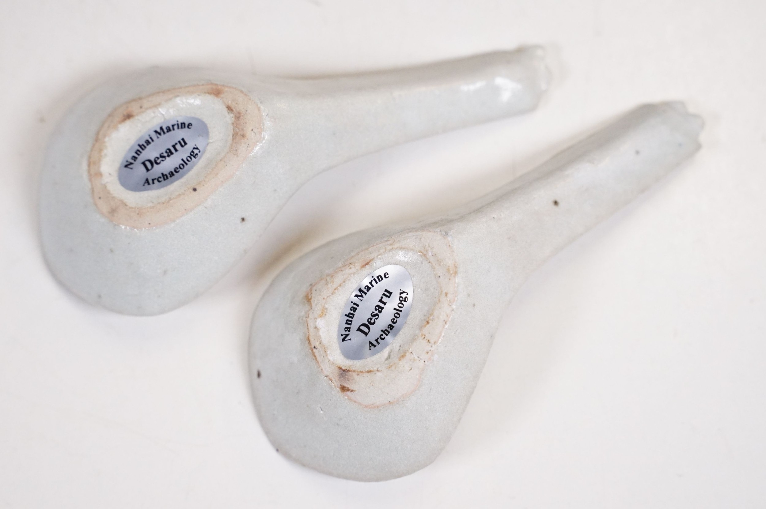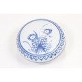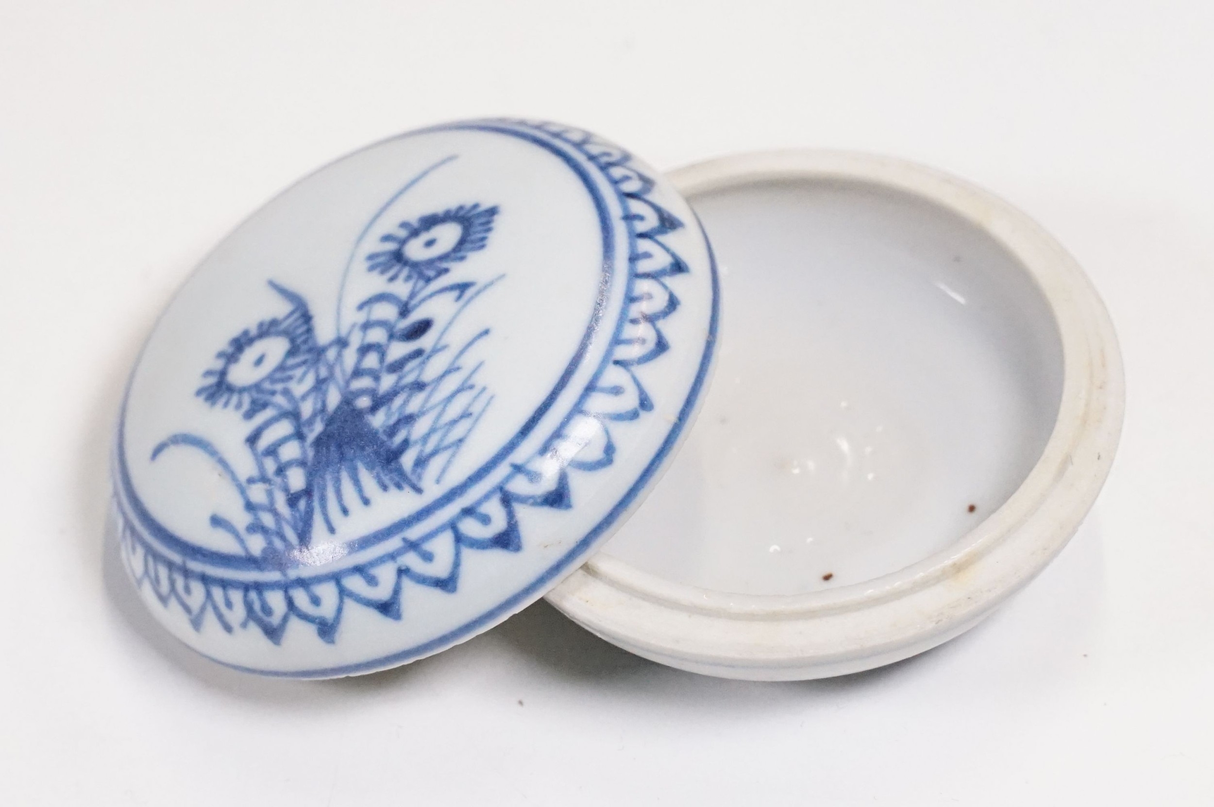 Early 18th century Ca Mau shipwreck small lidded pot, diameter 6.5cm together with four 'Desaru Shipwreck' 'Happy Face' noodle spoons with COA's