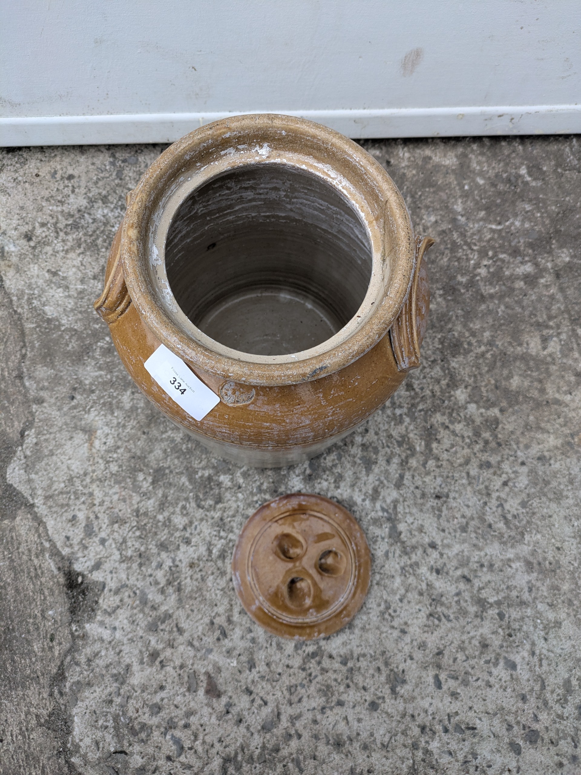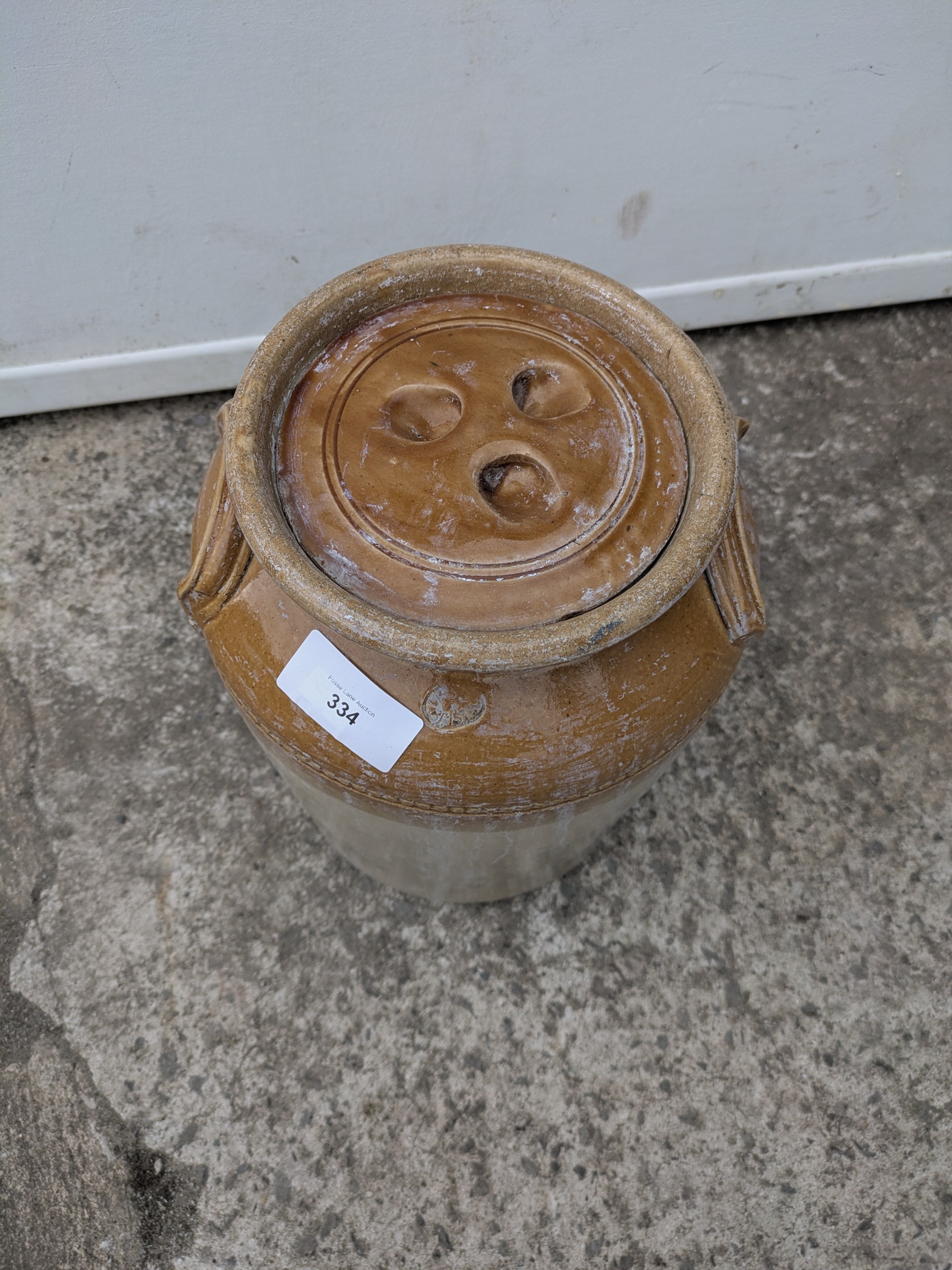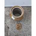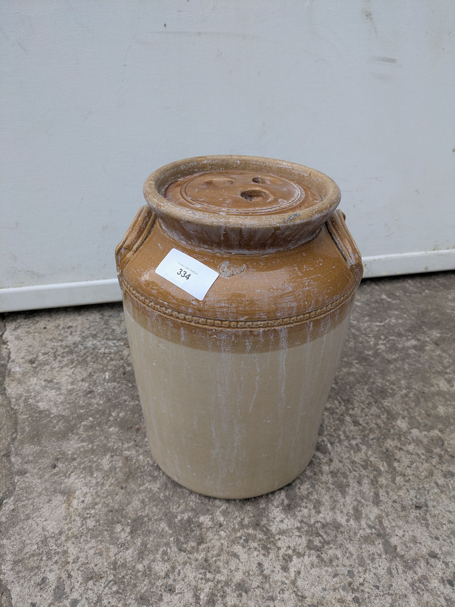 An antique stoneware jug with lid