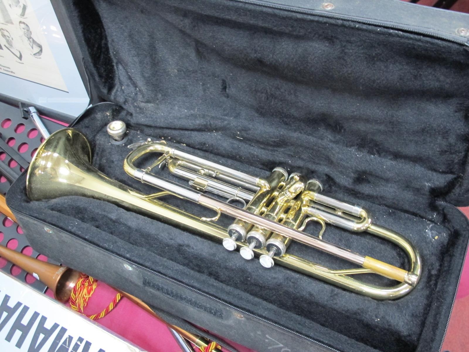 JP151 Trumpet and Mouthpiece, in case, Swaine & Adeney copper bugle plus one other. Yamaha keybourd.