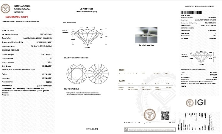 A 7.180ct Cushion Cut Lab-Grown Diamond. Colour E, clarity VS2. IGI certified. Cert no: LG713519243. Measurements: 12.53X12.57X7.53mm.