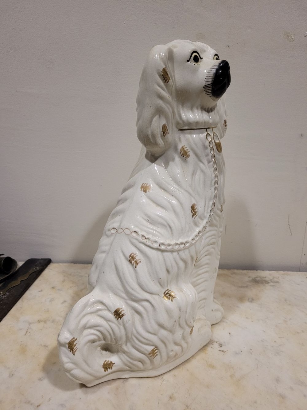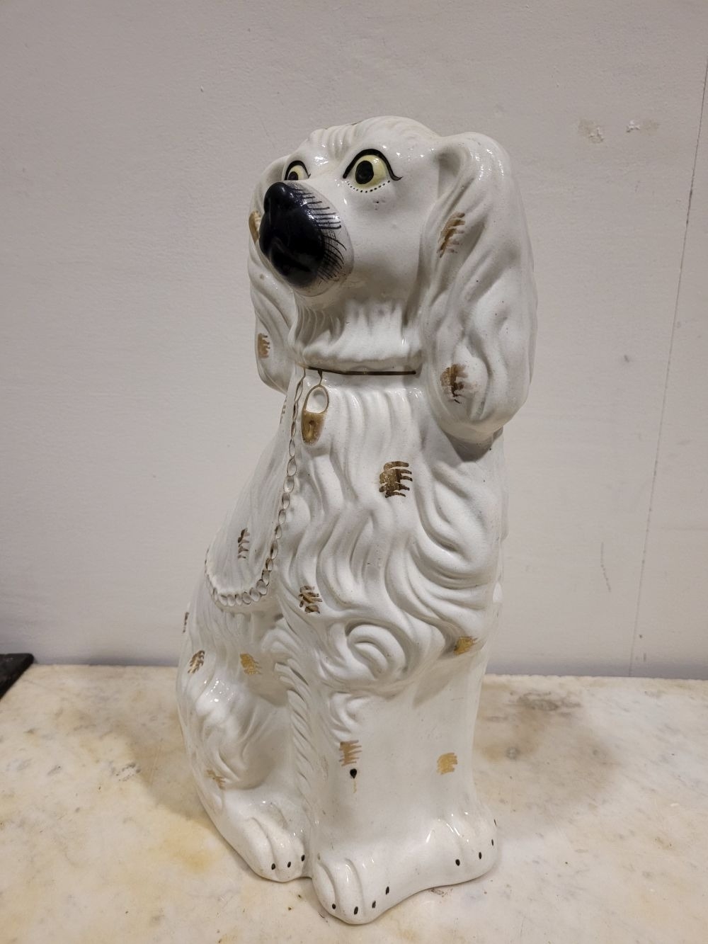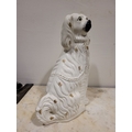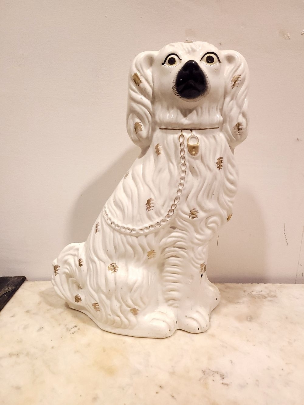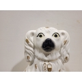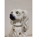 A LARGE LATE 19TH CENTURY STAFFORDSHIRE DOG ORNAMENT, the dog has gold highlights to the glazed off white body, with a padlock & chain detail, nice well-defined snout and eyes. Dimensions: 37.5cm tall.