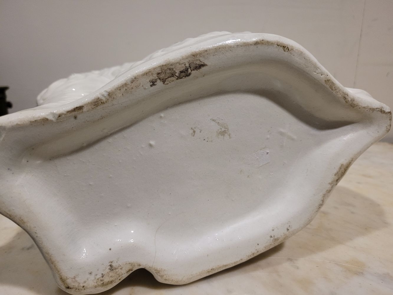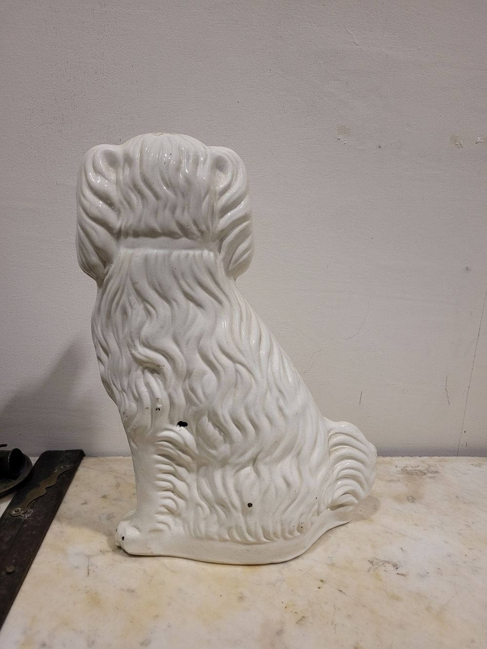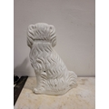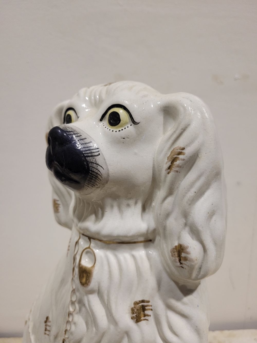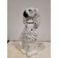 A LARGE LATE 19TH CENTURY STAFFORDSHIRE DOG ORNAMENT, the dog has gold highlights to the glazed off white body, with a padlock & chain detail, nice well-defined snout and eyes. Dimensions: 37.5cm tall.