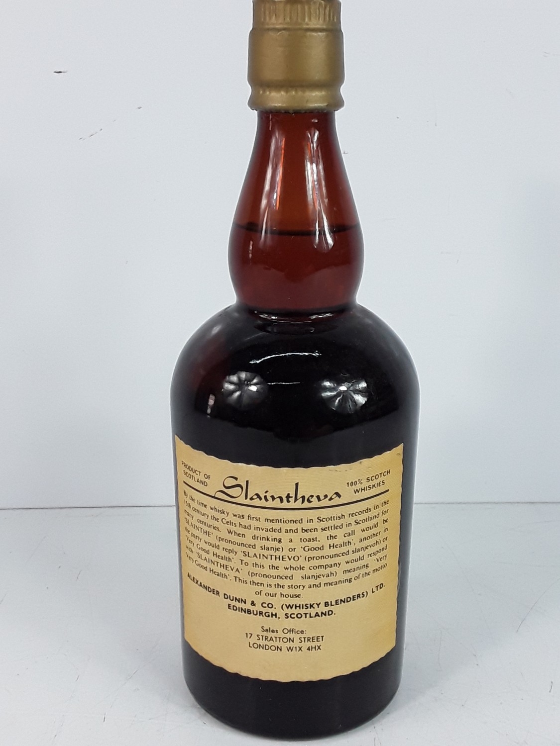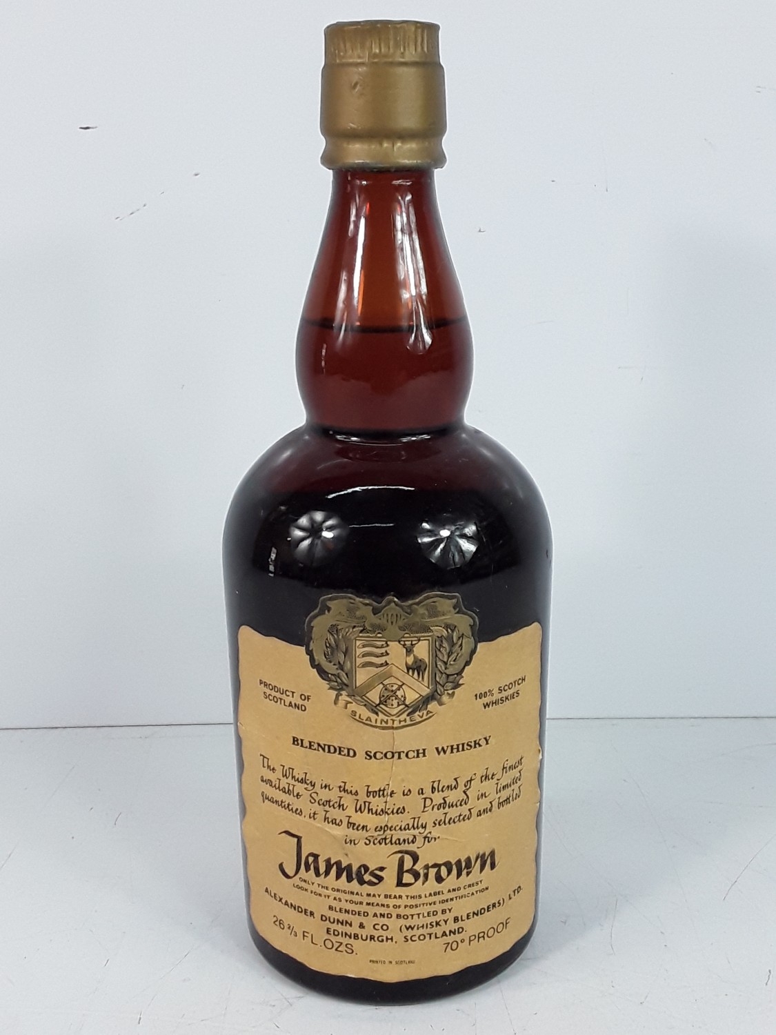 Bottle of Alexander Dunn selected and bottled for James Brown, 26 2/3 fl.ozs, 70% proof,1980's