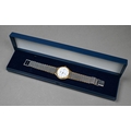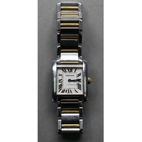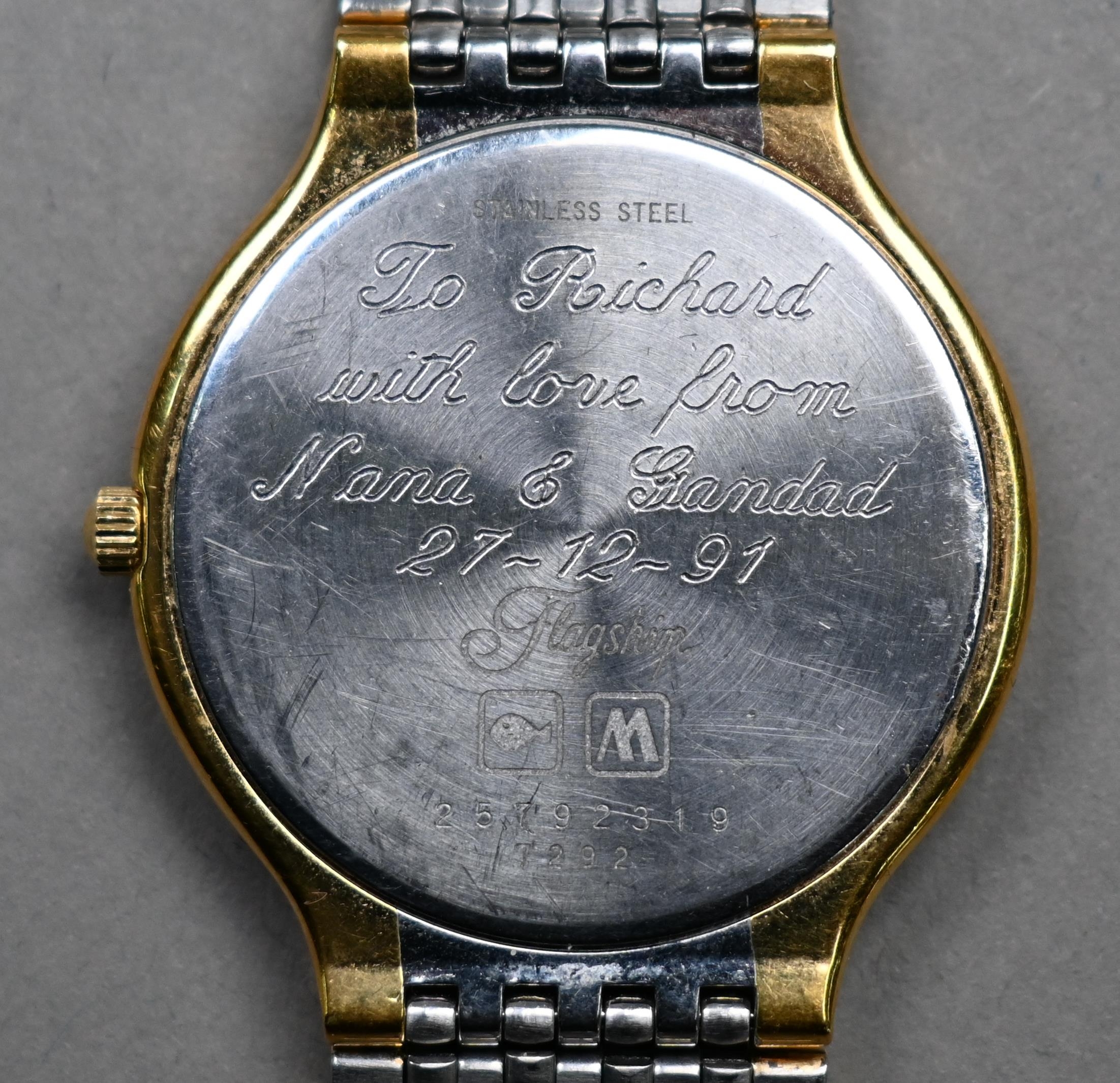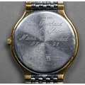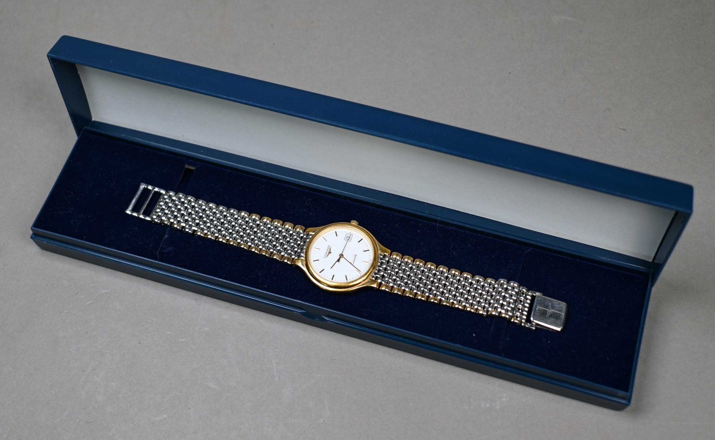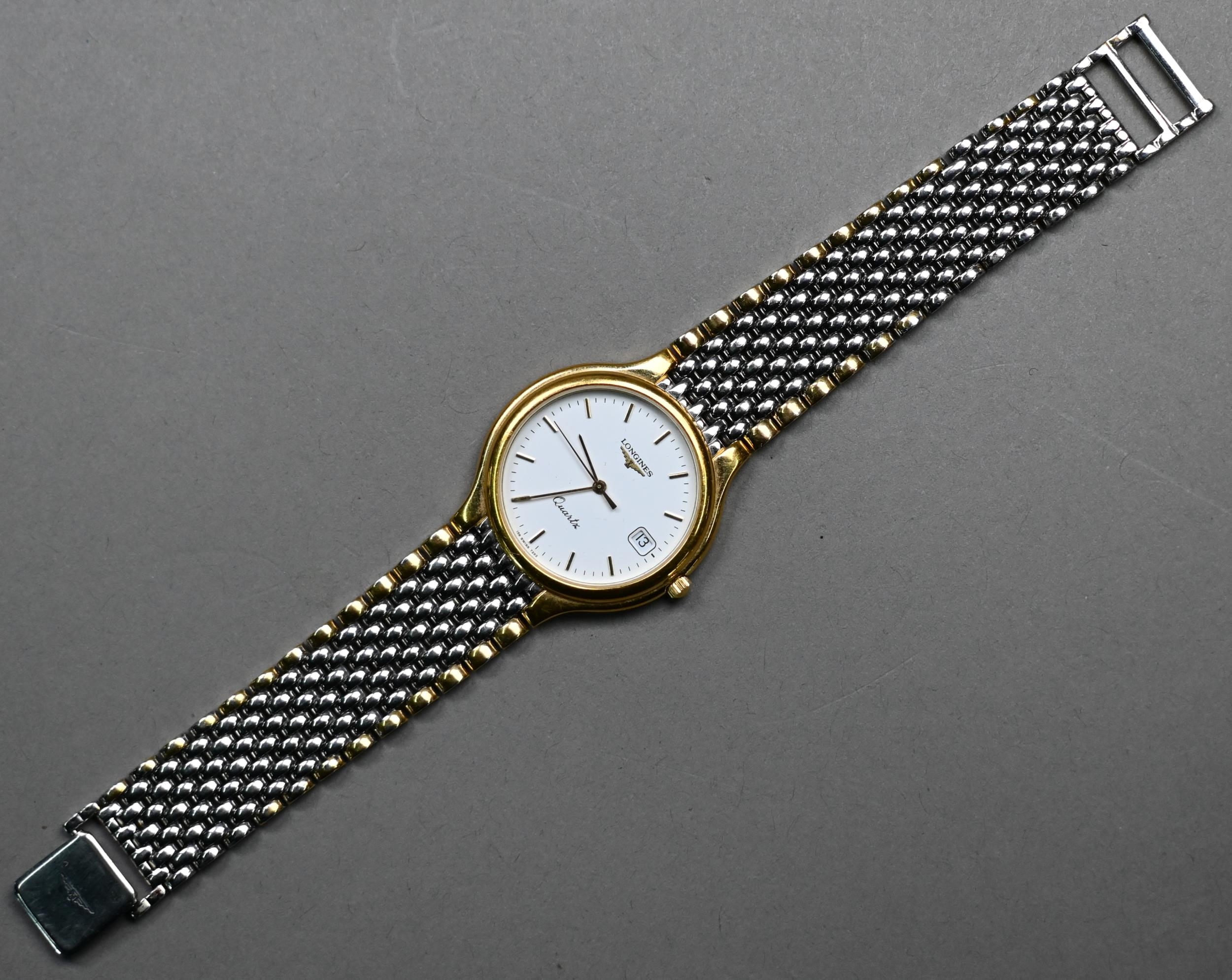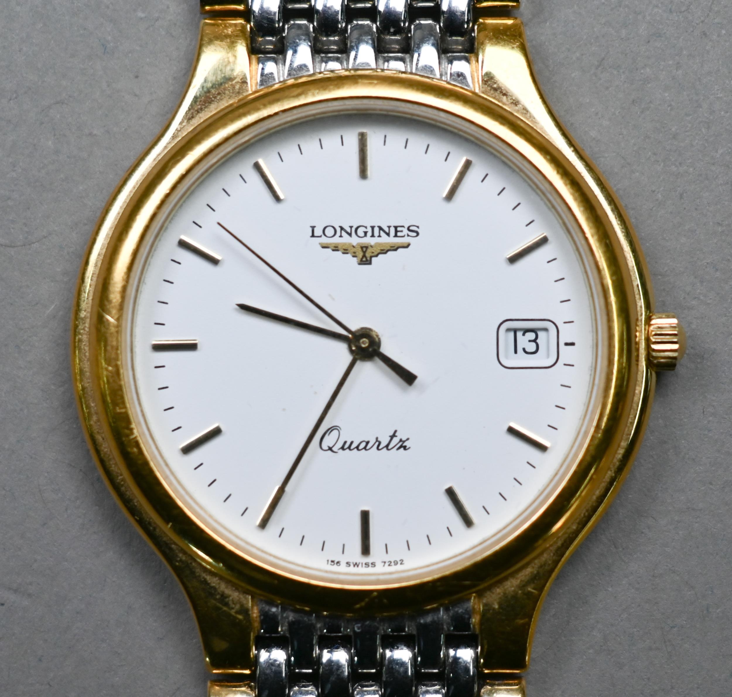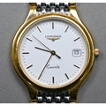 A gents Longines stainless steel and gilt metal cased wristwatch, the quartz movement white dial with date aperture and baton markers, on an integral bracelet, quartz watch