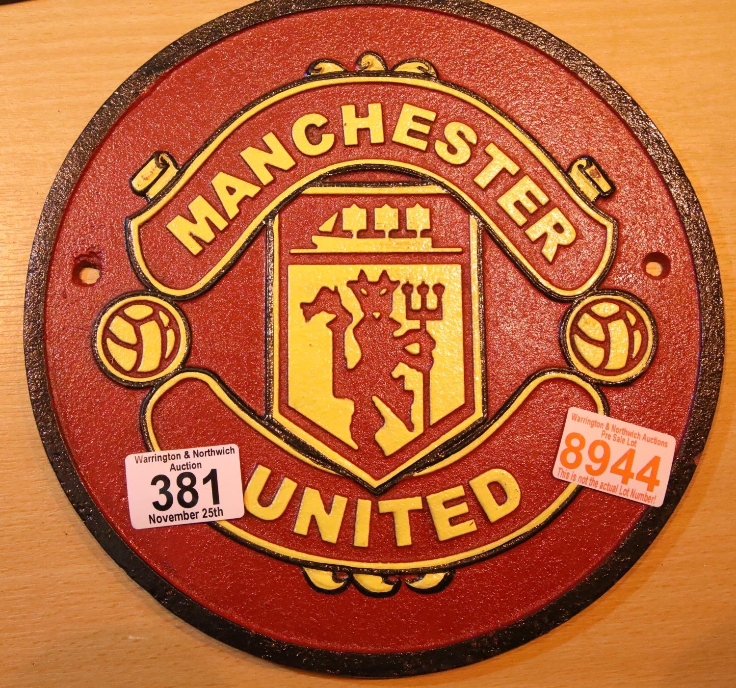 Cast iron Manchester United sign, D: 24 cm. P&P Group 1 (£14+VAT for the first lot and £1+VAT for subsequent lots)