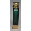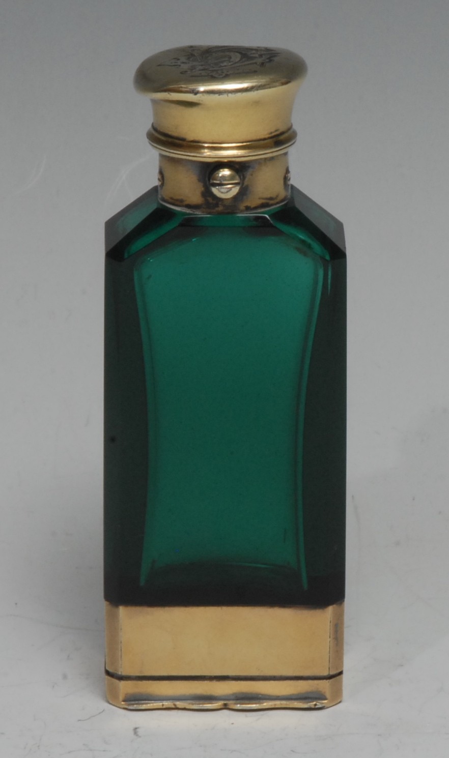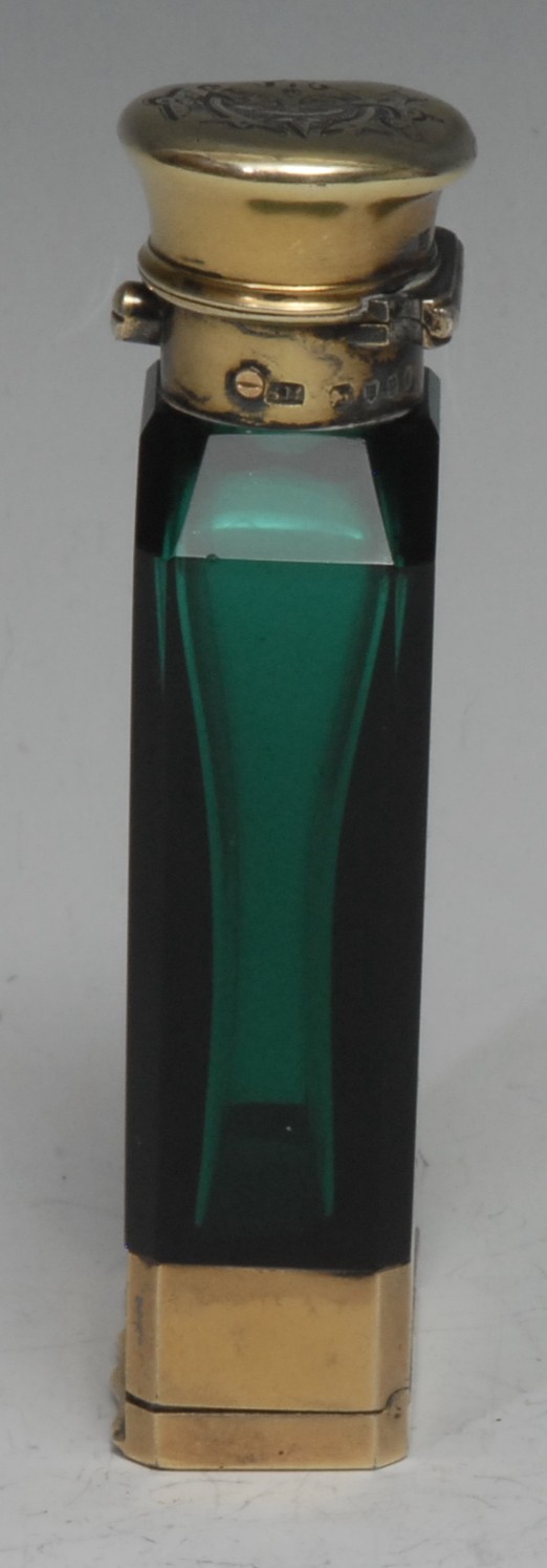 A Victorian silver-gilt mounted emerald glass novelty combination scent bottle and vinaigrette, sprung hinged cap, cover to base enclosing a pierced grille, 9.5cm long, Sampson Mordan & Co, London 1870