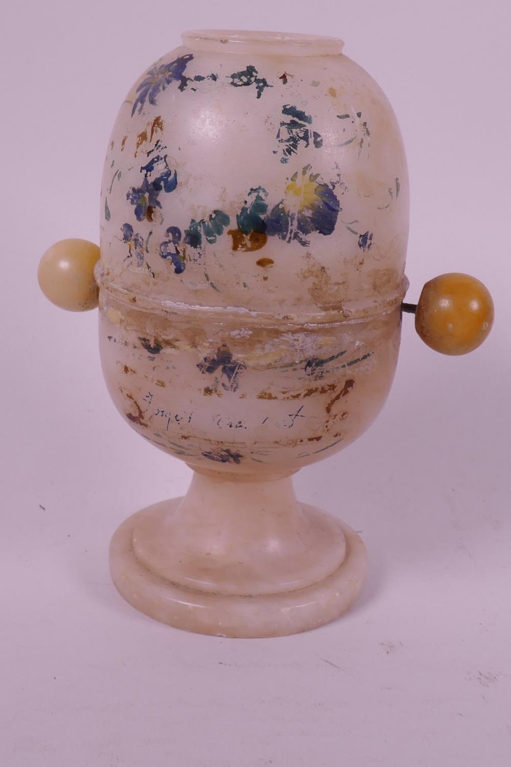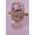 An alabaster 'egg' Stanhope viewer showing views and details of the completion of the first Thames Tunnel in 1843, together with views of various mineral specimens, 5" high