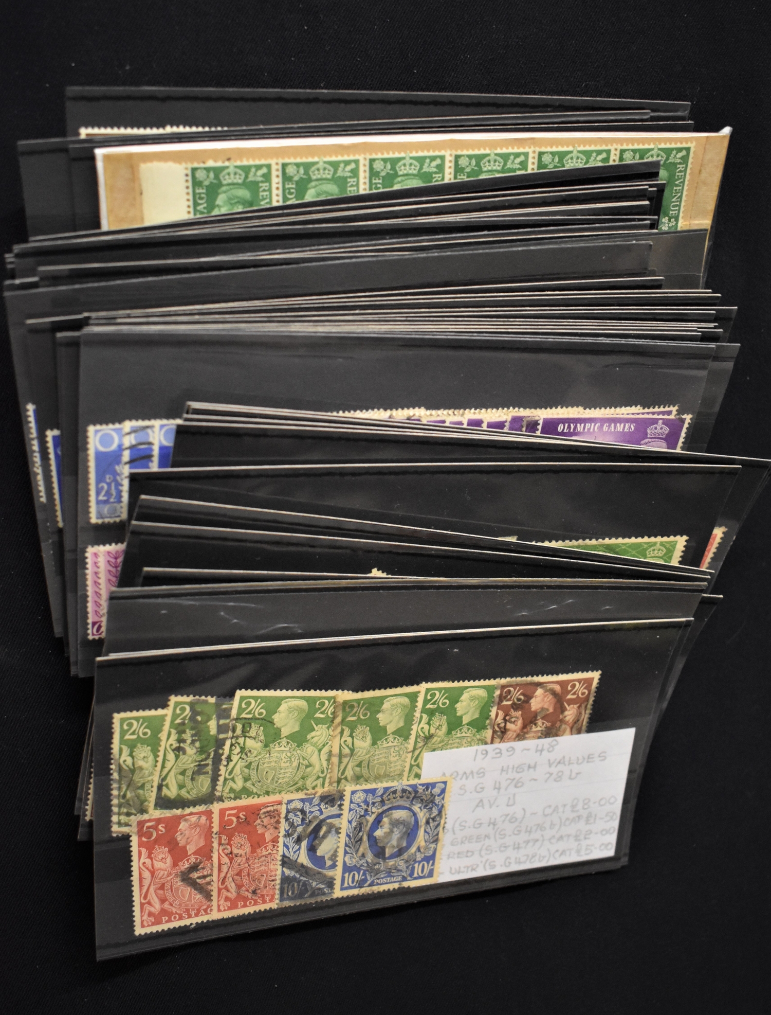 Great Britain - A useful stock on black cards, many in small quantities, KGV photogravre wmk inverted, 1 1/2d's used sorted by formats, KGVI including: 1851 2/6, 5/- 10/- (25+), £1 (8) 1939-48 to 10/- (2) used and mint definitives and commemoratives to 1948 (100's)