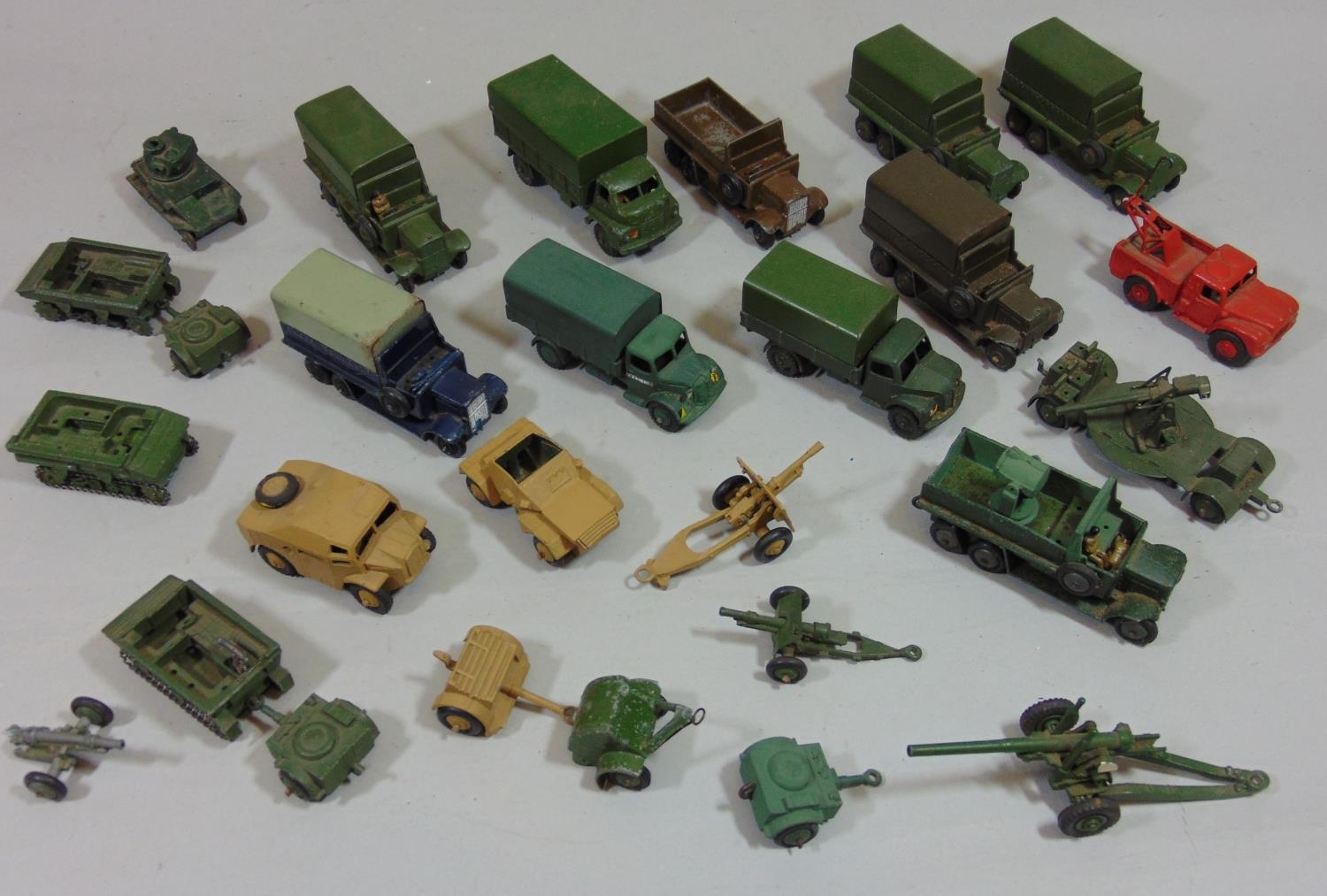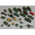 collection of Dinky miilitary vehicles including 688 Field Artillery tractor, 673 scout car, 8 covered wagons etc
